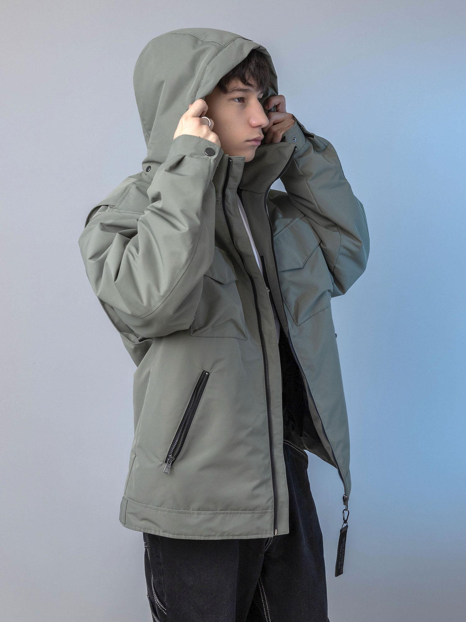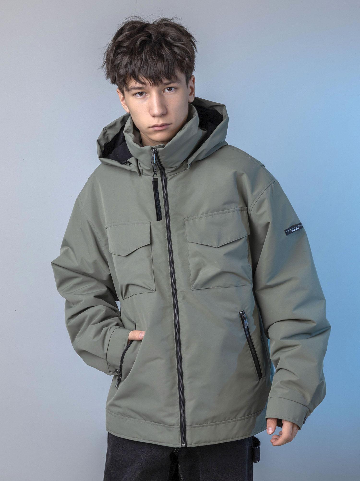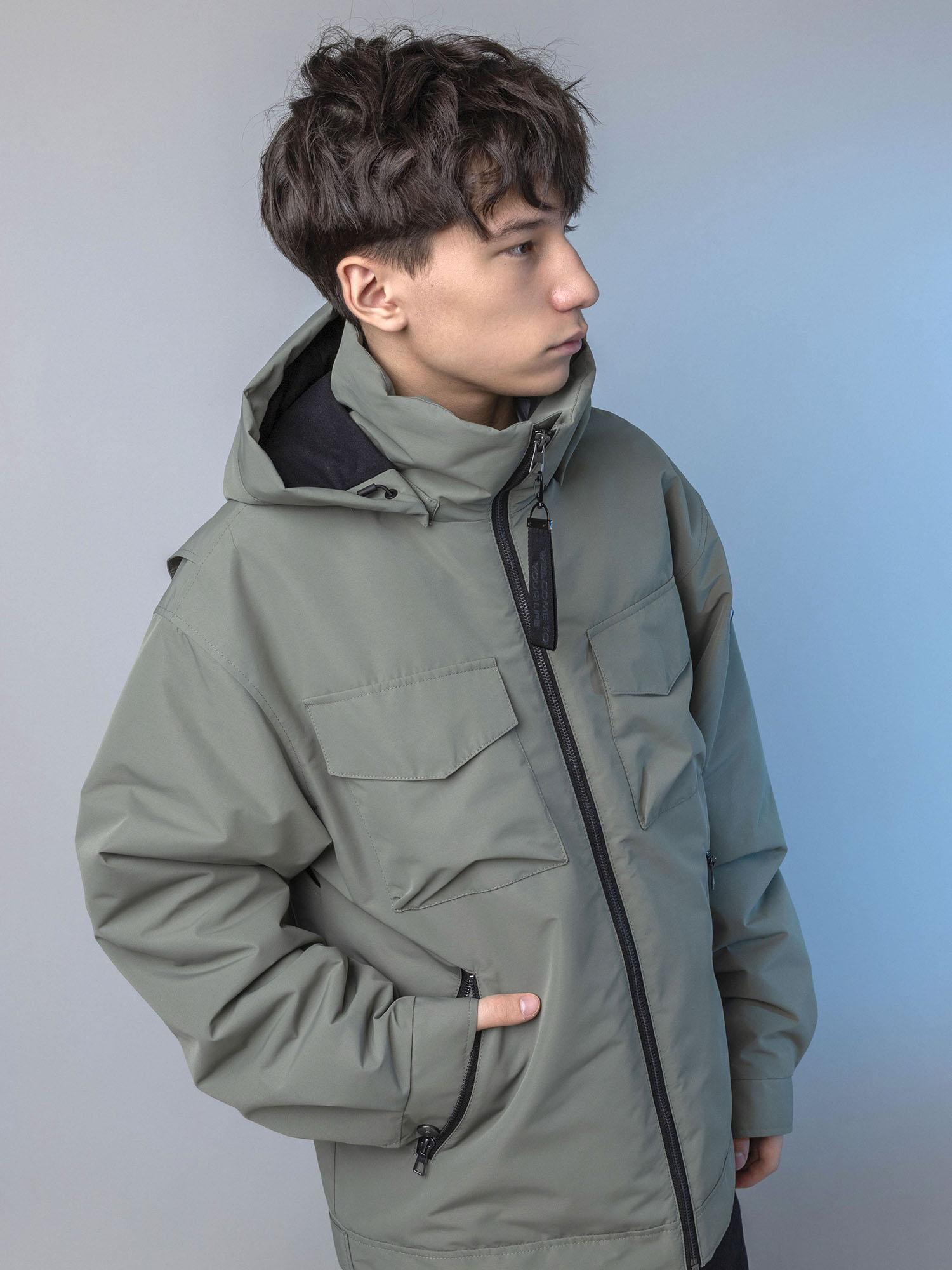 Центральная металлическая молния с внутренней ветрозащитной планкой. Воротник-стойка сохраняет тепло. Нагрудные накладные карманы с клапаном на магните и удобные боковые карманы на молнии. Спинка с отлетными кокетками по пройме. Объёмные рукава с манжетой и регулировкой ширины на кнопках. Боковые паты на спинке для регулировки ширины. Съёмный капюшон с регулировкой по внутреннему лицевому краю.