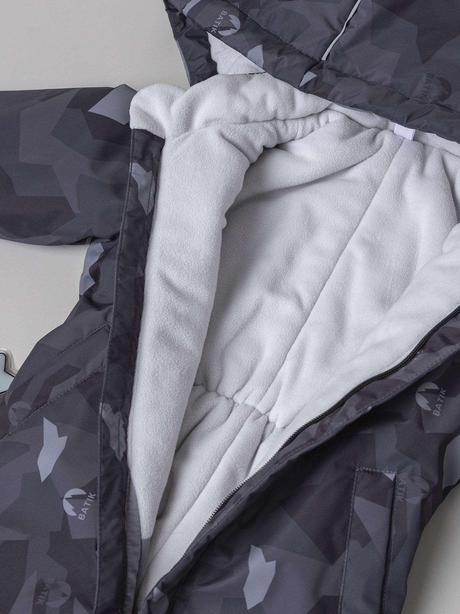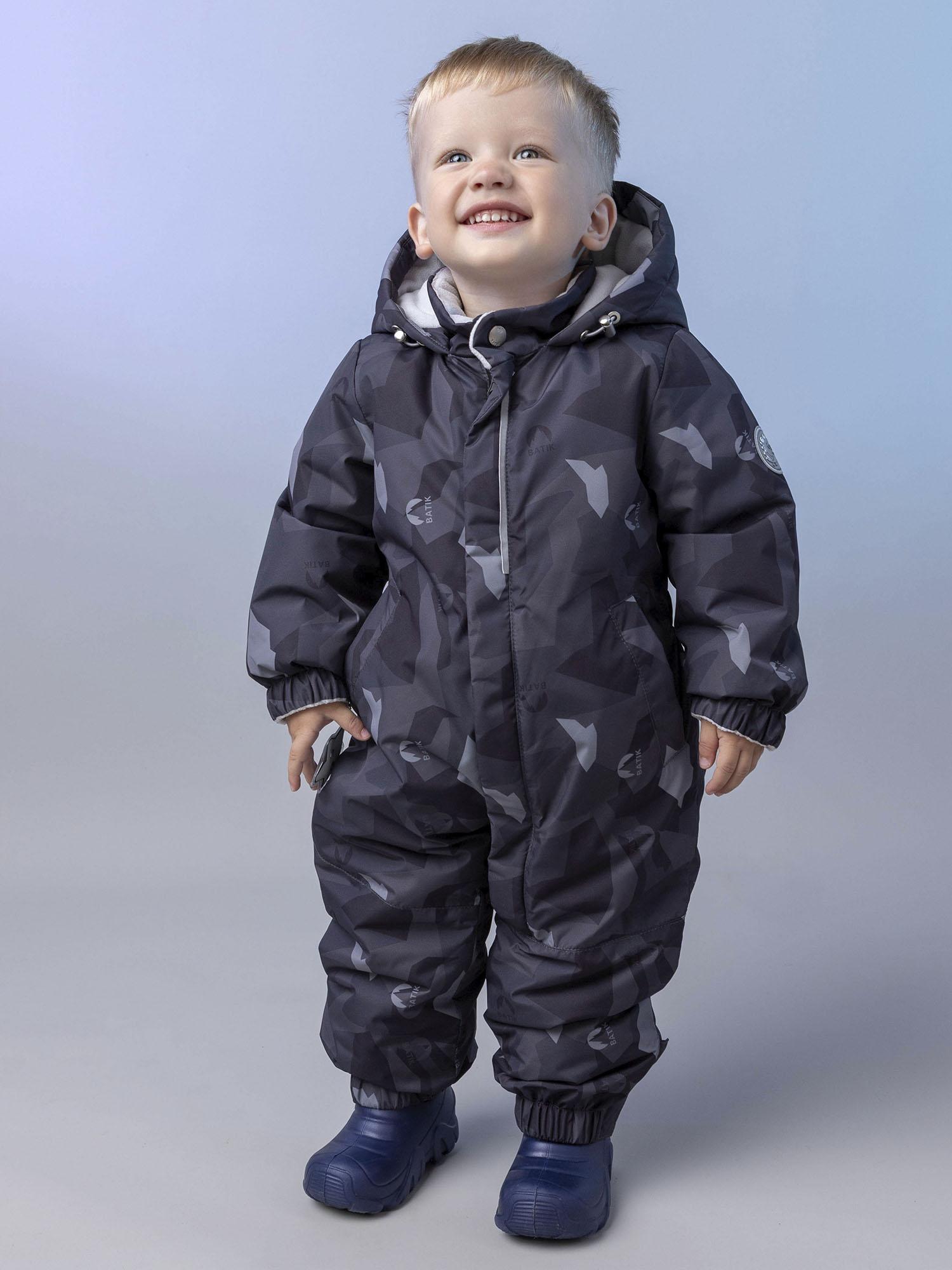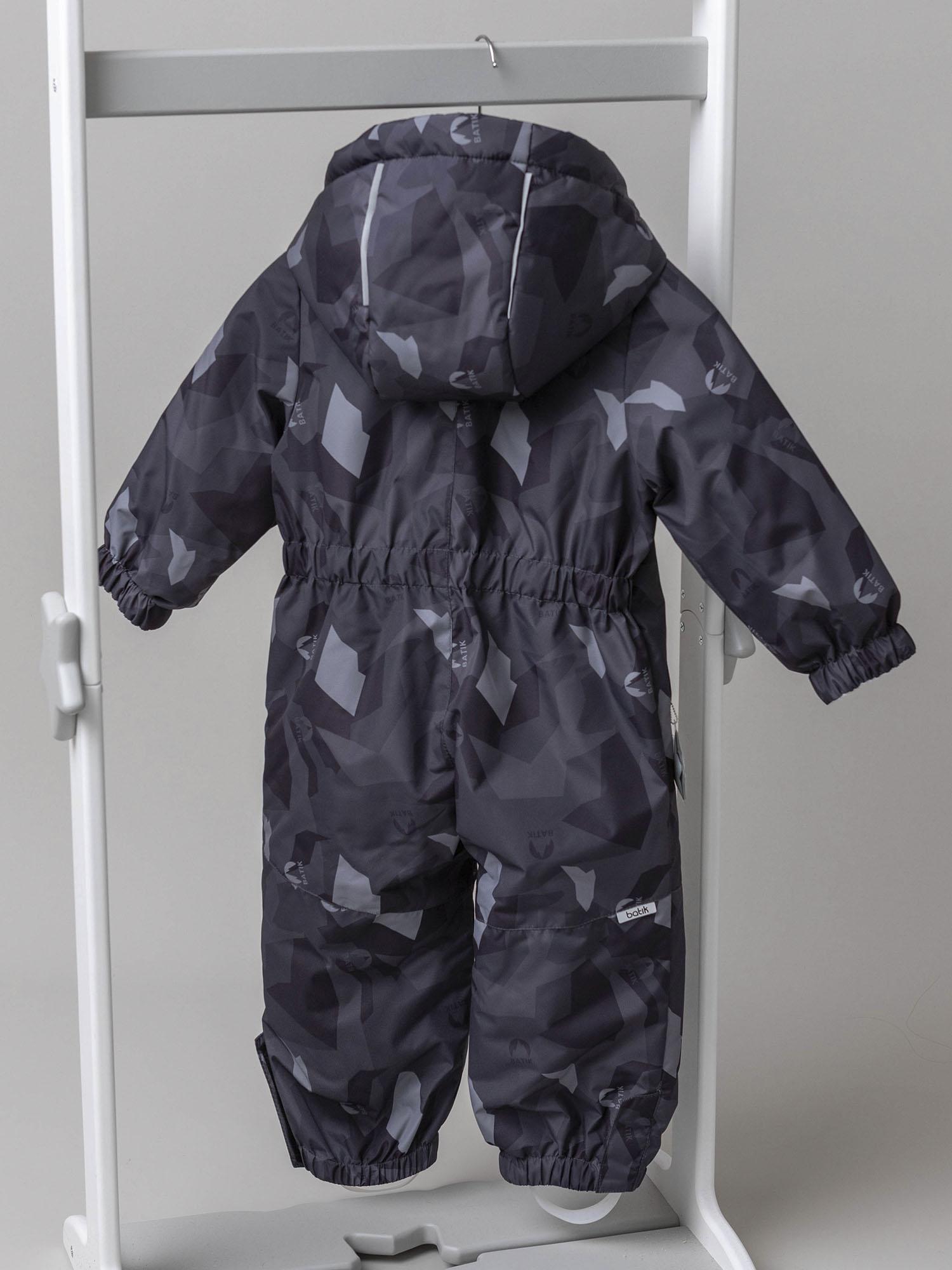 Мягкая подкладка из ворсового трикотажа в капюшоне и верхней части изделия дарит уют, а гладкая нижняя часть облегчает надевание и снятие комбинезона. Эргономичный крой обеспечивает свободу движений и отличную посадку. Длинная молния, смещённая в ножку, делает модель особенно удобной в использовании, а продуманная система защиты от поддува повышает комфорт в ветреную погоду.