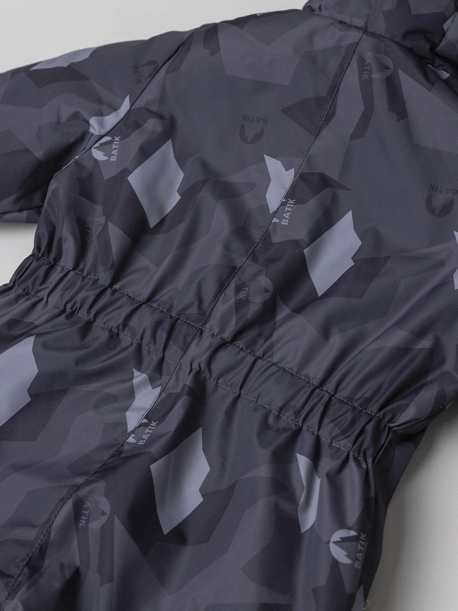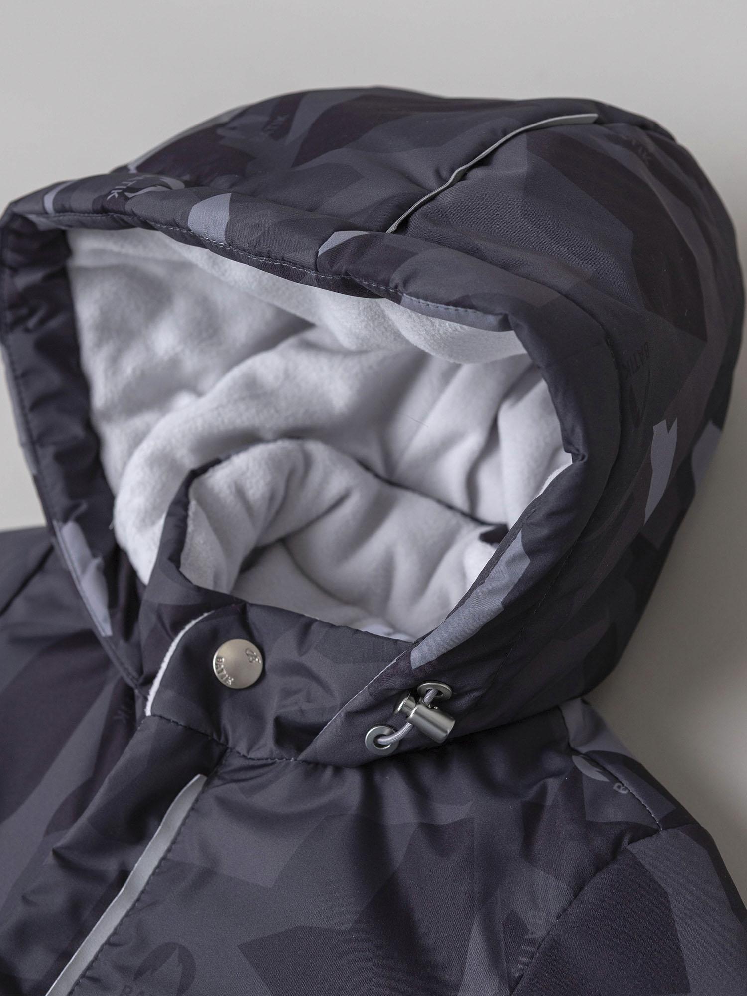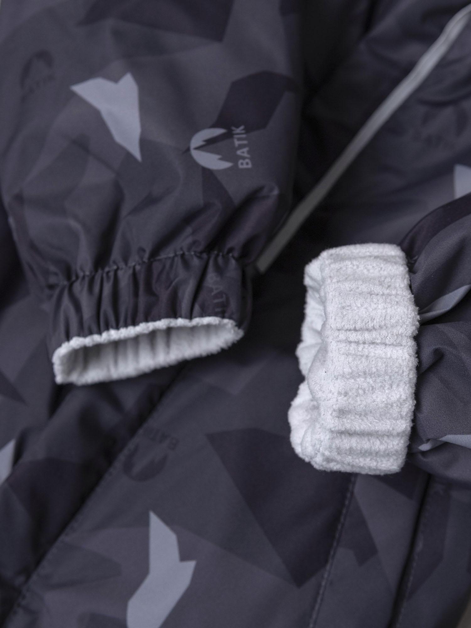 Мягкая подкладка из ворсового трикотажа в капюшоне и верхней части изделия дарит уют, а гладкая нижняя часть облегчает надевание и снятие комбинезона. Эргономичный крой обеспечивает свободу движений и отличную посадку. Длинная молния, смещённая в ножку, делает модель особенно удобной в использовании, а продуманная система защиты от поддува повышает комфорт в ветреную погоду.
