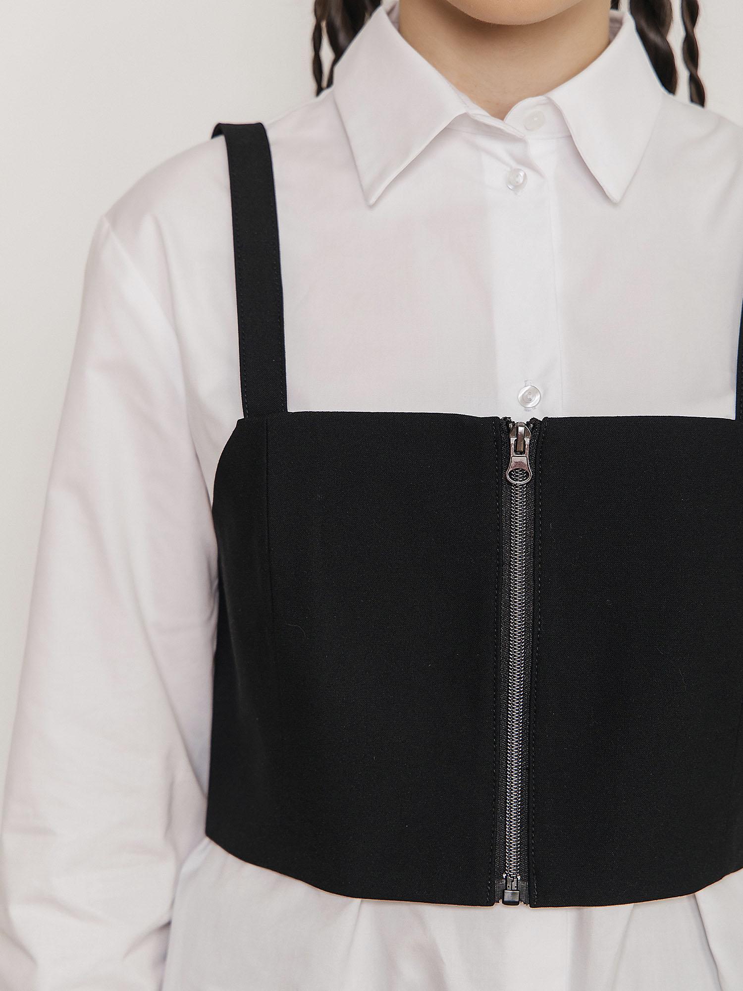 Классическая блузка голубого цвета из сорочечной ткани с длинным рукавом. Застежка на петли-пуговицы. Съемный элемент - топ из костюмной ткани на подкладе с тонкими бретелями на регулировке. У топа резинка по спине и застежка на молнию.