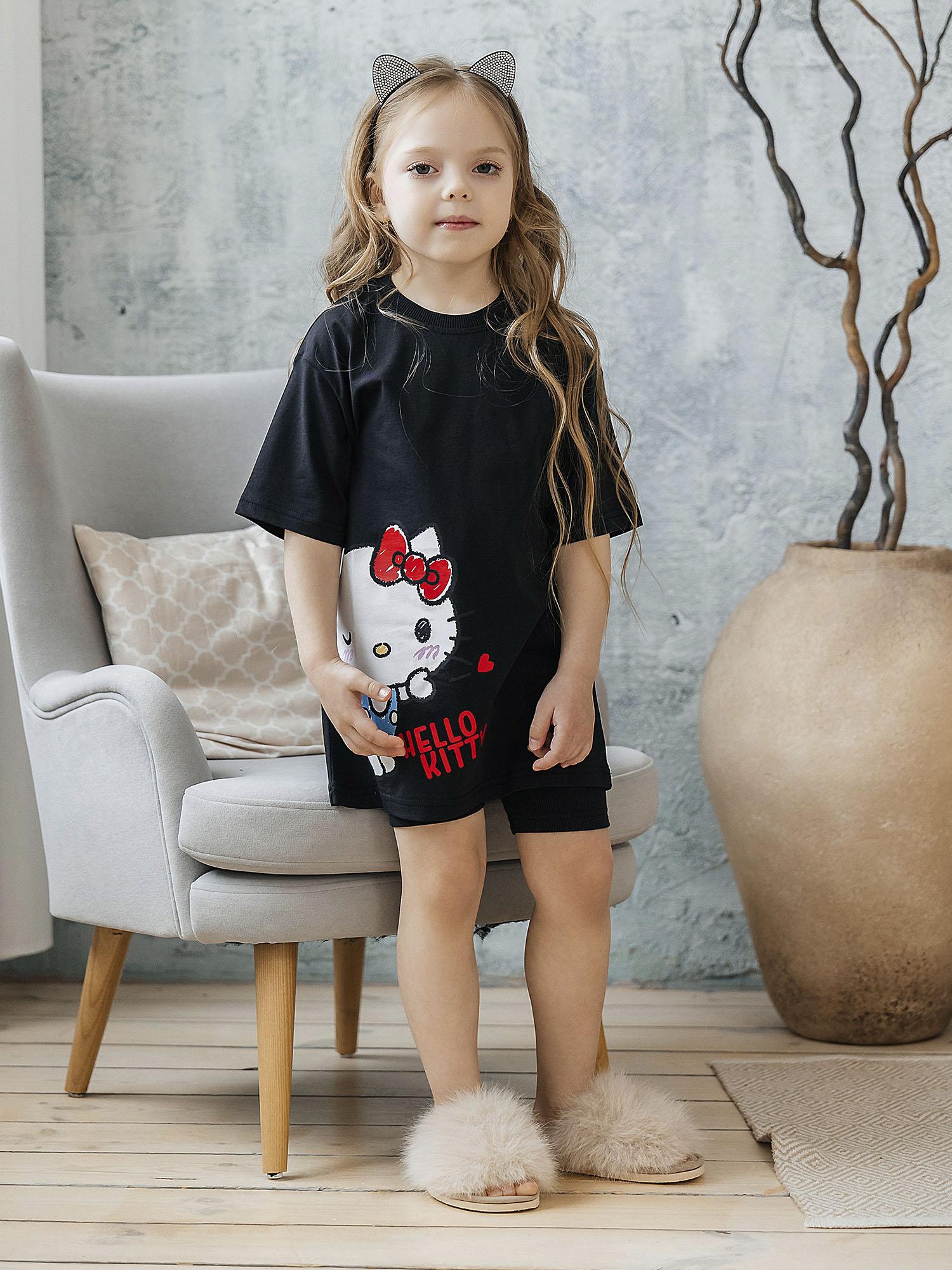 Комплект (футболка кор.рукав и велосипедки) выполнен из 100% хлопка. Мягкий, эластичный и приятный к телу материал обеспечивает комфорт в течение дня. Цвет — черный.