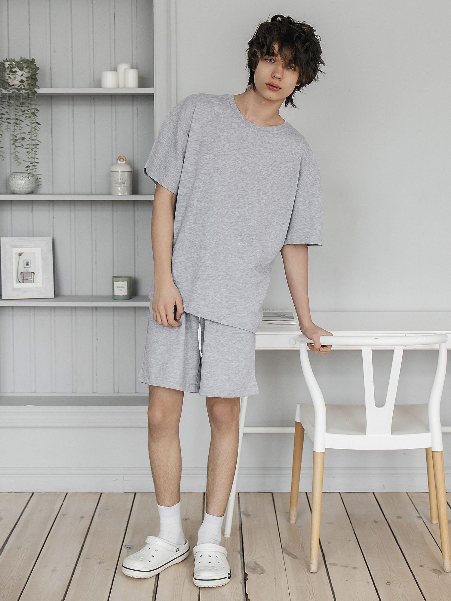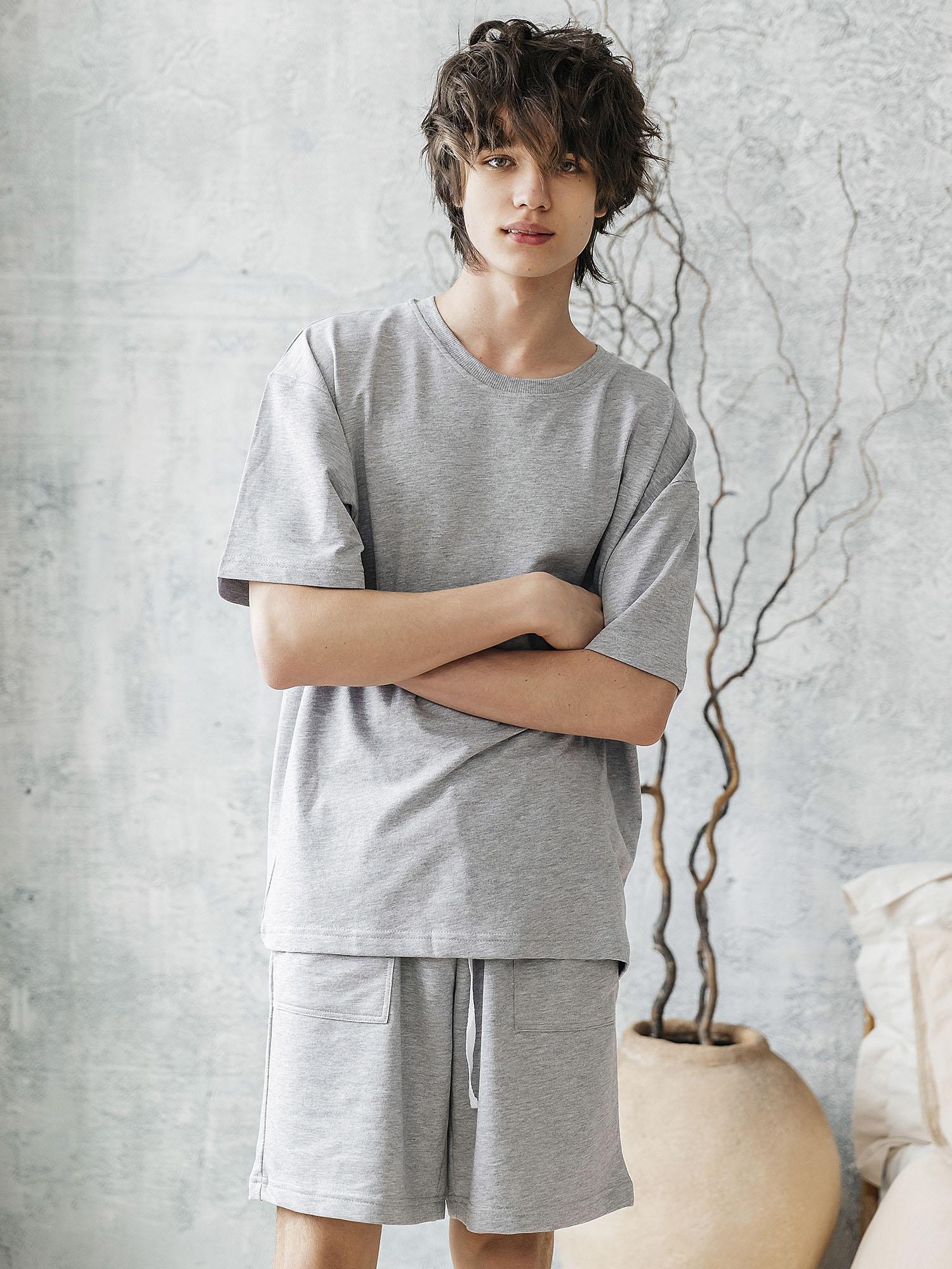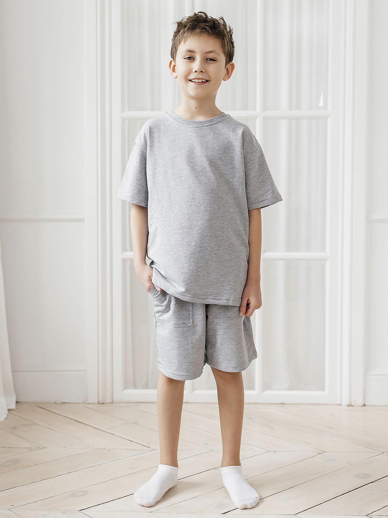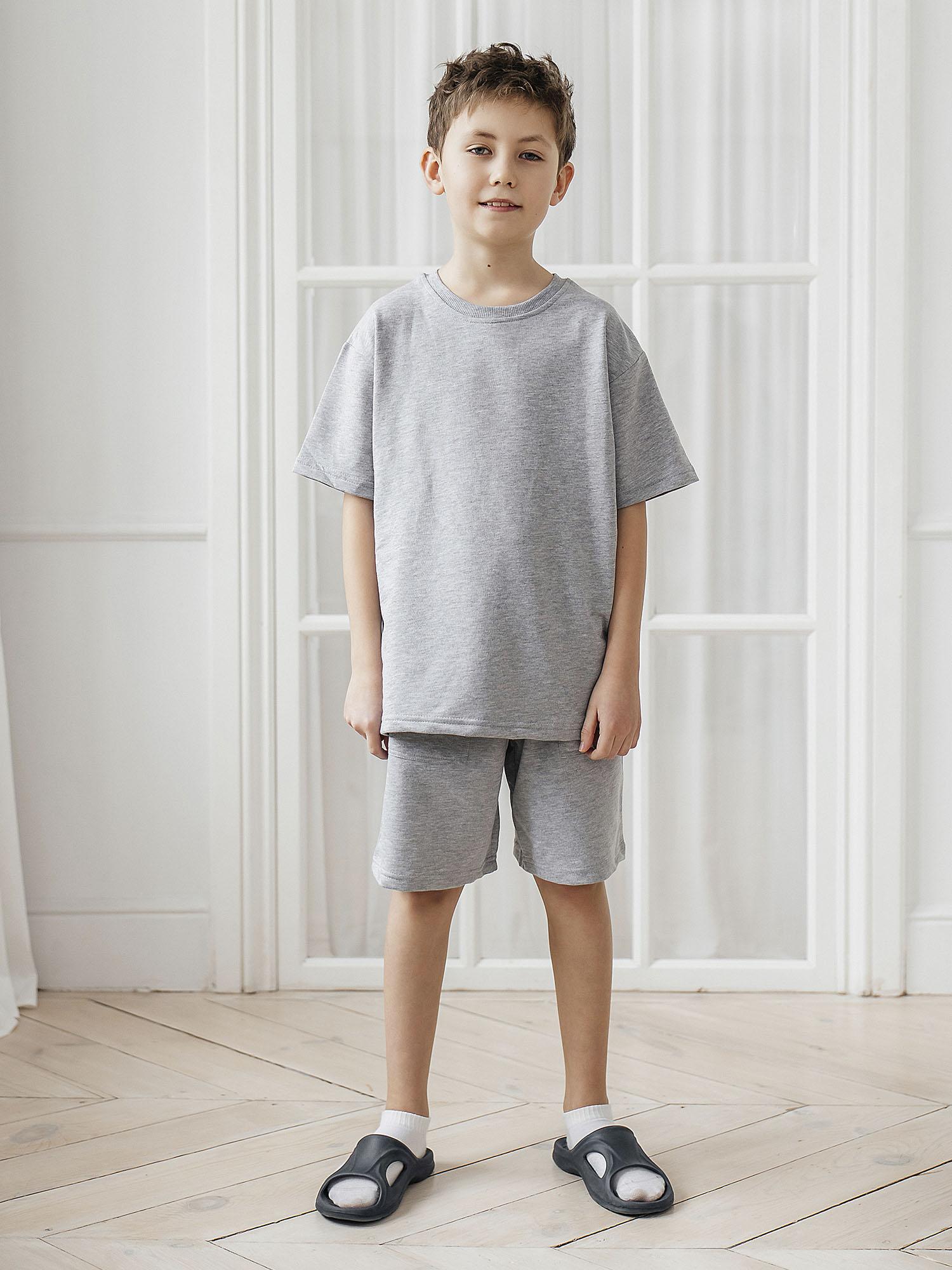 Комплект футболка кор рукав, шорты из серого меланжа футер 2х нитка, свободный крой, утяжка по талии (на шортах) при помощи шнурка, накладные карманы, прекрасно подходит как в качестве домашнего комплекта, так и для летних прогулок и занятий спортом
