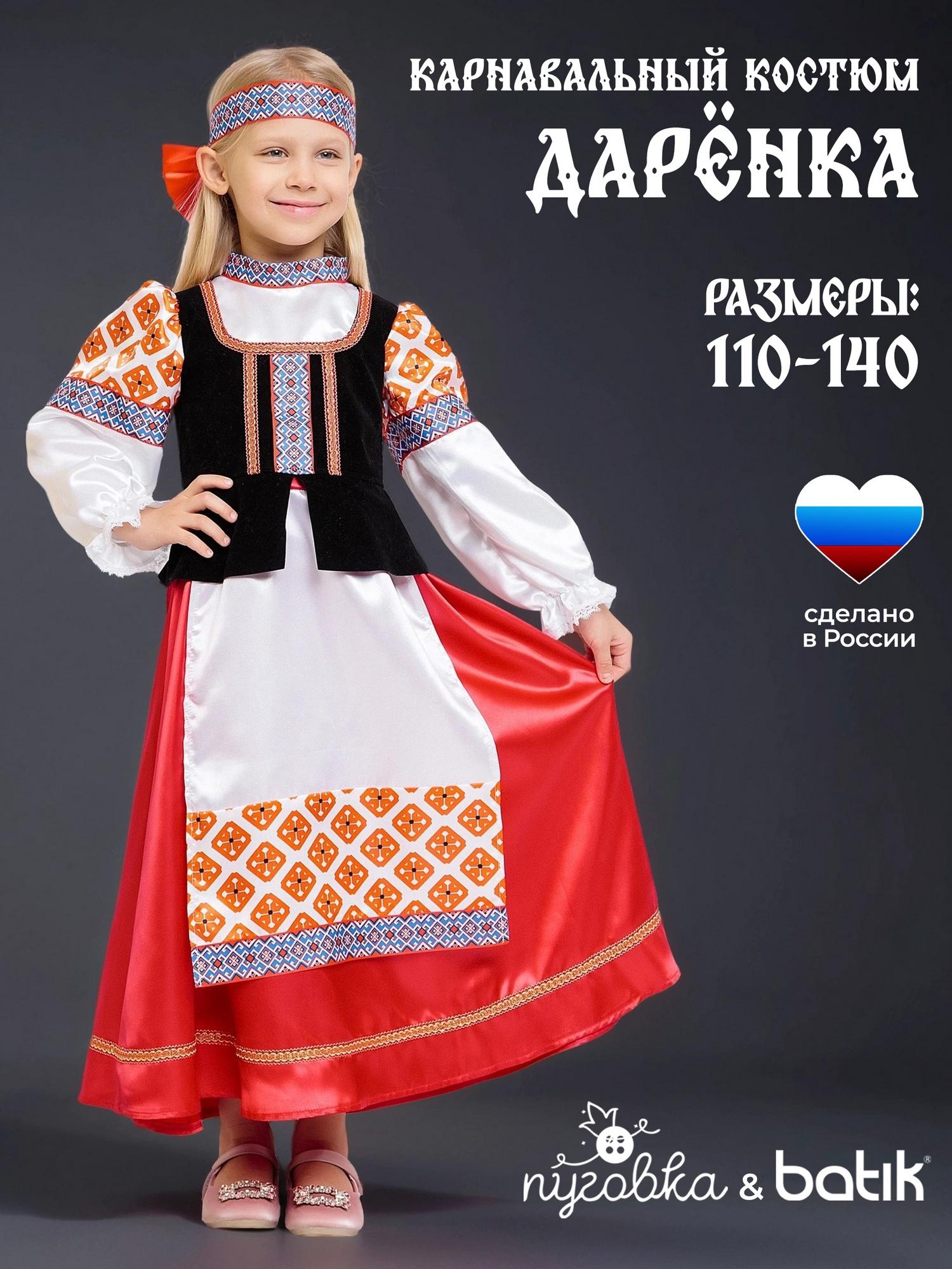 Карнавальный костюм для девочки Дарёнка - красивый образ в народном стиле для выступлений и утренников. В комплекте блузка с длинными рукавами, длинная юбка и повязка с орнаментом. Блузка с вшитой черной жилеткой и узорами. Юбка красная с вшитым передником. Повязка на голову украшена объемным красным бантом сзади. Карнавальный костюм позволит почувствовать себя царевной из русской сказки.
