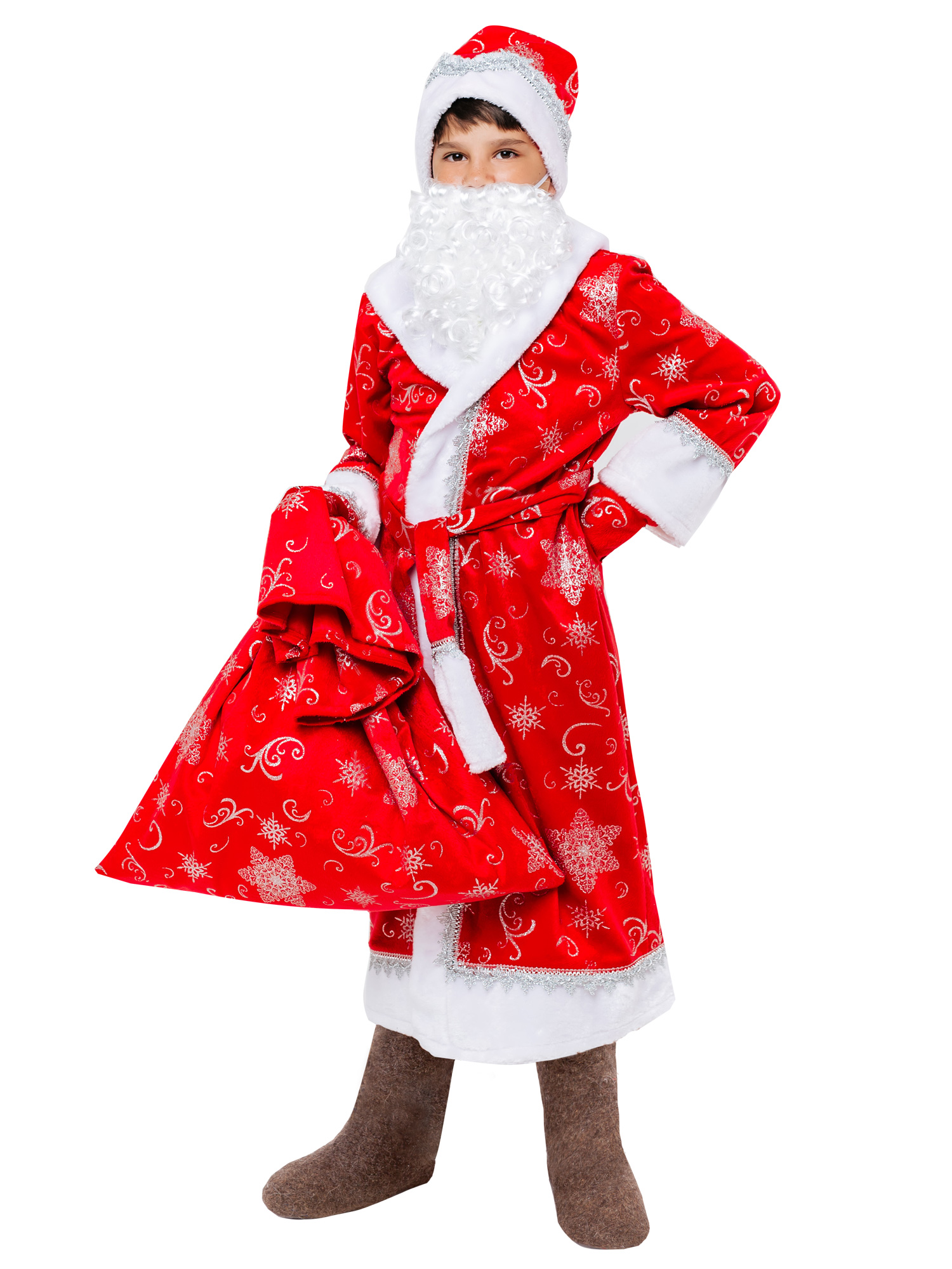 Если ребенок уже подрос, и сам хочет исполнить роль Деда Мороза, то предоставьте ему эту возможность. Карнавальный костюм Дед Мороз детский отличается от взрослого только размером. Данный образ является цельным, и в нем ребенок может принять участие в спектакле или номере. Комплектация костюма: шуба, пояс, шапка, борода, варежки и мешок.