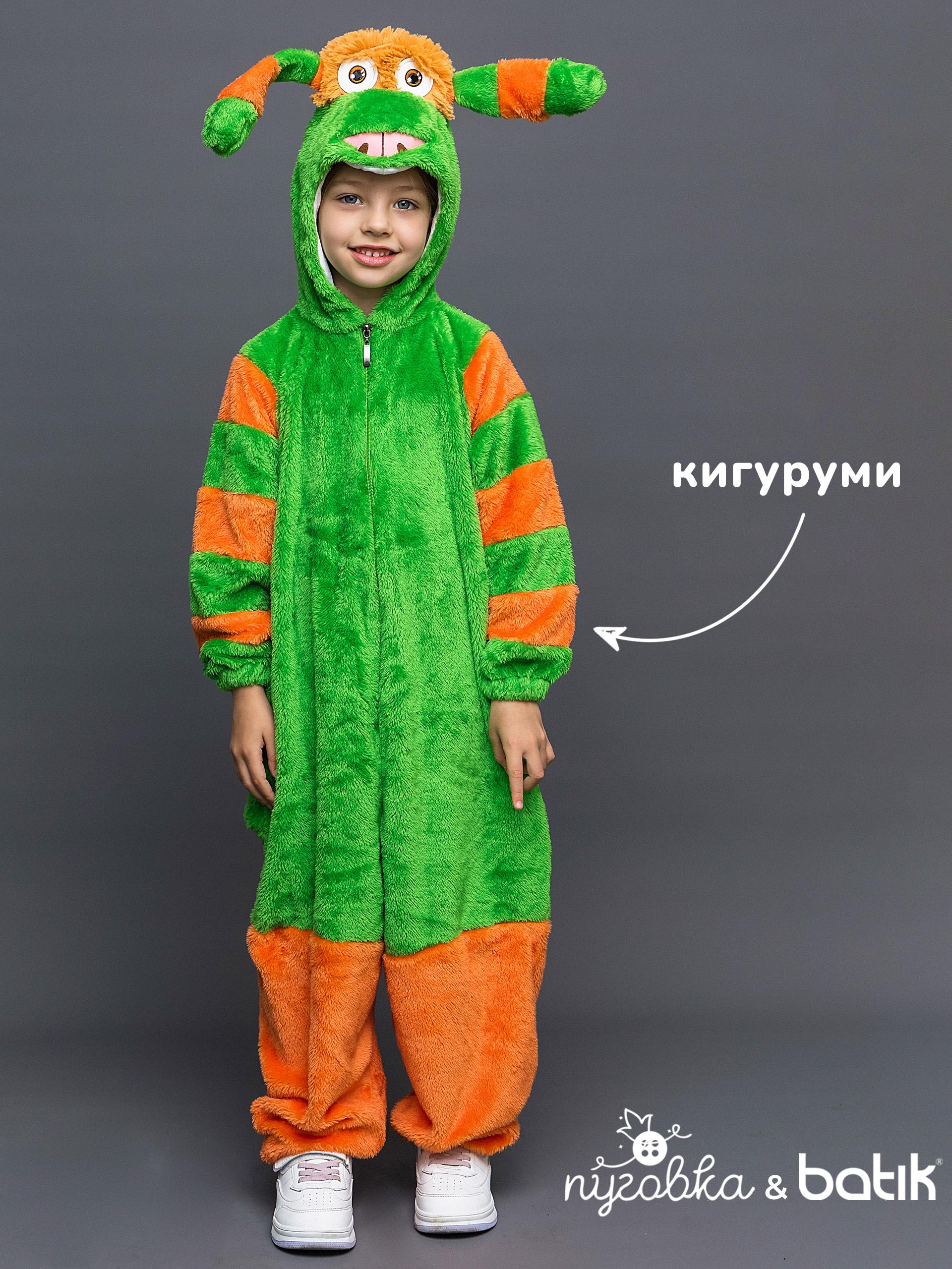Яркий карнавальный костюм Финник: оранжево-зеленый кигуруми с капюшоном на застежке-молнии. На капюшоне ушки и мордочка персонажа. Финник — персонаж из детского мультсериала «Финник» от создателей «Смешариков». Это добрый и забавный домовой, но немного вредный и озорной, он тайно обитает в мире людей, чтобы заботиться о доме и хранить домашний очаг.