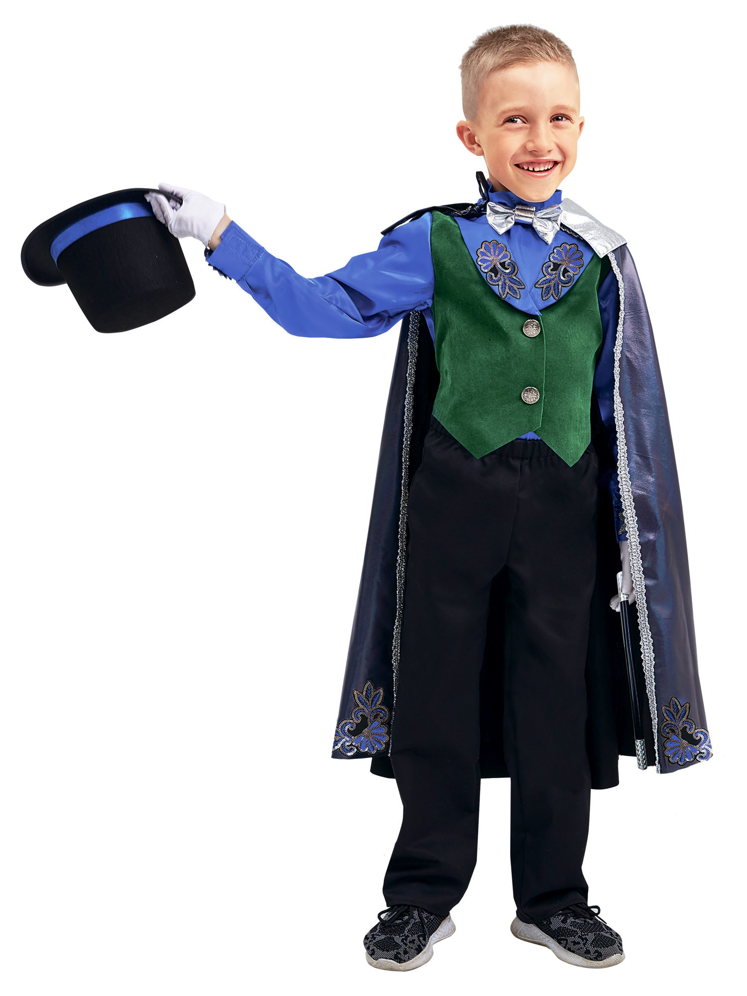 Карнавальный костюм Фокусника для мальчика. В комплекте рубашка с жилетом, брюки, плащ, цилиндр, перчатки, набор фокусника