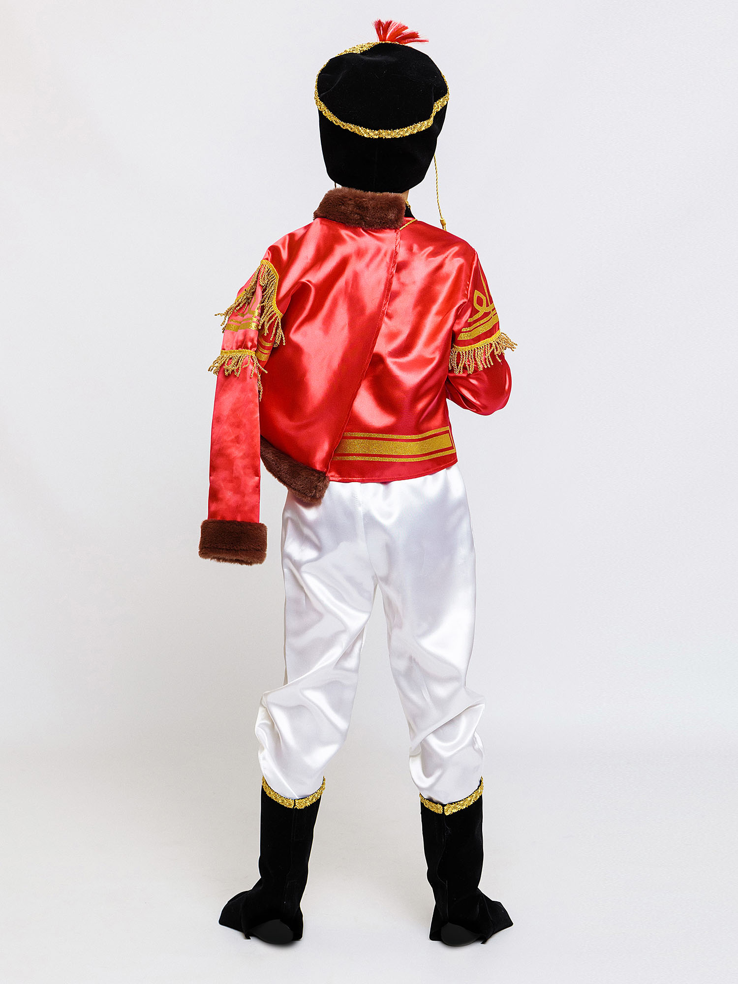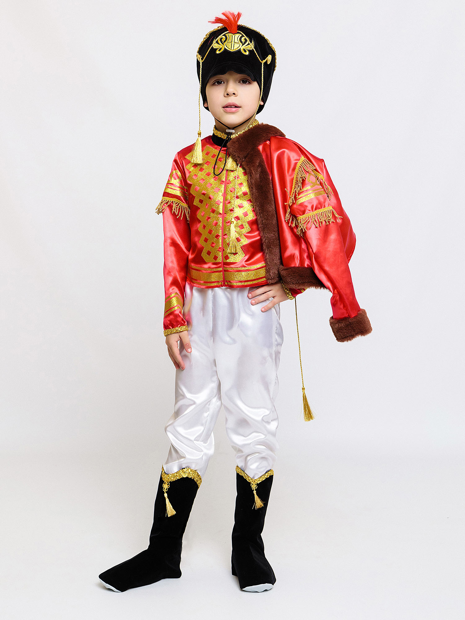Карнавальный костюм для мальчика Гусар Парадный. В комплекте рубашка косоворотка, кушак, брюки с сапогами. Костюм смелого Гусара подойдет для тематических утренников и балов-маскарадов.