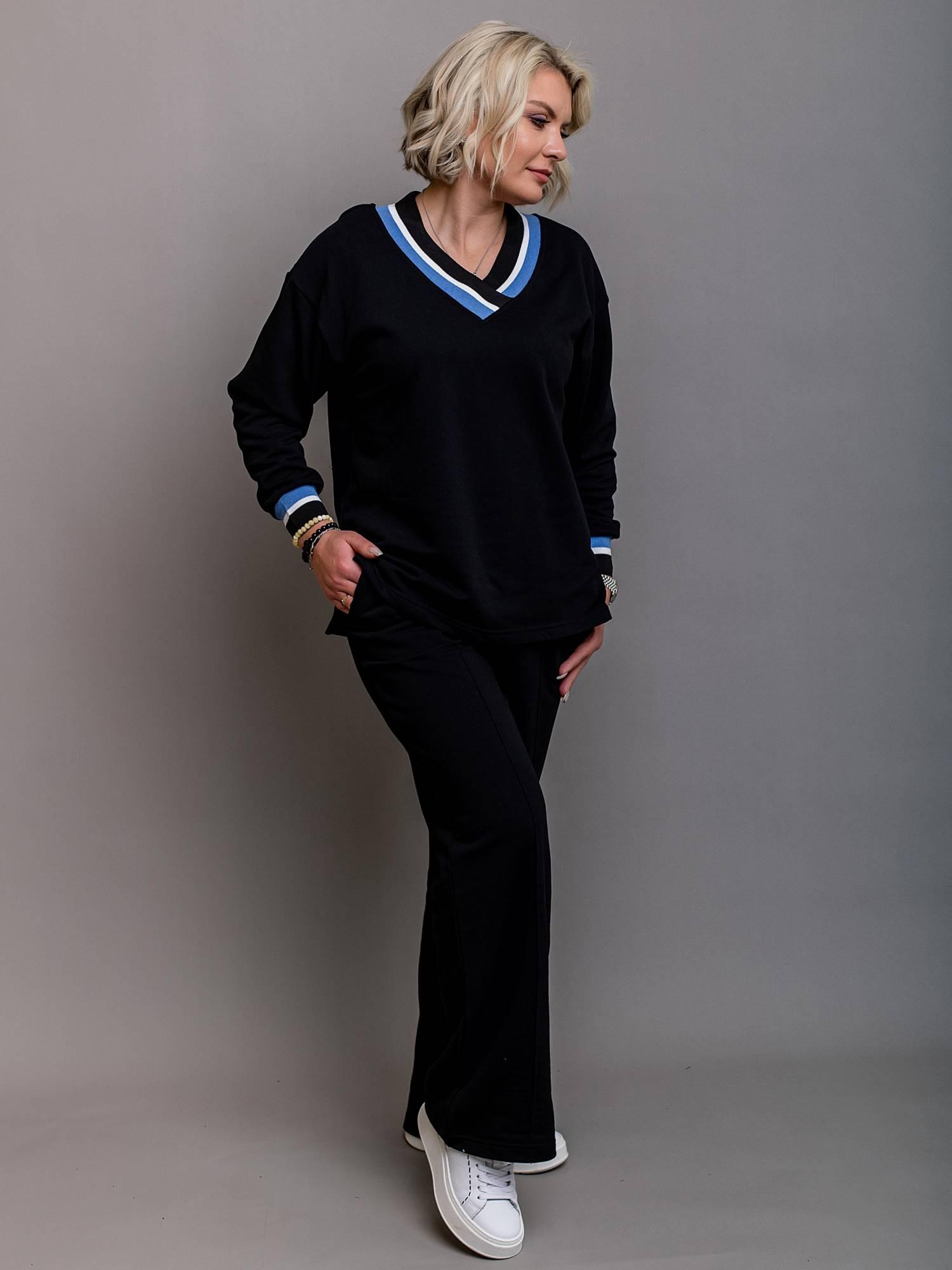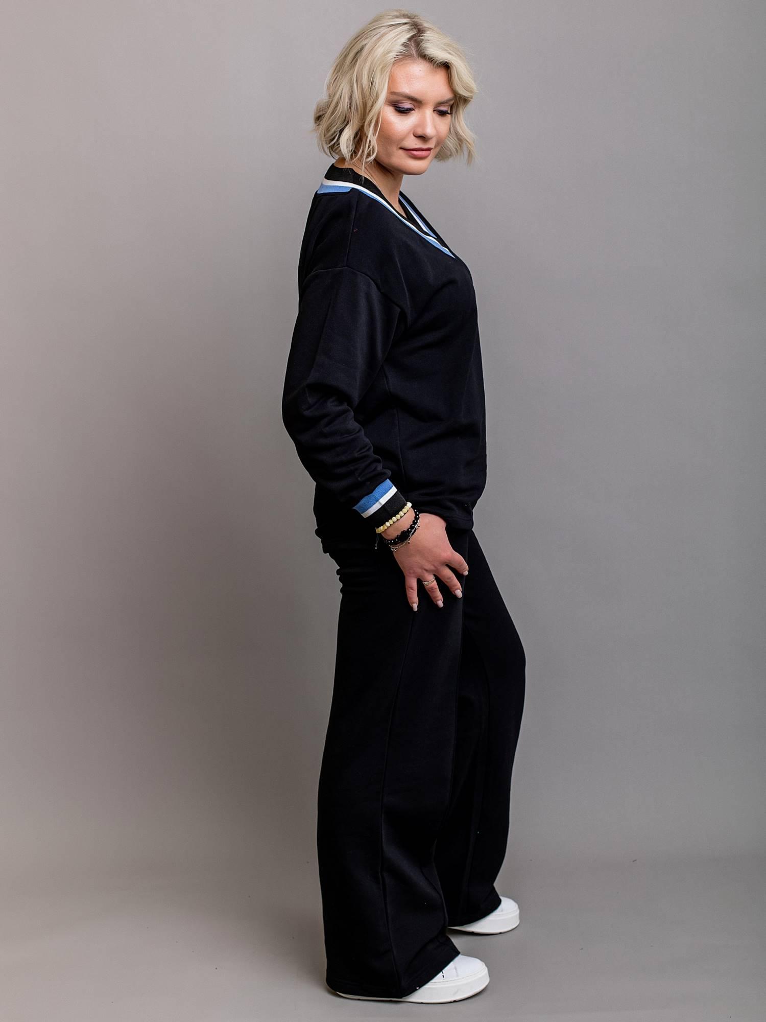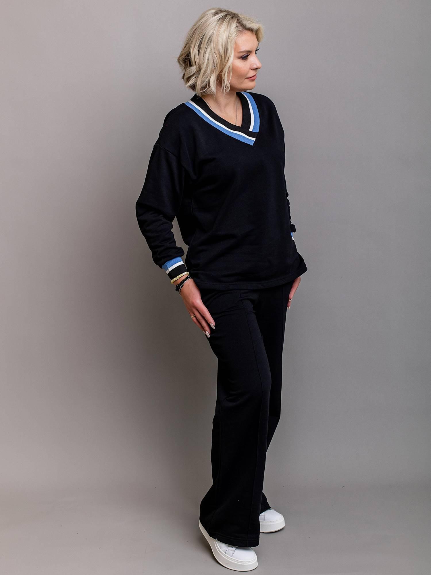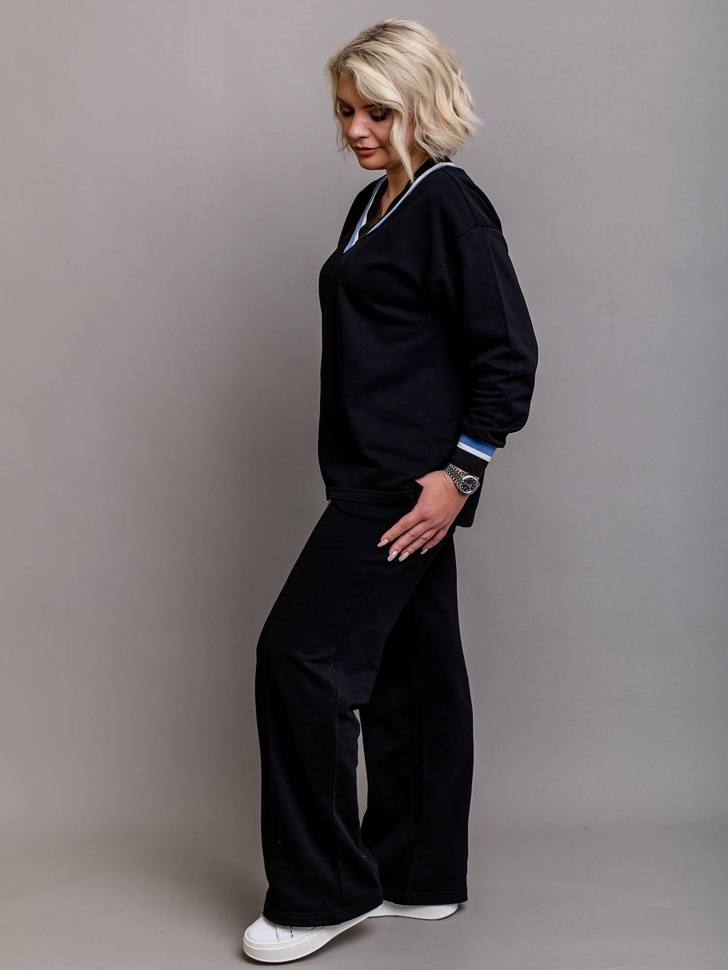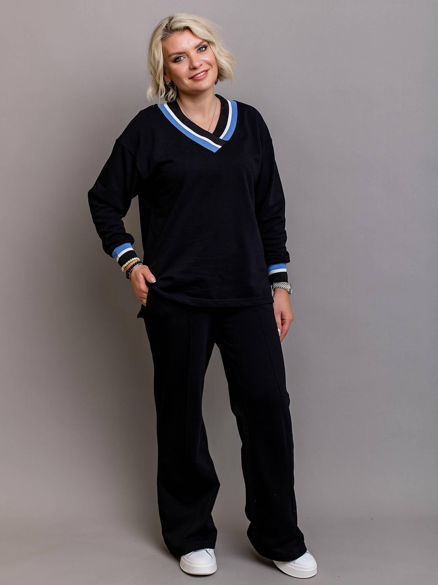 Женский трикотажный деловой костюм оверсайз - это удобный, стильный и многофункциональный комплект. Он идеально подойдет как для повседневного использования, так и для офисных выходов в прохладные осенние дни. Костюм двойка выполнен из качественного хлопка, с добавлением полиэстера, что делает костюм мягким и более износоустойчивым, и удобным в носке (быстро сохнет и не мнется). В комплект входят широкие модные брюки палаццо и свободная кофта oversize с v-образным вырезом и длинным рукавом. Брючный повседневный костюм выполнен из трикотажа премиум качества. Красивый комплект выполнен в спортивном стиле и легко сочетается с обувью на плоской подошве, кроссовками или ботинками на небольшом каблуке. Шикарный костюм со штанами прямого кроя имеет идеальную посадку. Демисезонная одежда без начеса выполнена из плотного футера и идеально подходит для осени, весны и тёплой зимы. Благодаря большой линейке размерного ряда костюм идеально подойдет стройным девушках, беременным и женщинам больших размеров (plus size, плюс сайз). Классические прямые штаны можно носить с рубашкой в офис или футболкой на прогулке. Хлопковый утепленный базовый свитшот можно сочетать с джинсами в летний период. Его также можно носить как домашний комплект. Легкая офисная форма подойдет для прохладного лета. Модный и стильный костюм для женщин, который станет главным трендом в 2023 году. Молодежный однотонный костюмчик с манжетами разного цвета подойдет для отдыха дома, поездки в отпуск и занятий спортом на улице, а также на праздник. Вечерний уличный костюм поможет вам составить нарядный и праздничный образ, соответствующий популярным трендам этого сезона. Теплый прогулочный и походный костюм хорошо сидит на высоких, невысоких и полных (sizeplus) девочках и подходит на осенний, весенний и зимний период. Черный лонгслив с цветными манжетами- классика моды и подходит для мам и в период беременности. Вещи нашего бренда производятся в России и имеют хороший состав и премиум качество.