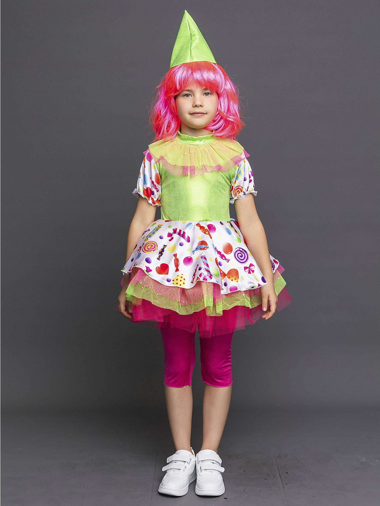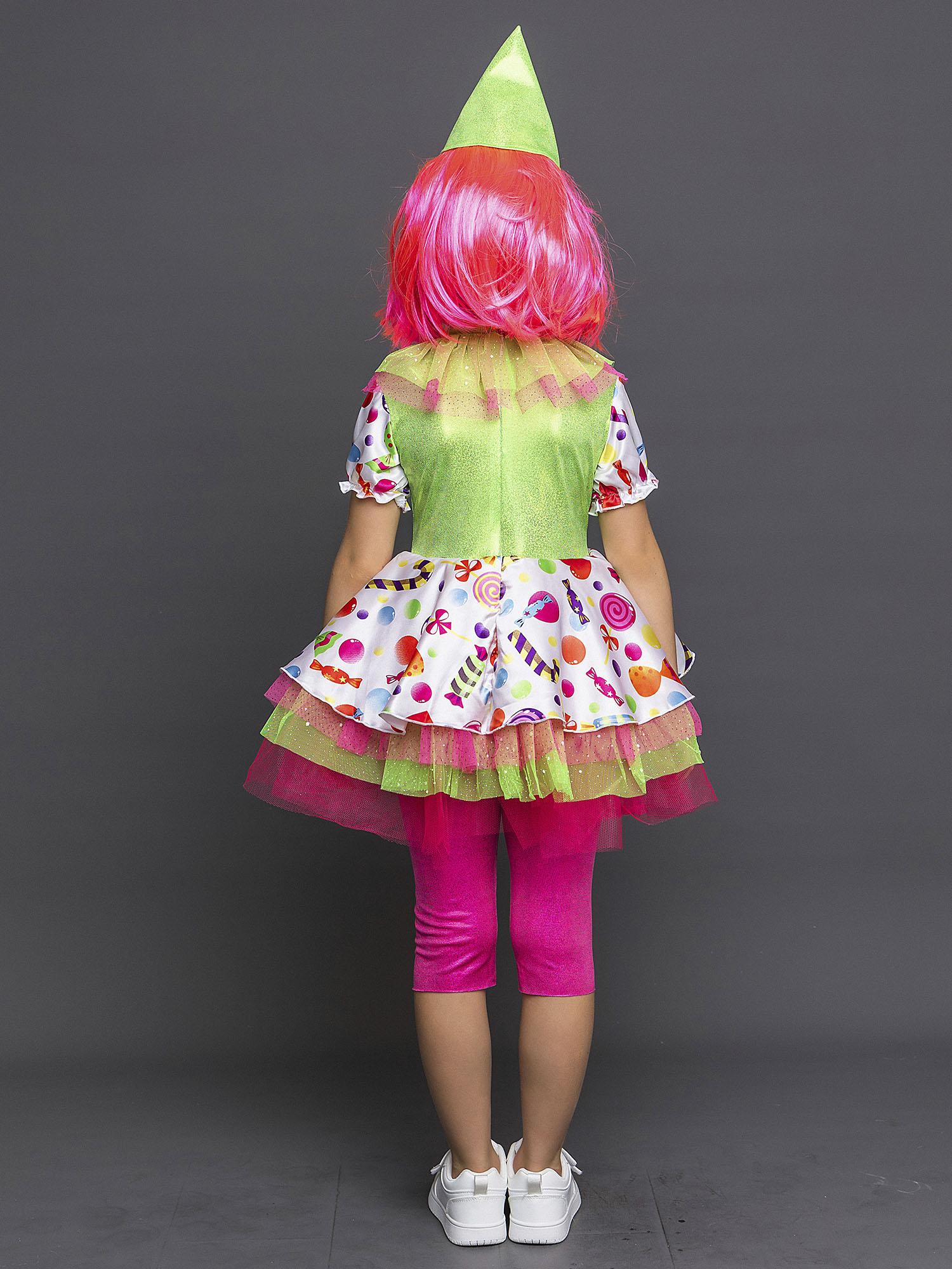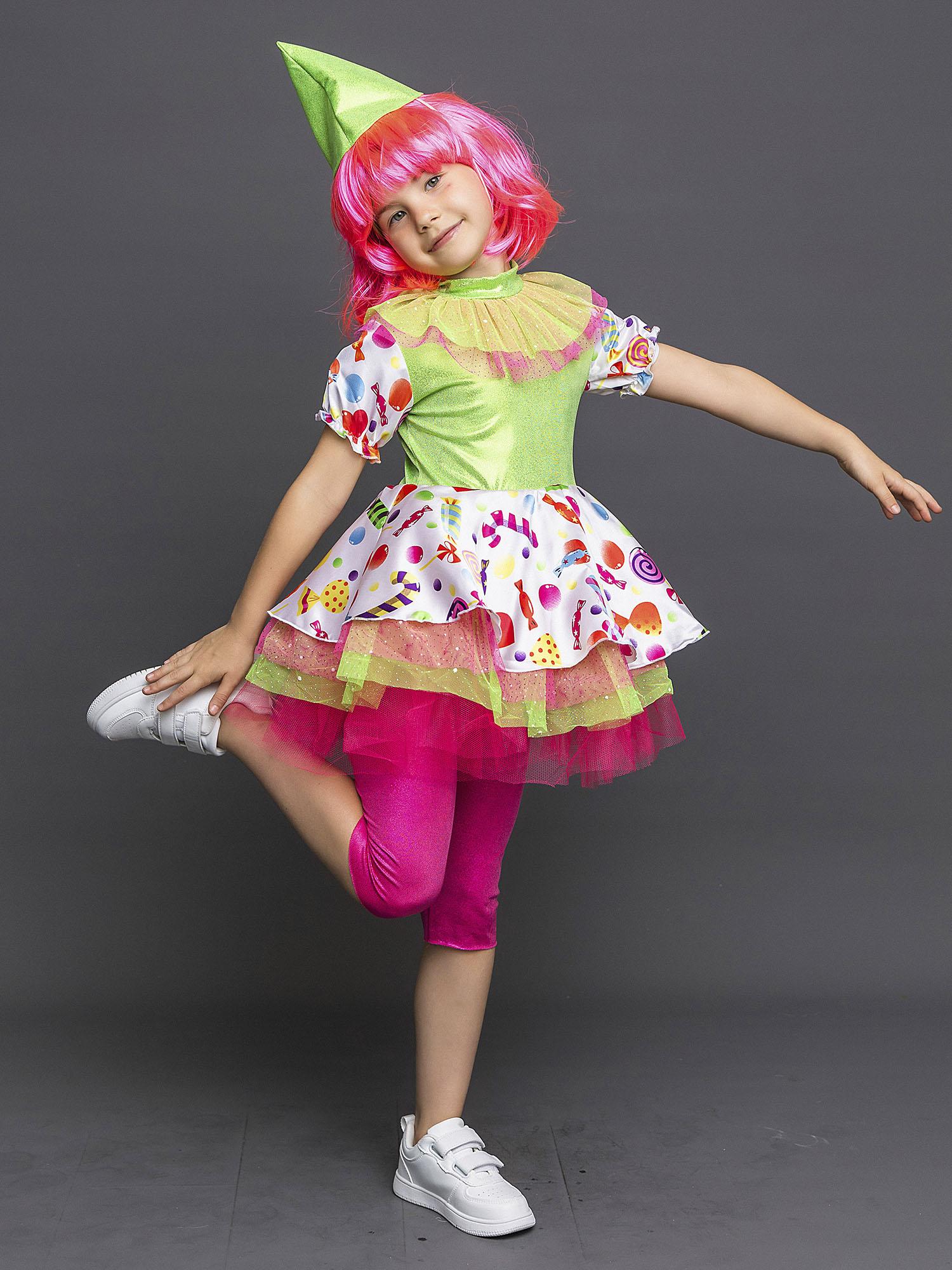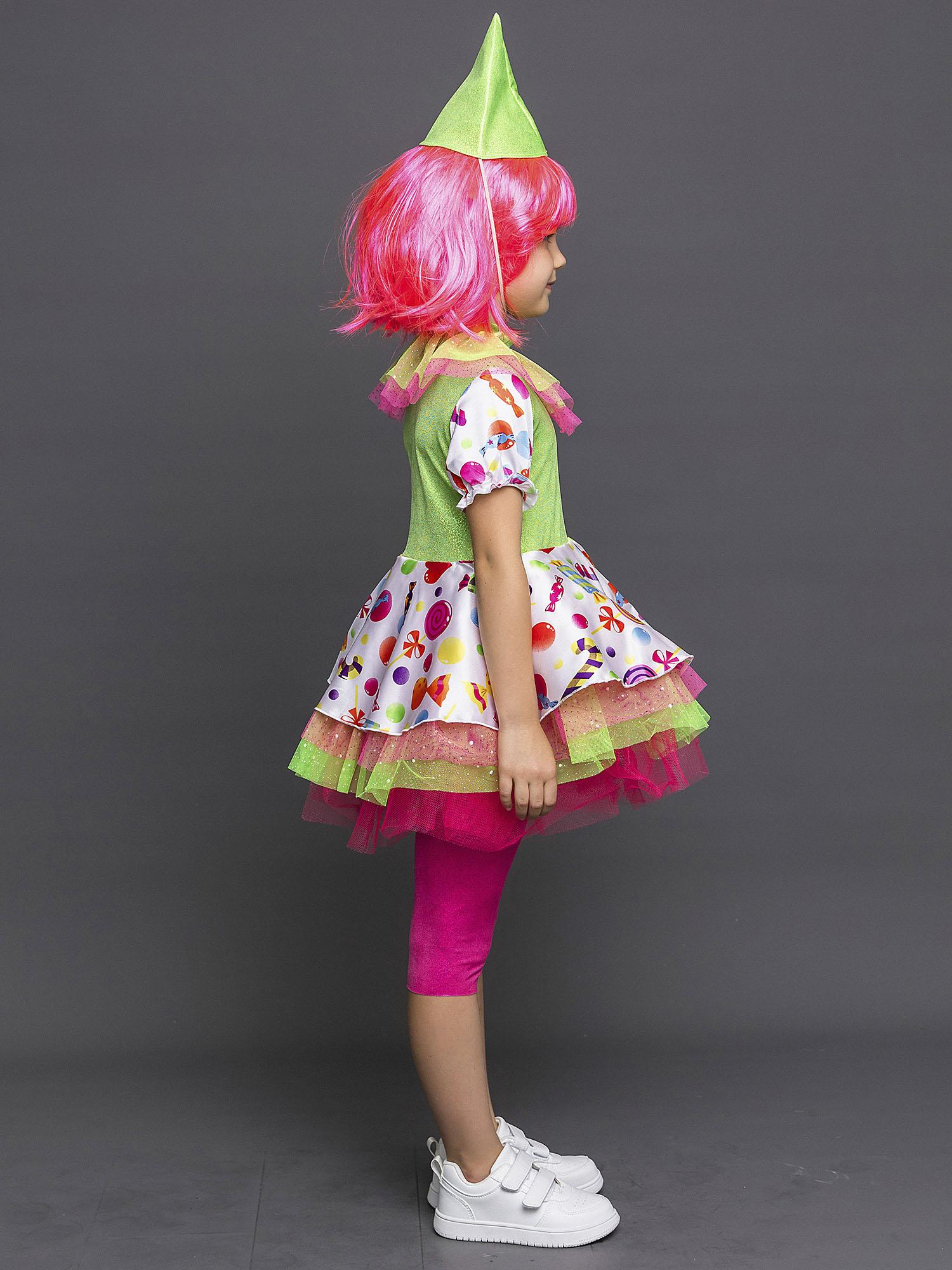 Карнавальный костюм Клоунессы детский от бренда Пуговка. Яркий и веселый костюм, в комплект которого входит платье, бриджи, колпак, парик.