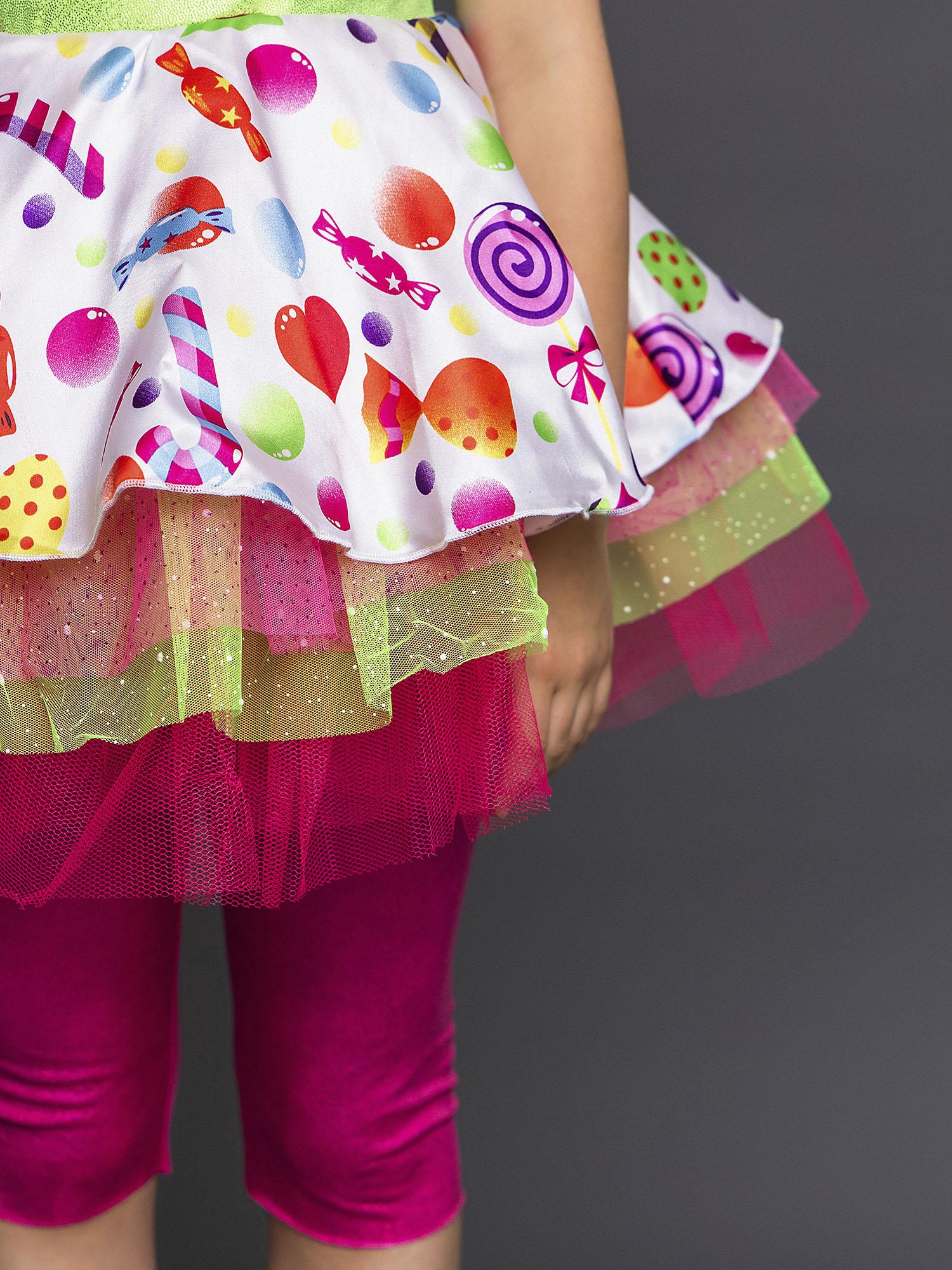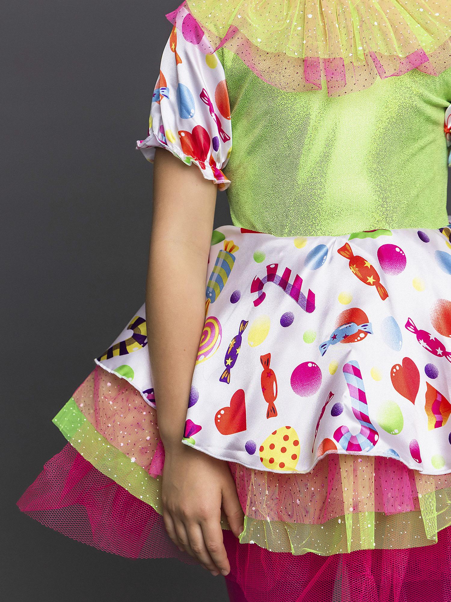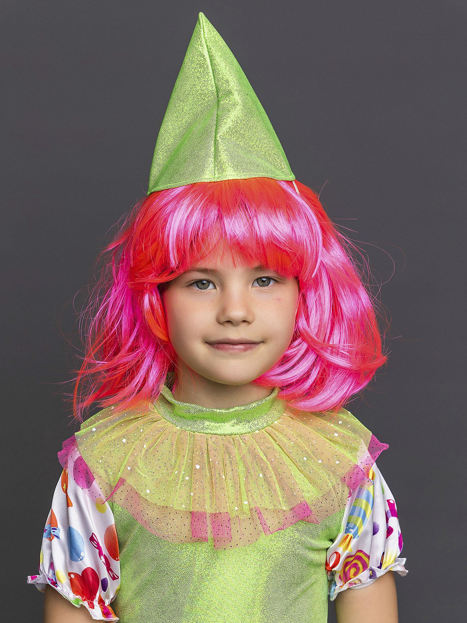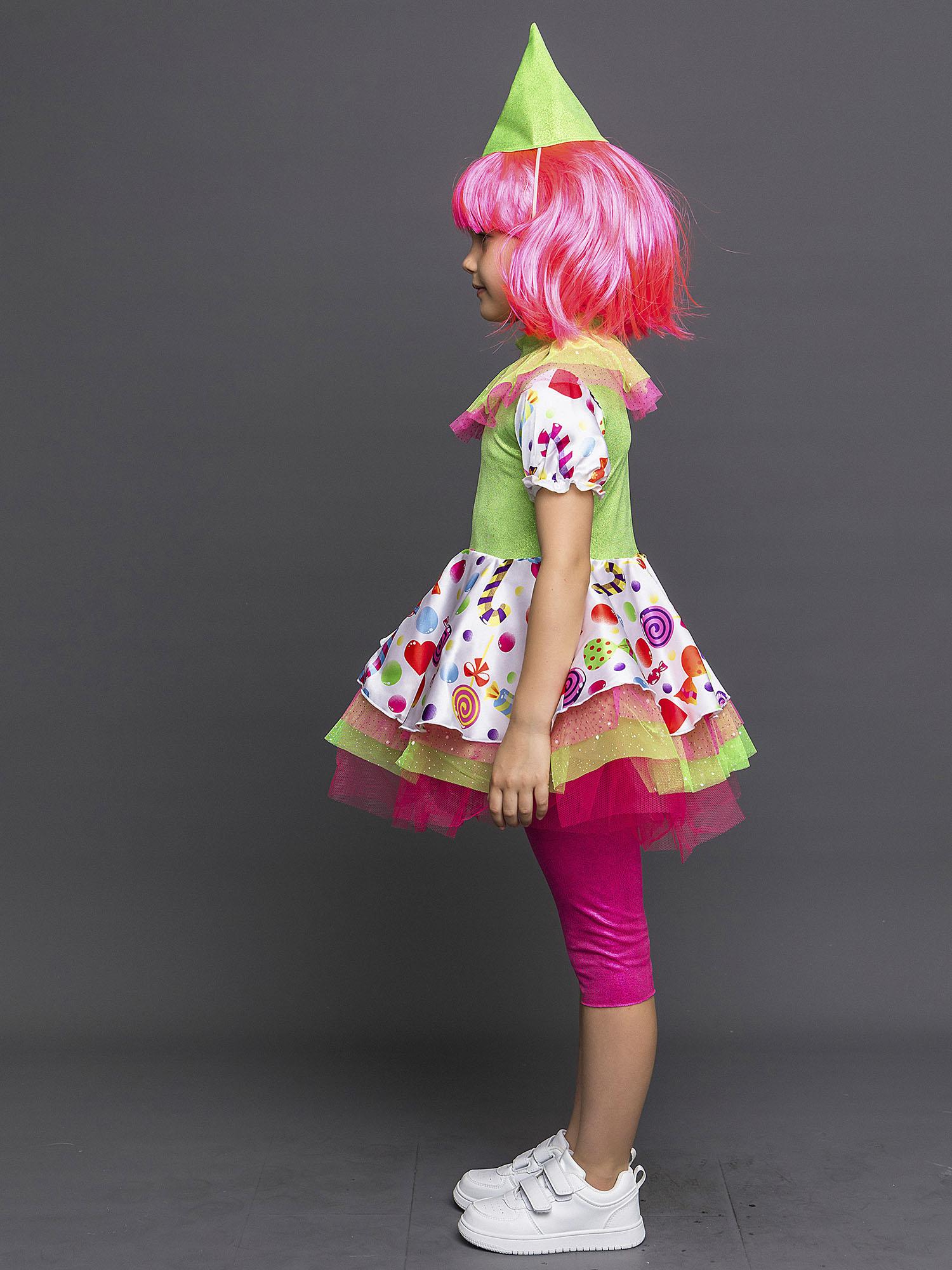 Карнавальный костюм Клоунессы детский от бренда Пуговка. Яркий и веселый костюм, в комплект которого входит платье, бриджи, колпак, парик.