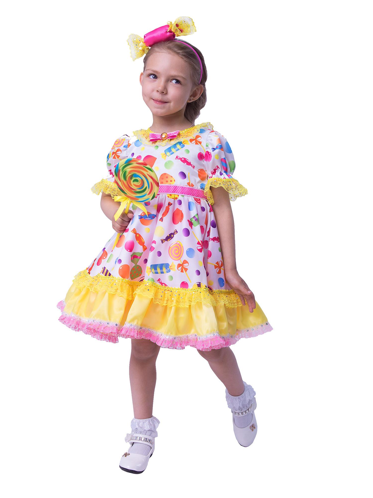Карнавальный образ Конфетка подарит отличное настроение на весь день! Яркий и оригинальный наряд для девочек 3-9 лет. В комплекте образа платье, ободок и пластиковый леденец.