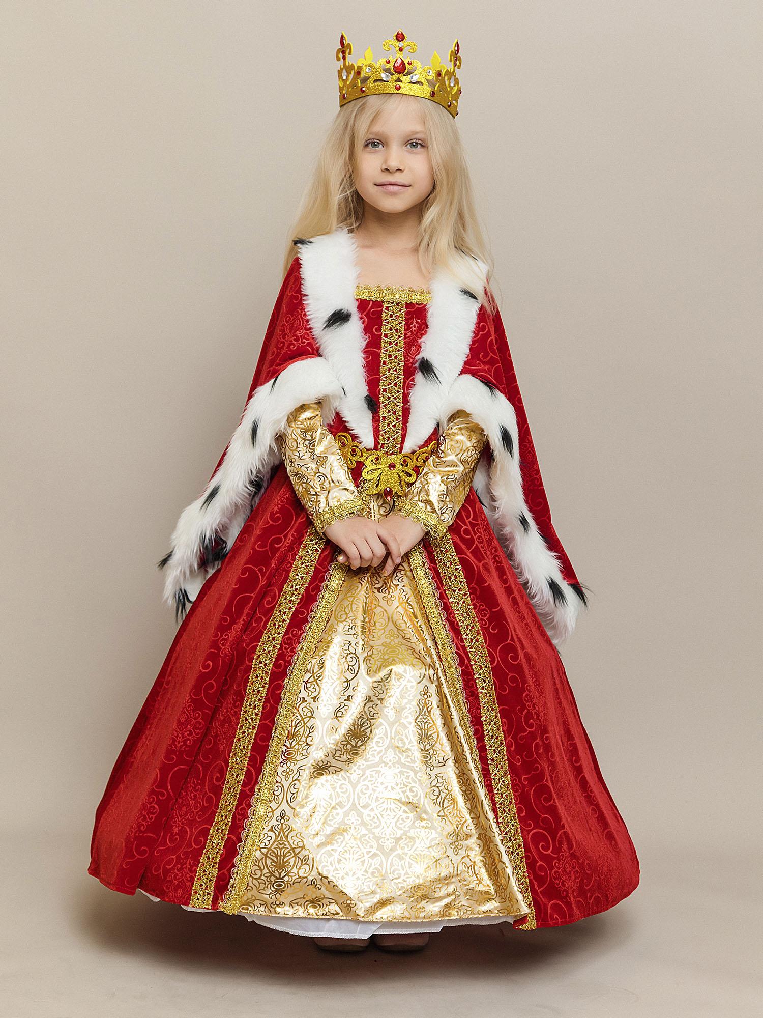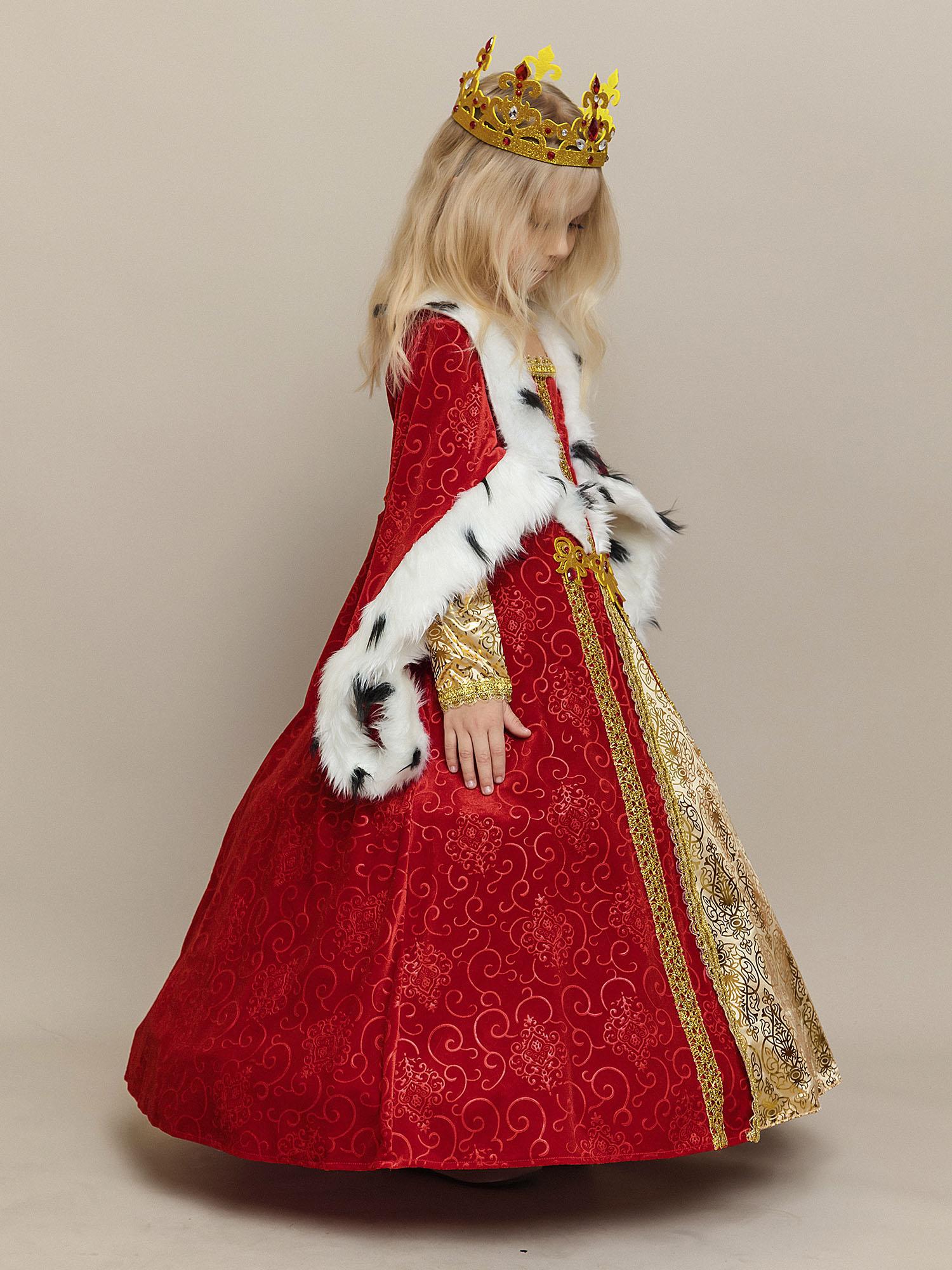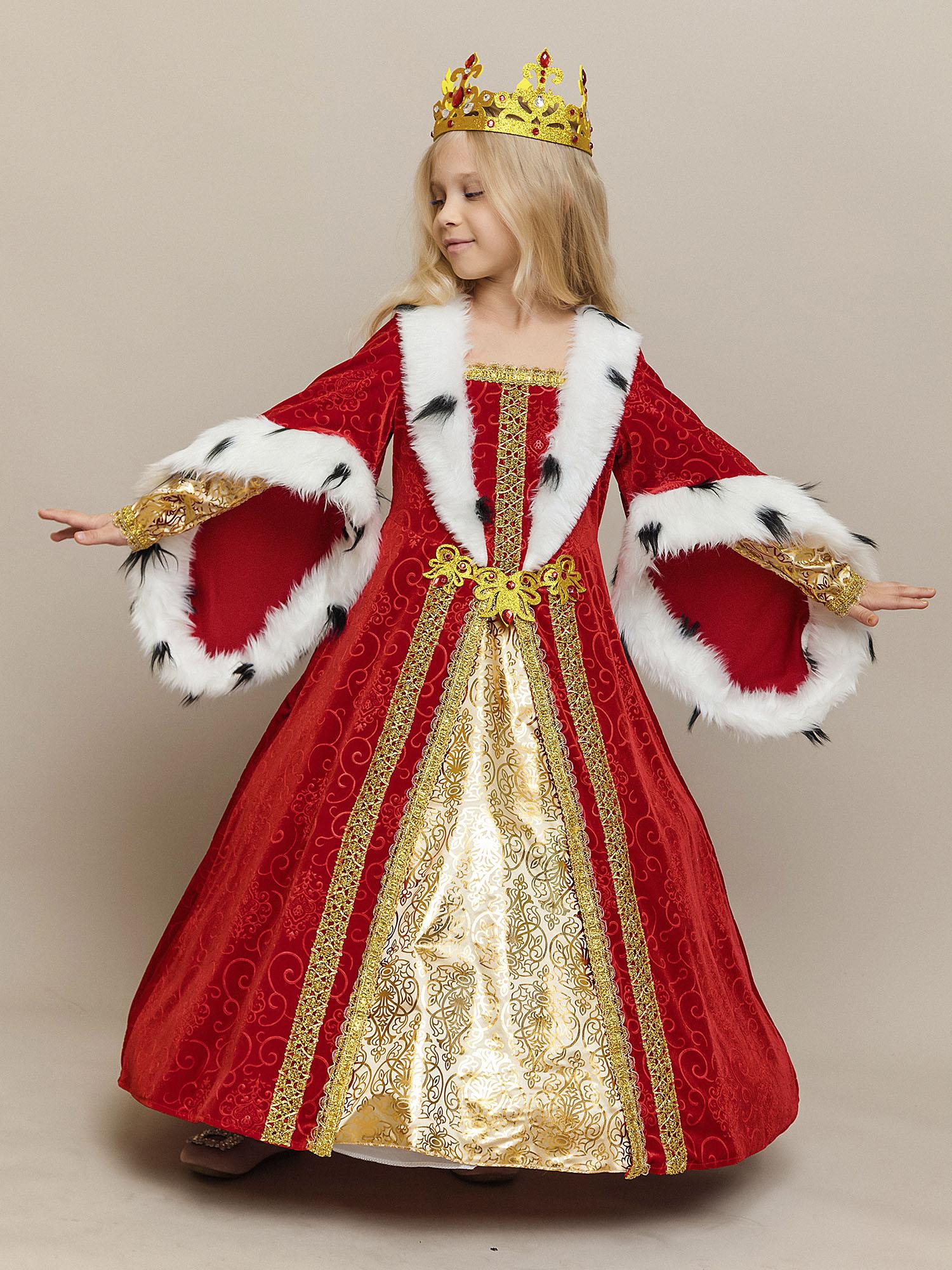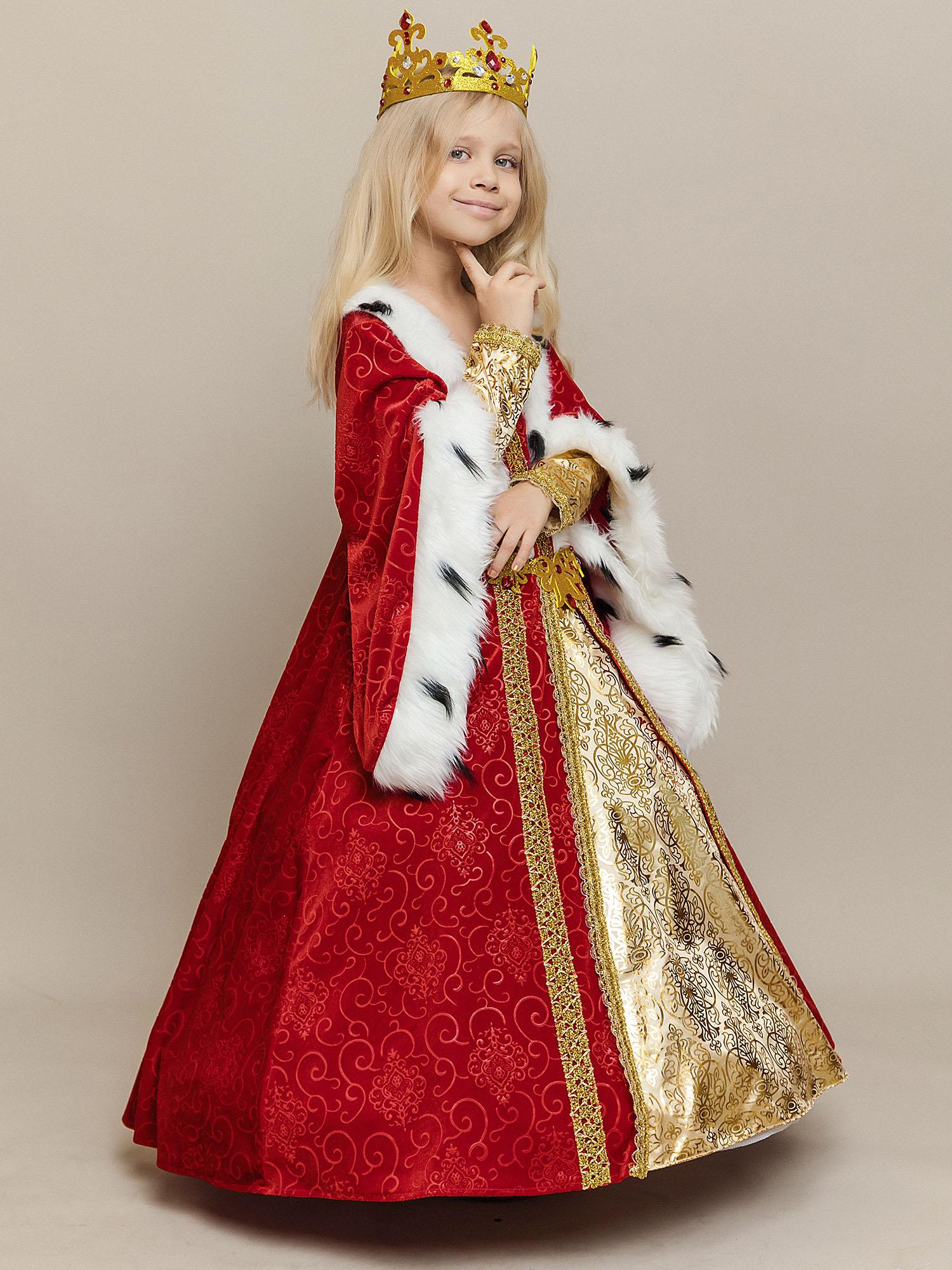 Костюм Королевы для девочки на утренник в детский сад или школу. Роскошный образ из новой коллекции бренда Пуговка, который приведет всех в восторг. Нарядное и по-королевски шикарное платье из красного бархата дополняет золотая корона с камнями.