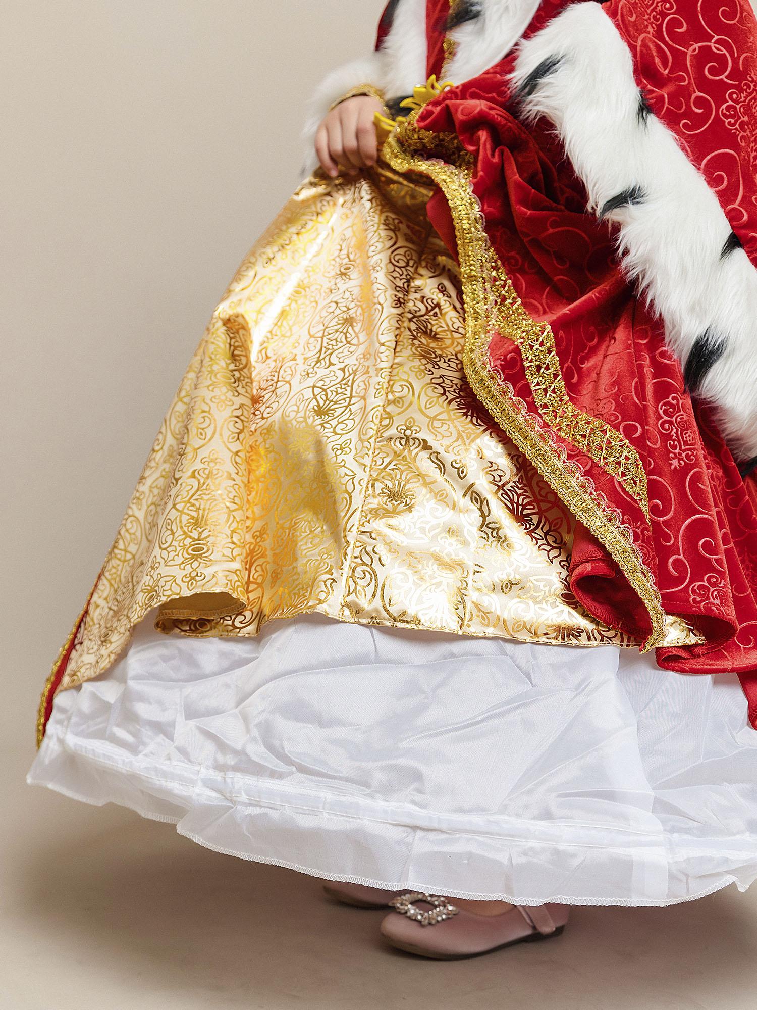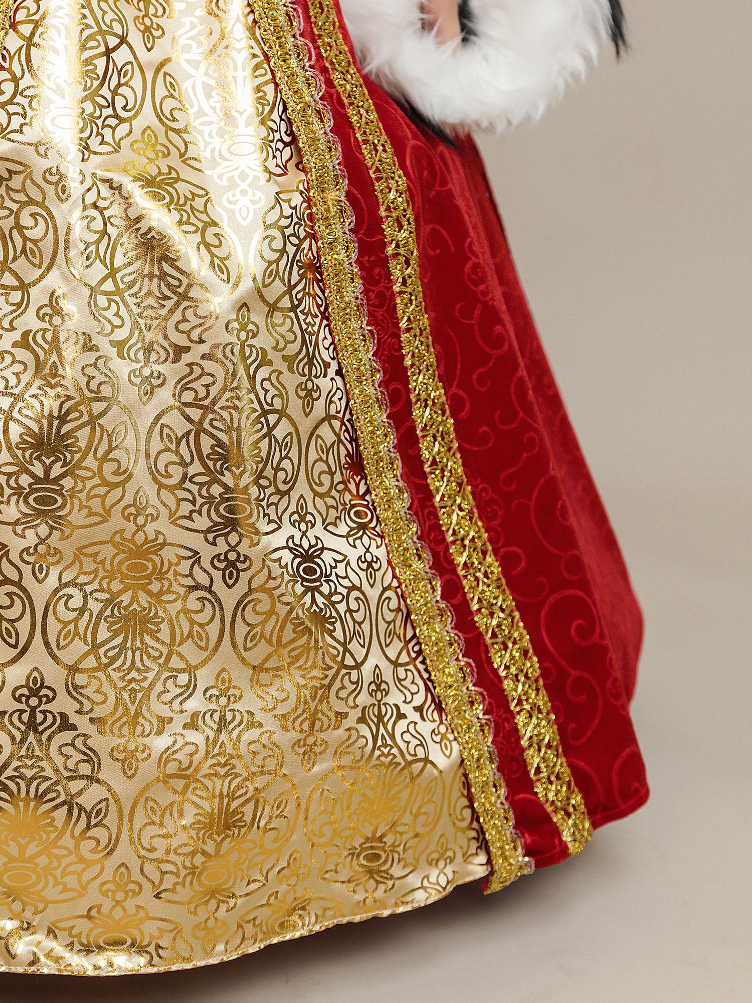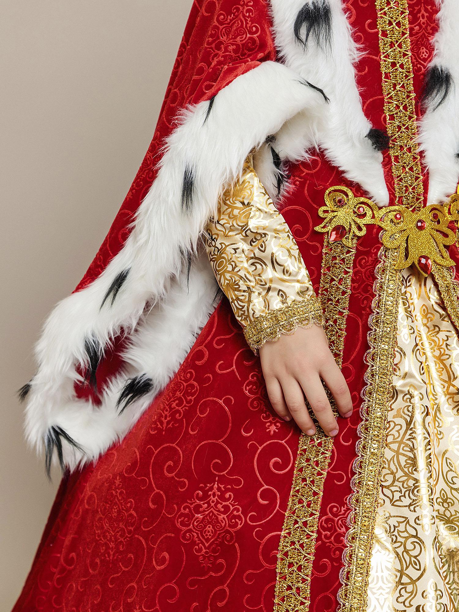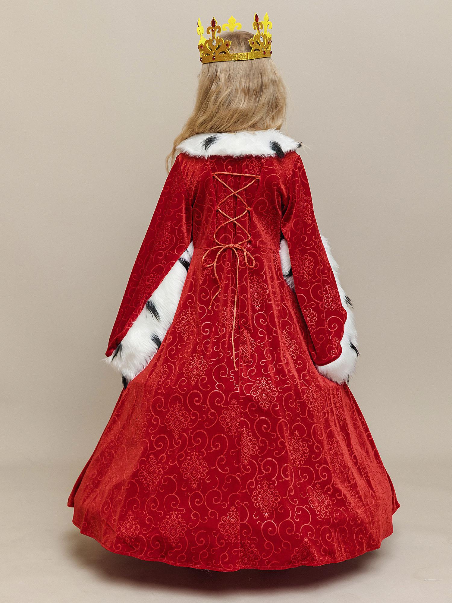 Костюм Королевы для девочки на утренник в детский сад или школу. Роскошный образ из новой коллекции бренда Пуговка, который приведет всех в восторг. Нарядное и по-королевски шикарное платье из красного бархата дополняет золотая корона с камнями.