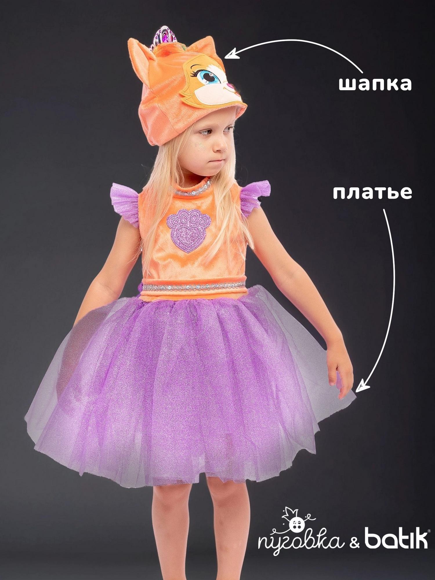 Костюм детский Котенка Жемчужинки для девочек. Яркий оранжево-розовый наряд идеален для тематических праздников, утренников и фотосессий. Устройте костюмированное чаепитие для девочек по мотивам мультика "Королевские питомцы". Костюм сшит по лицензии с компанией Дисней. В комплекте платье и шапка-маска.