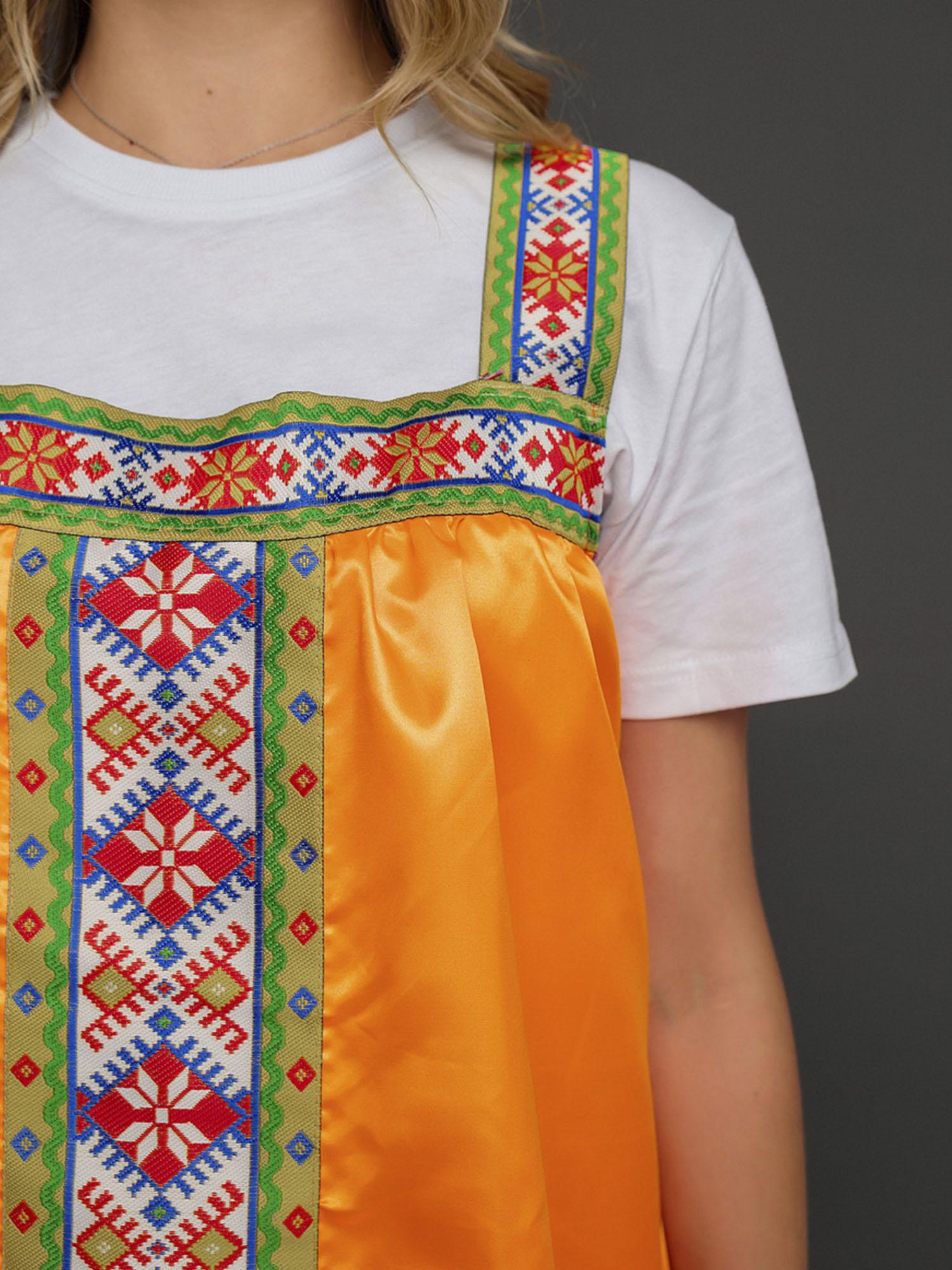 - Ленты с орнаментом вдоль сарафана и на лямках