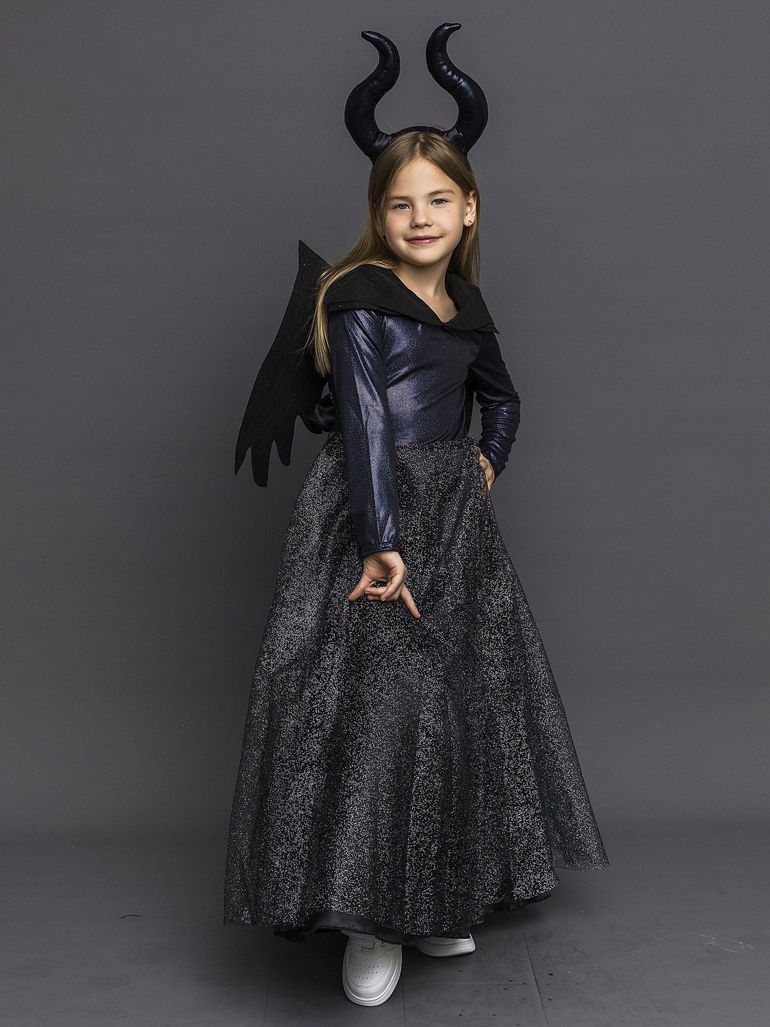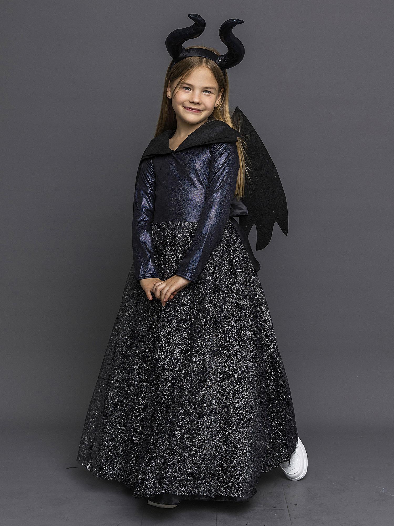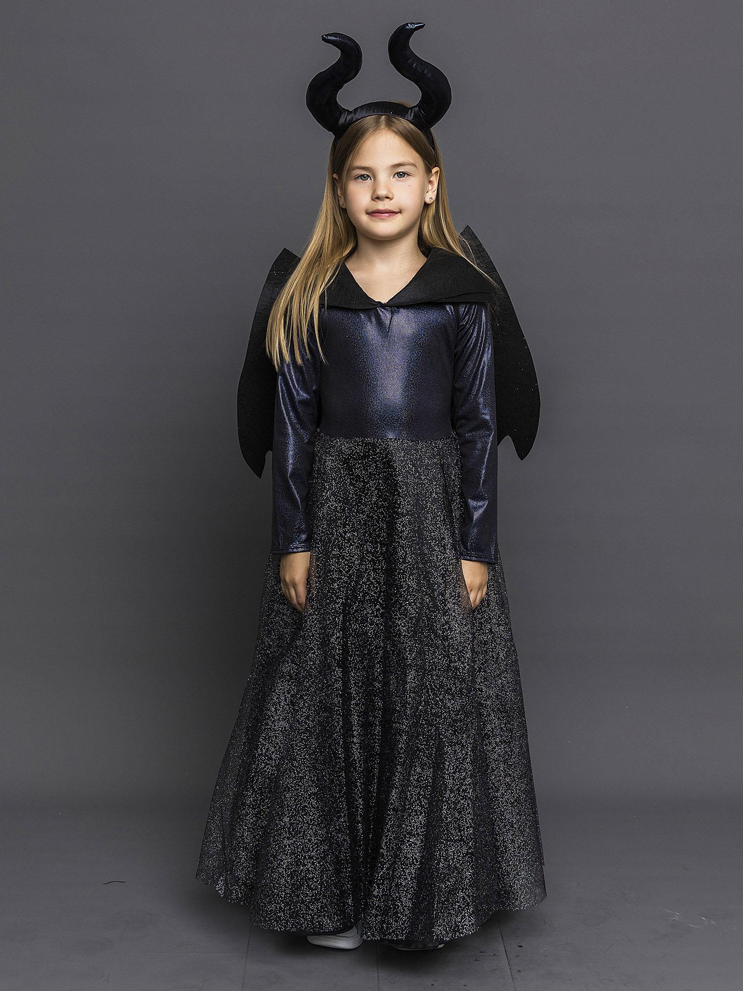 Костюм Малефисенты детский с крыльями - шикарный образ на Хэллоуин, день Рождения или новогодний утренник. В таком наряде ни одна девочка не останется без внимания! Костюм по мотивам фильма "Малефисента" выполнен по лицензионному соглашению с компанией Дисней. В комплект входит черное платье, крылья и рога.