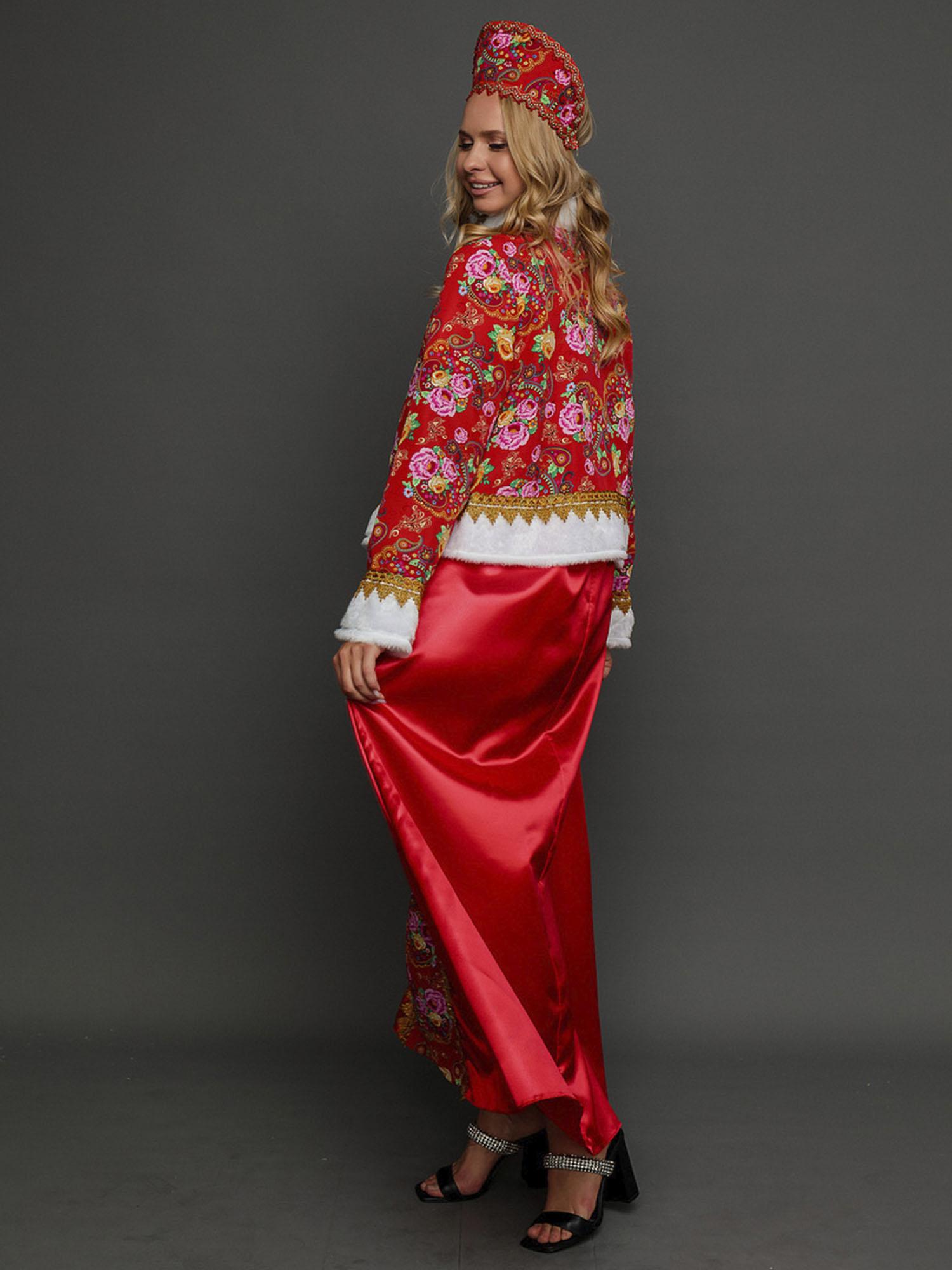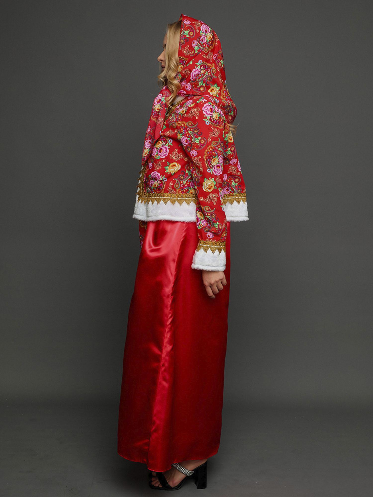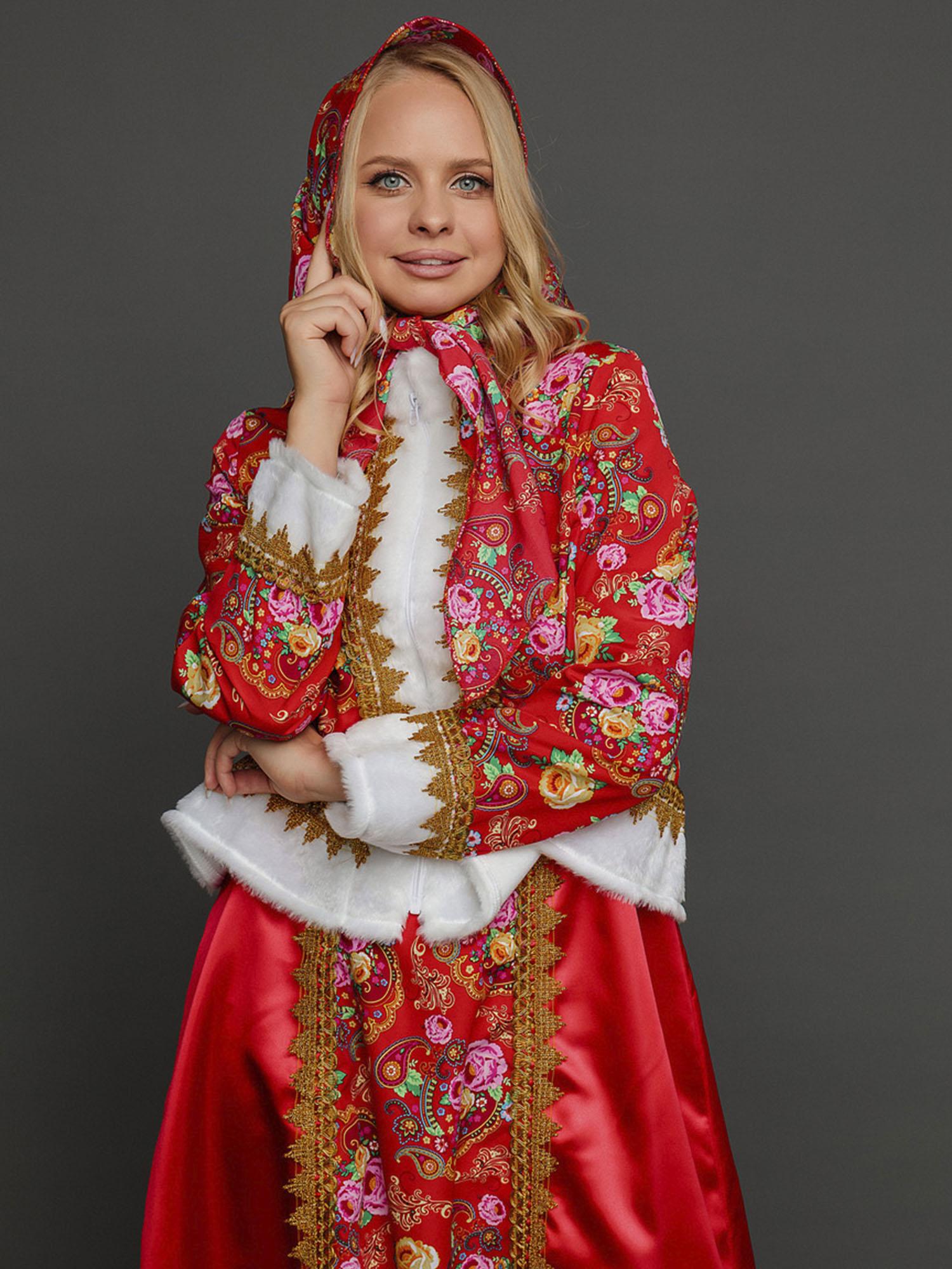 Карнавальный костюм Масленицы для взрослого. Карнавальный костюм Масленица состоит из сарафана, душегреи, платка и кокошника. Красный сарафан прямого кроя украшен тесьмой и народными узорами, символизирующими праздник наступления весны. Края рукавов, воротник и центр душегреи декорированы белым искусственным мехом. Кокошник с тесьмой и узорами дополняет образ красавицы-масленицы. Костюм Масленицы отлично подходит для представлений, празднования Масленицы и других тематических праздников.