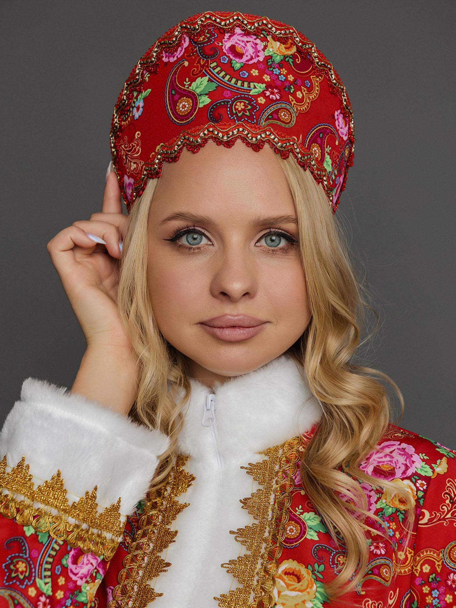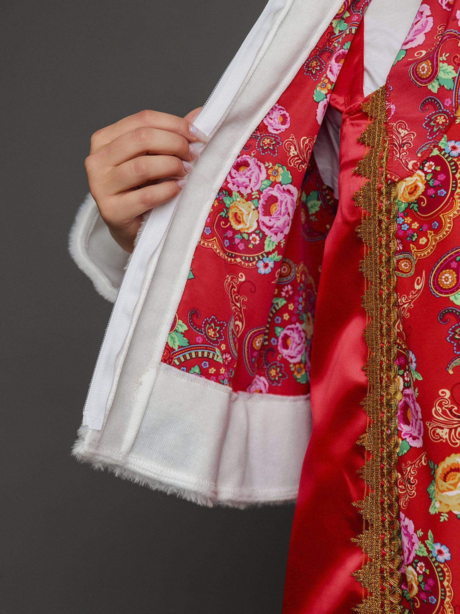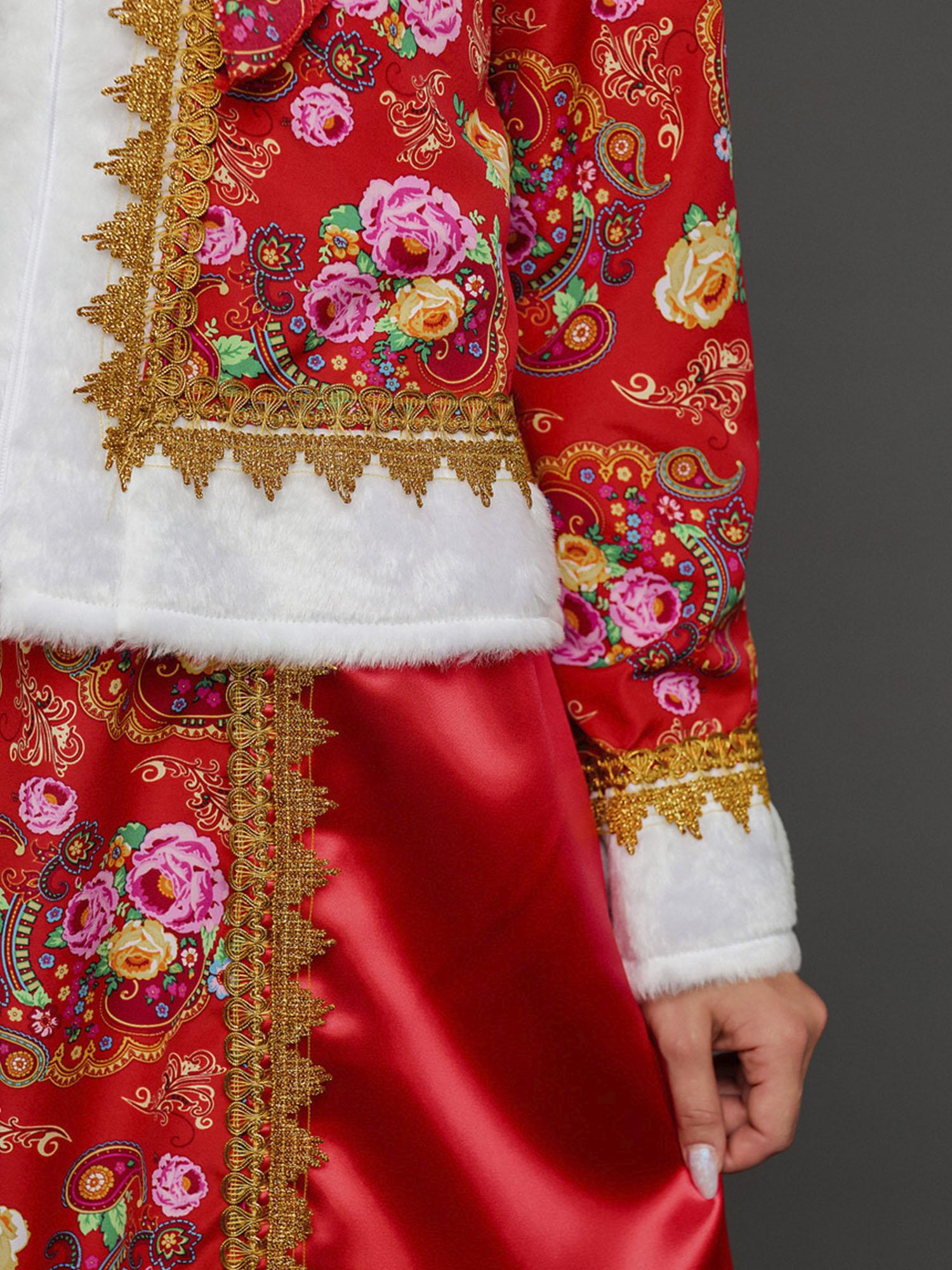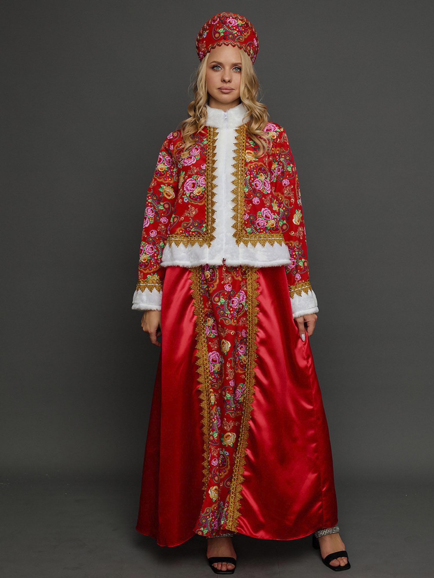 Карнавальный костюм Масленицы для взрослого. Карнавальный костюм Масленица состоит из сарафана, душегреи, платка и кокошника. Красный сарафан прямого кроя украшен тесьмой и народными узорами, символизирующими праздник наступления весны. Края рукавов, воротник и центр душегреи декорированы белым искусственным мехом. Кокошник с тесьмой и узорами дополняет образ красавицы-масленицы. Костюм Масленицы отлично подходит для представлений, празднования Масленицы и других тематических праздников.