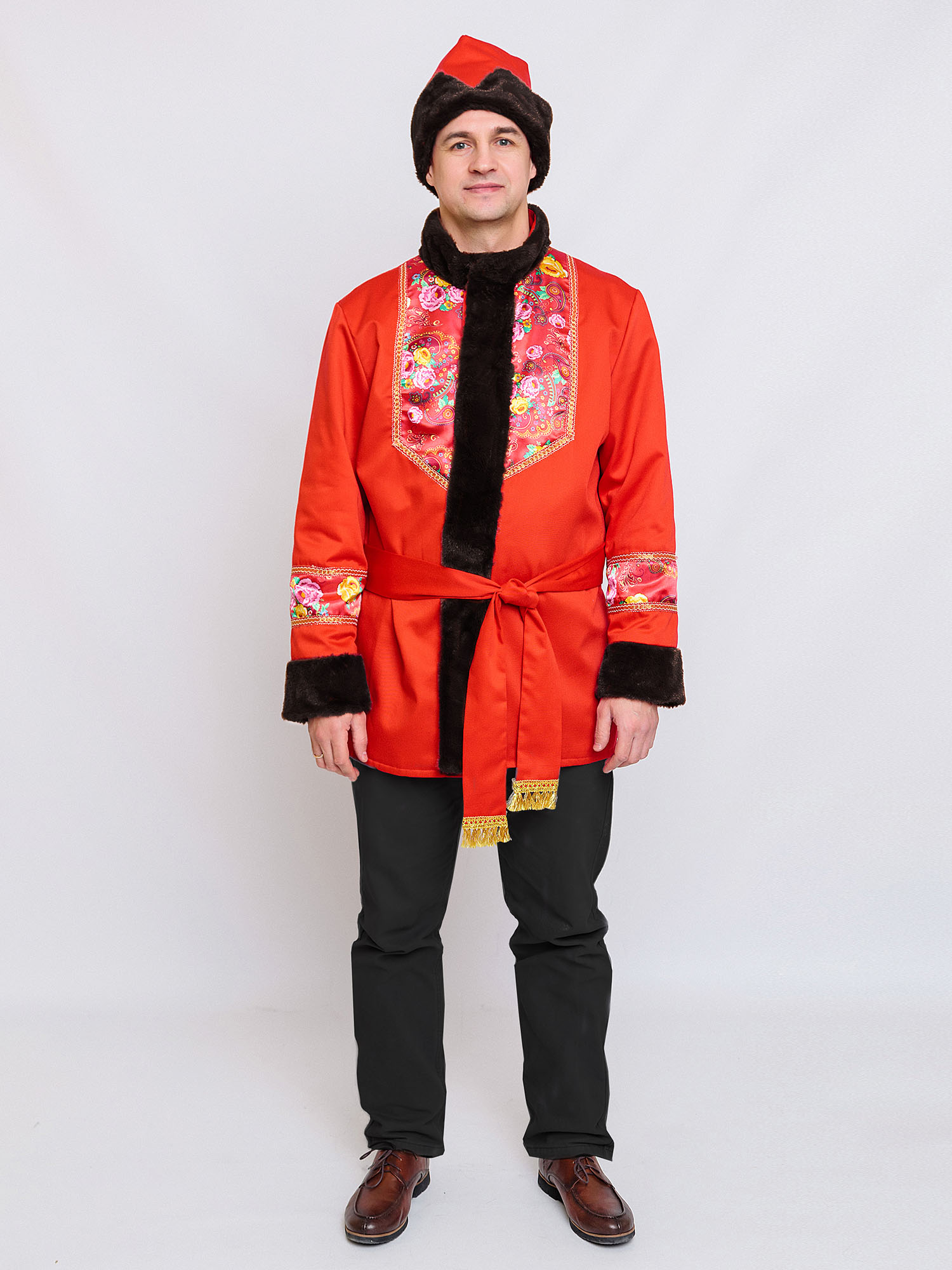 Карнавальный костюм для взрослых в русском народном стиле Матвей. В комплект входит красный кафтан с меховой оторочкой, шапка, кушак с золотой тесьмой. Костюм подойдет для театральных постановок, детских утренников и различных праздников, например, Масленицы.