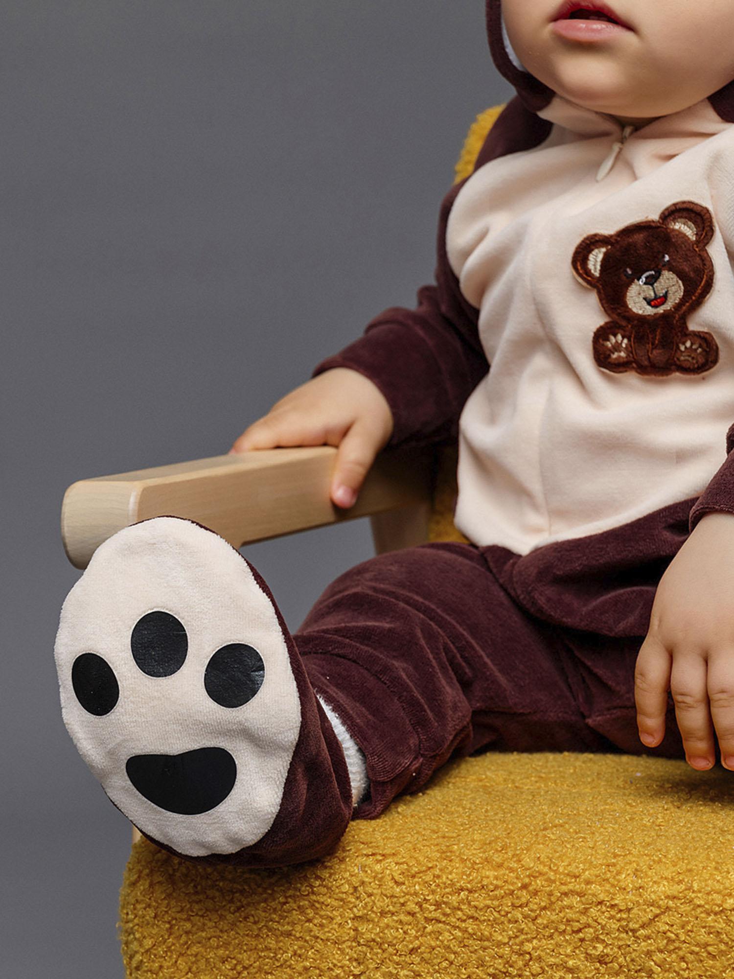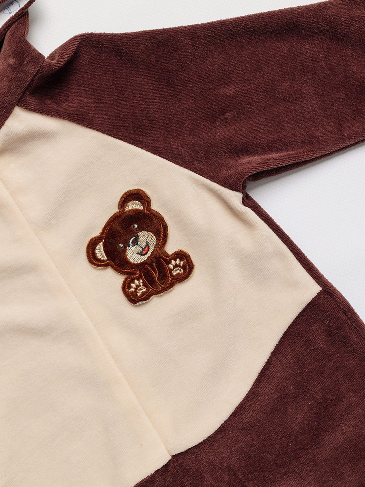 Костюм Медвежонка для новорожденного - чудесный образ славного мишки, в котором можно отправиться на первую фотосессию с малышом или отпраздновать маленькую дату, например, 6 месяцев. Коричневый комбинезон с капюшоном выполнен из 100% хлопка.