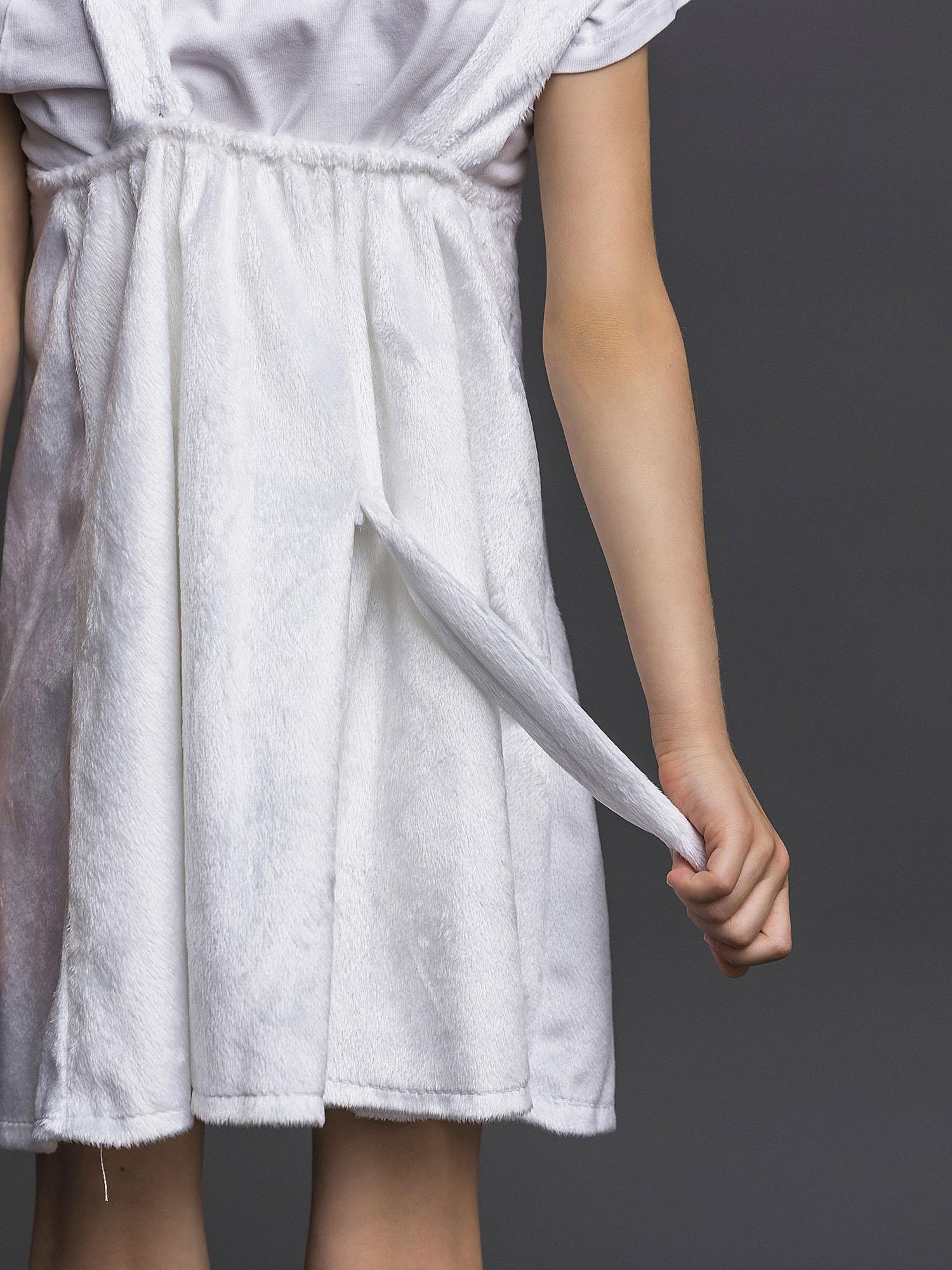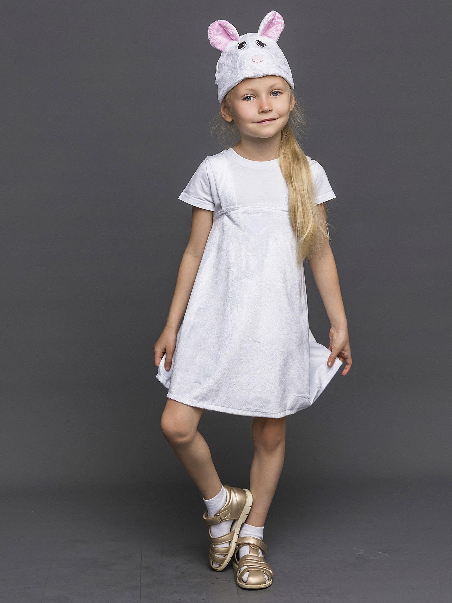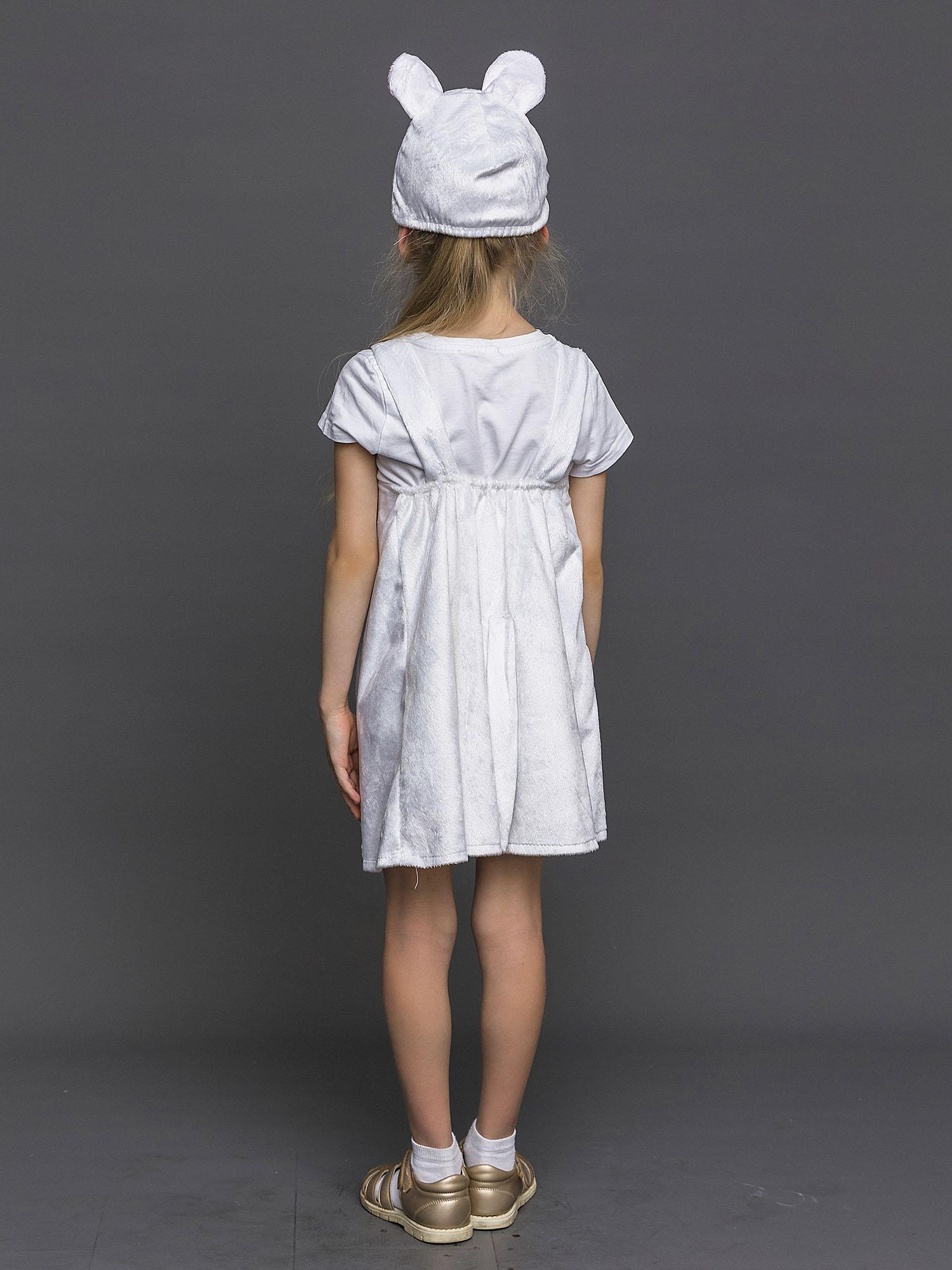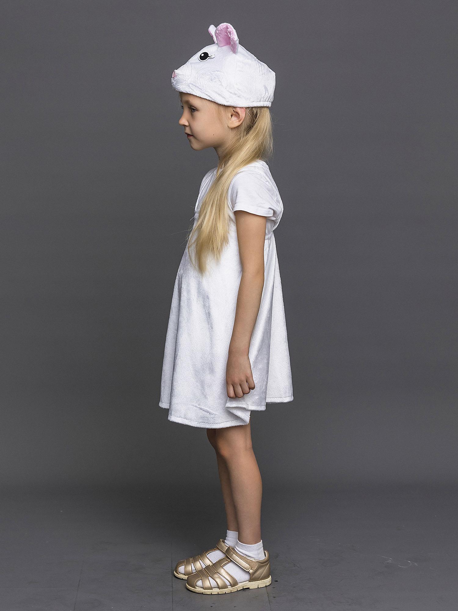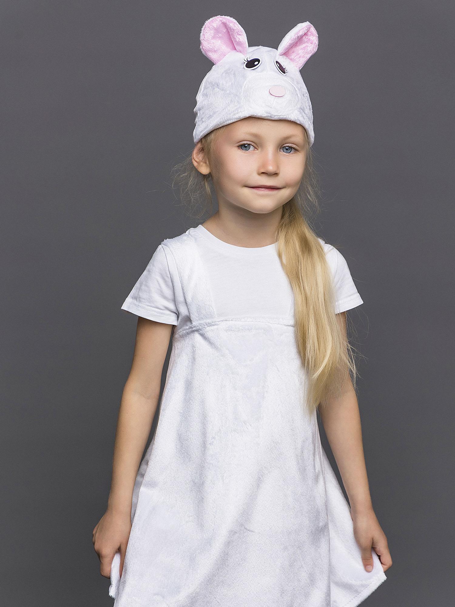 Костюм Мышонок Мисси детский белый из плюша прекрасно подойдет для новогодних утренников и спектаклей. Удобный и легкий костюм представлен в виде сарафана и маски-шапочки. Один универсальный размер на 4-6 лет.