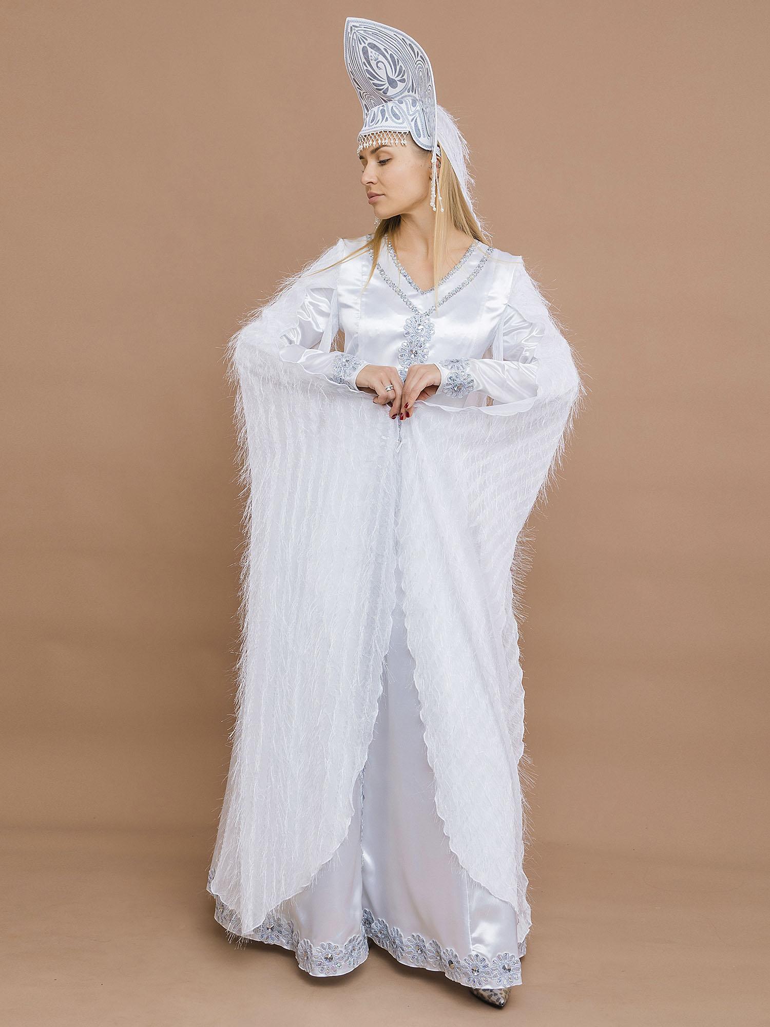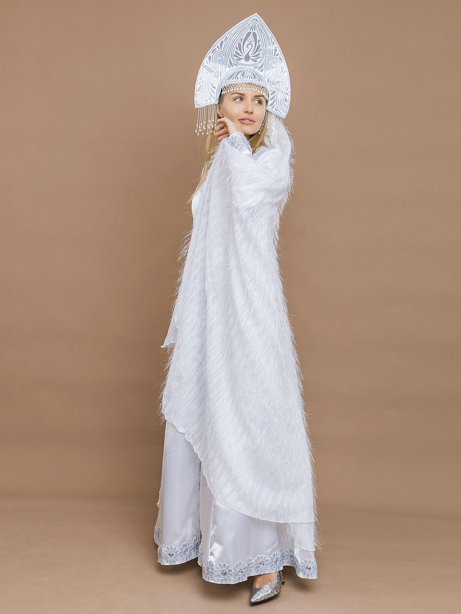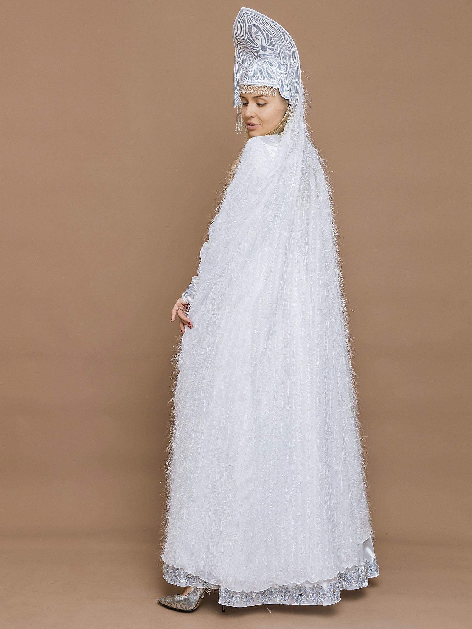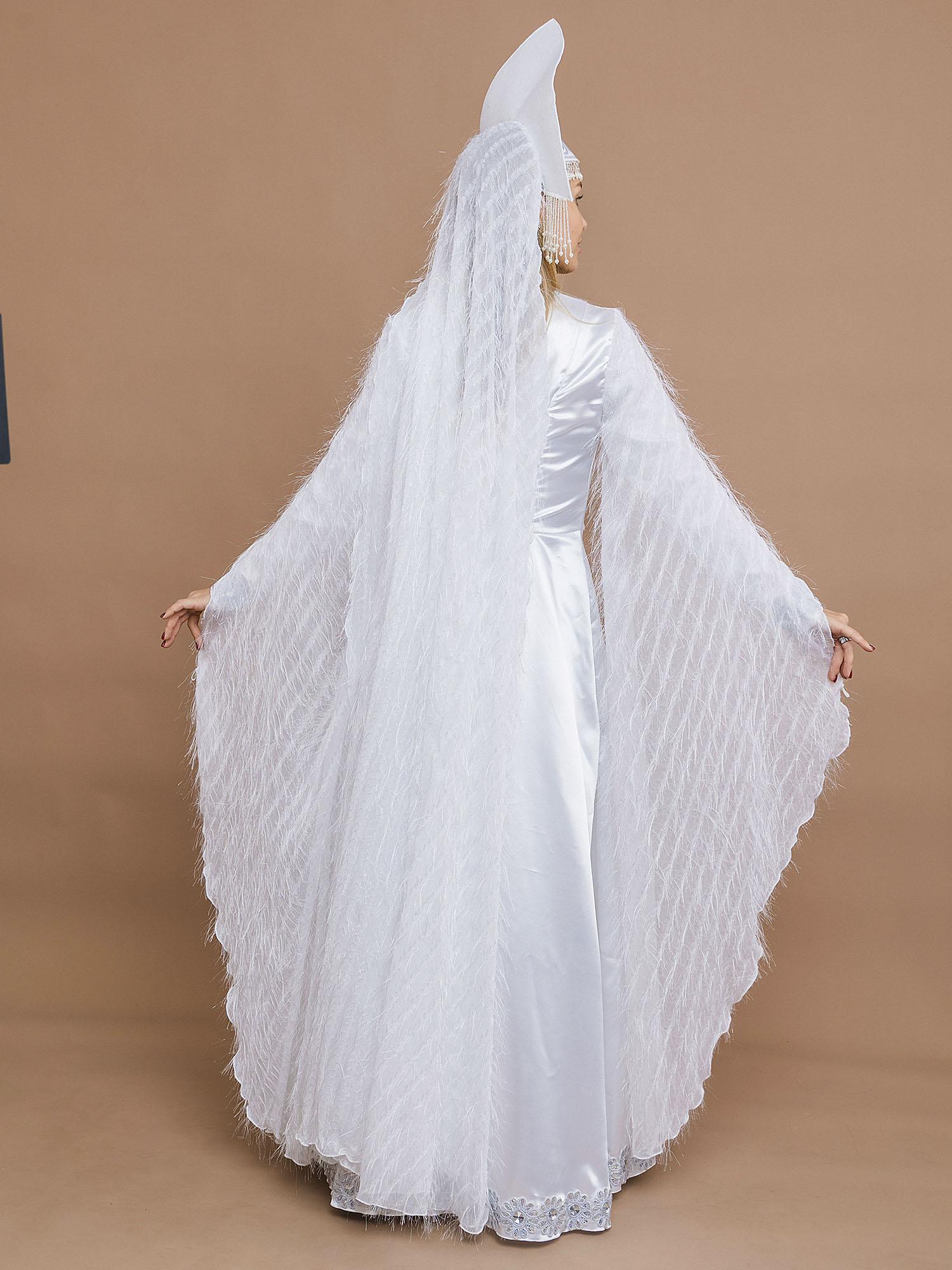 Карнавальный костюм Снегурочка Царевна-Лебедь — изящный образ для зимних праздников и новогодних выступлений. В комплект входит нарядное платье и кокошник с фатой, украшенный бахромой. Материалы: сатин и сетка, 100% полиэстер. Костюм выглядит празднично и нарядно, отлично подходит для создания сказочного образа Снегурочки.
