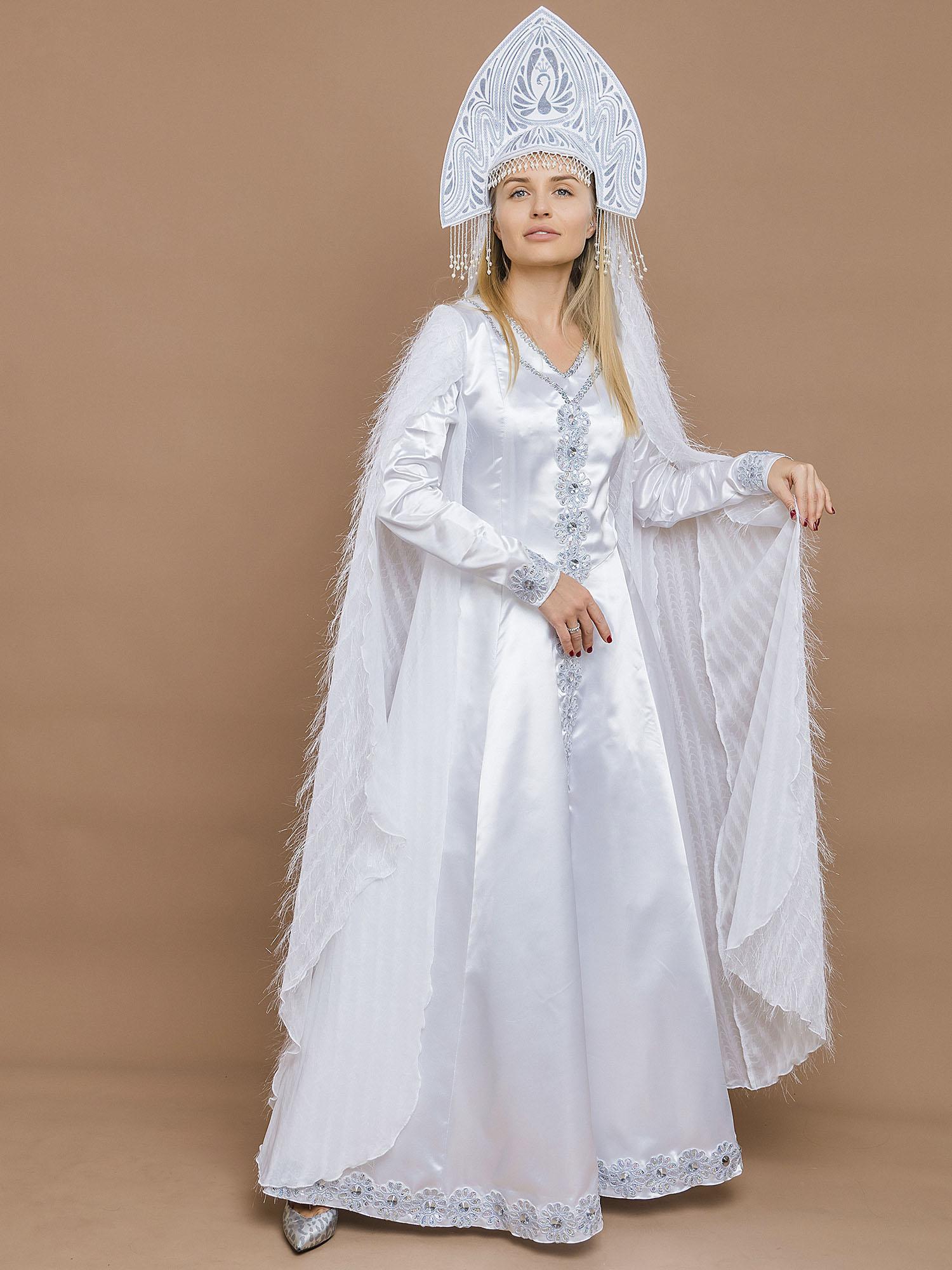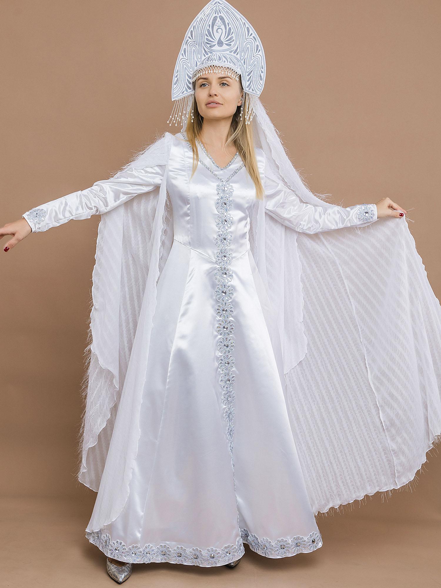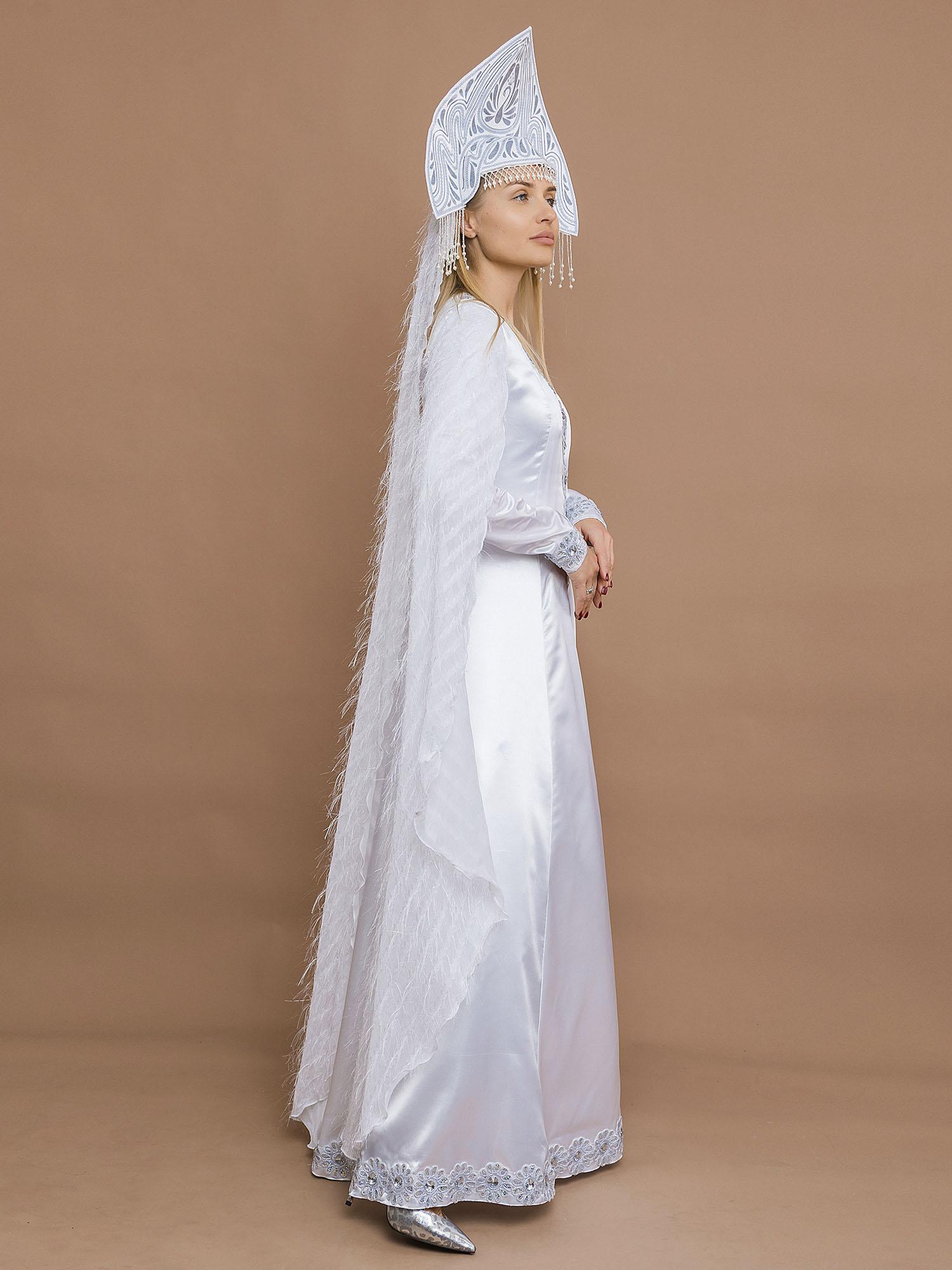 Карнавальный костюм Снегурочка Царевна-Лебедь — изящный образ для зимних праздников и новогодних выступлений. В комплект входит нарядное платье и кокошник с фатой, украшенный бахромой. Материалы: сатин и сетка, 100% полиэстер. Костюм выглядит празднично и нарядно, отлично подходит для создания сказочного образа Снегурочки.