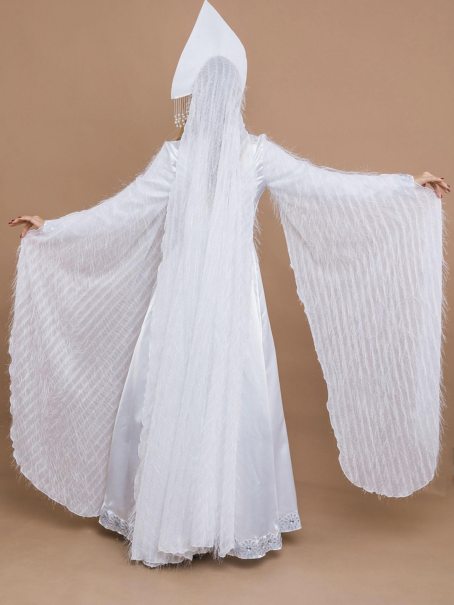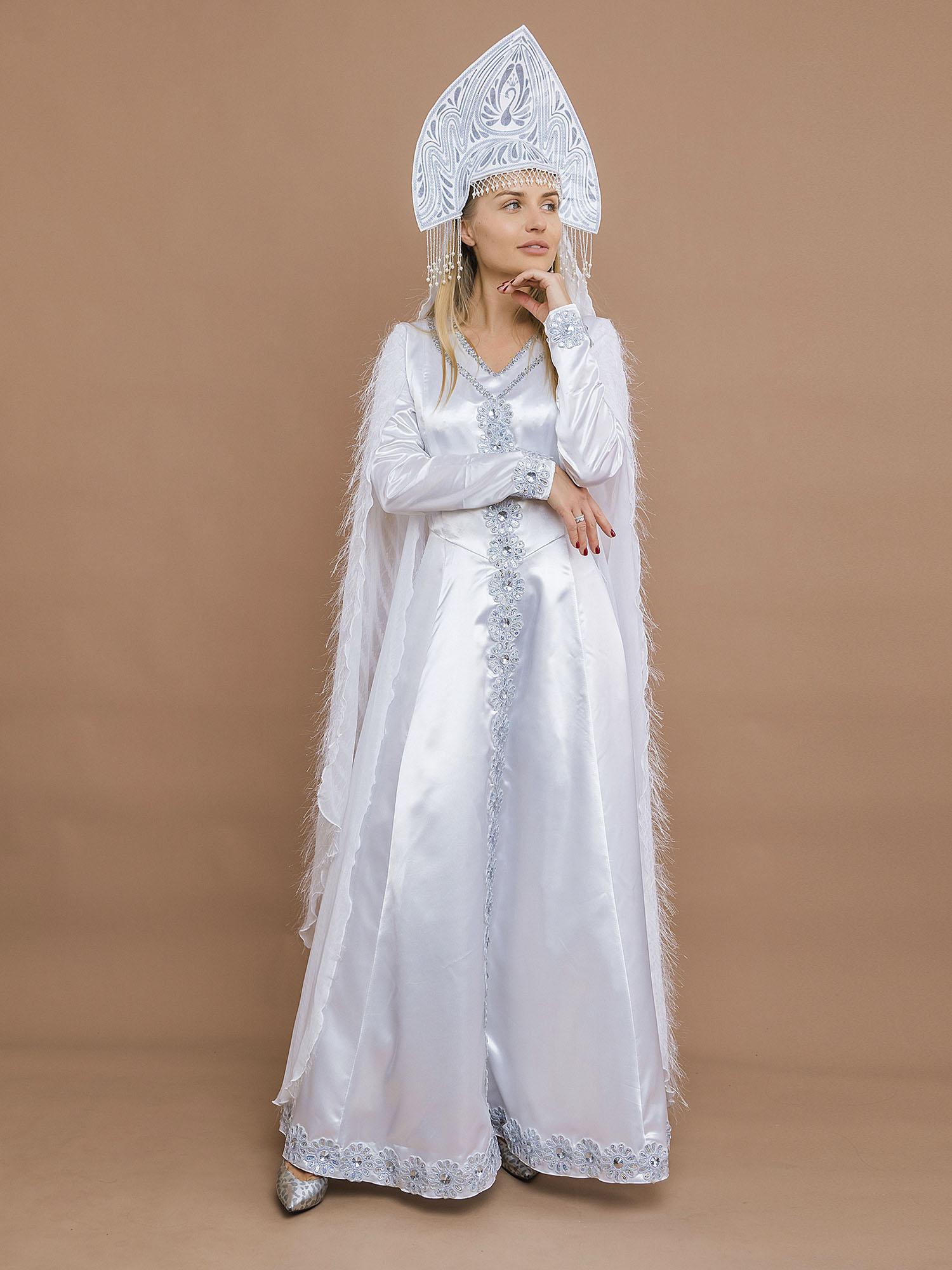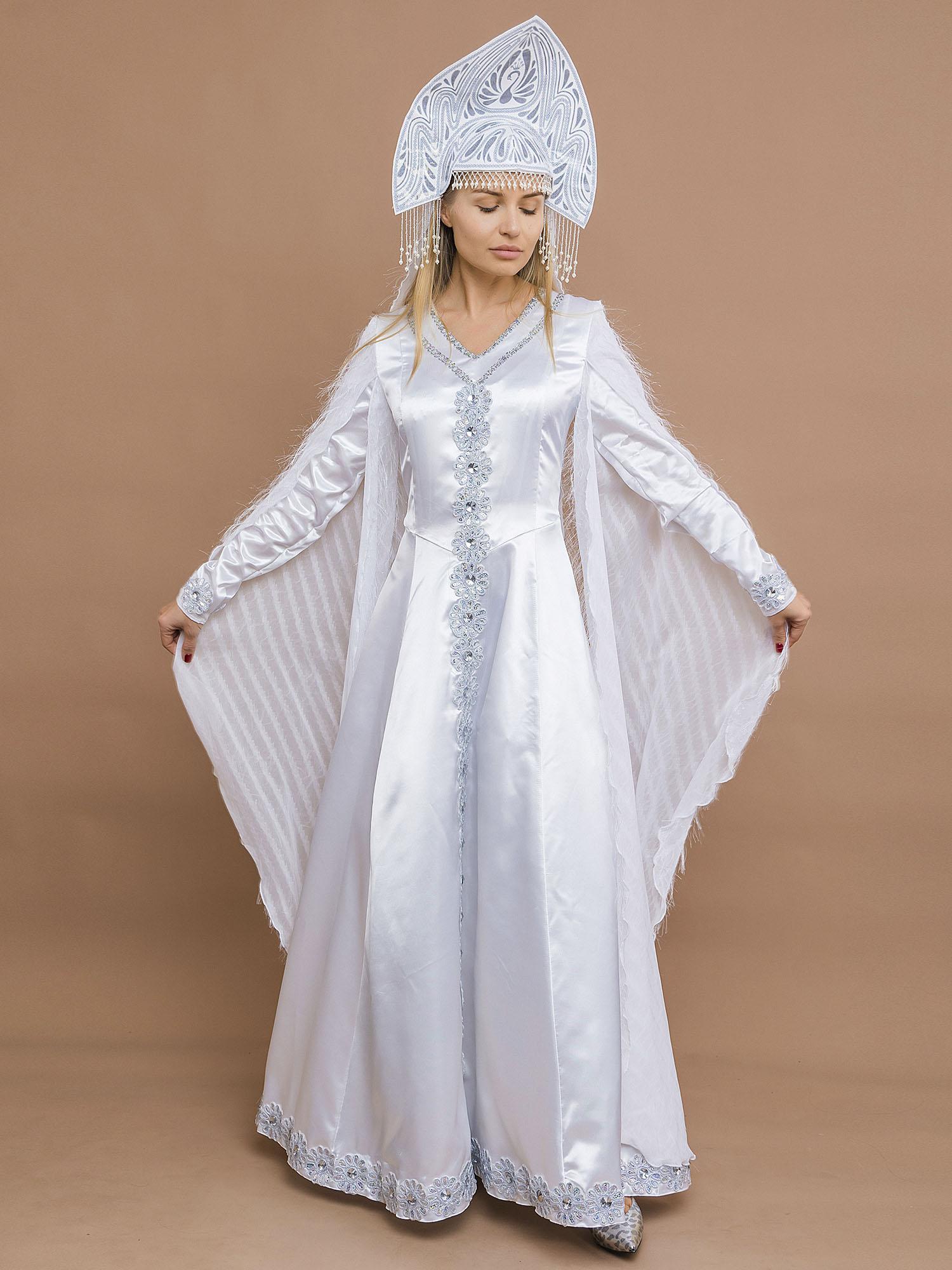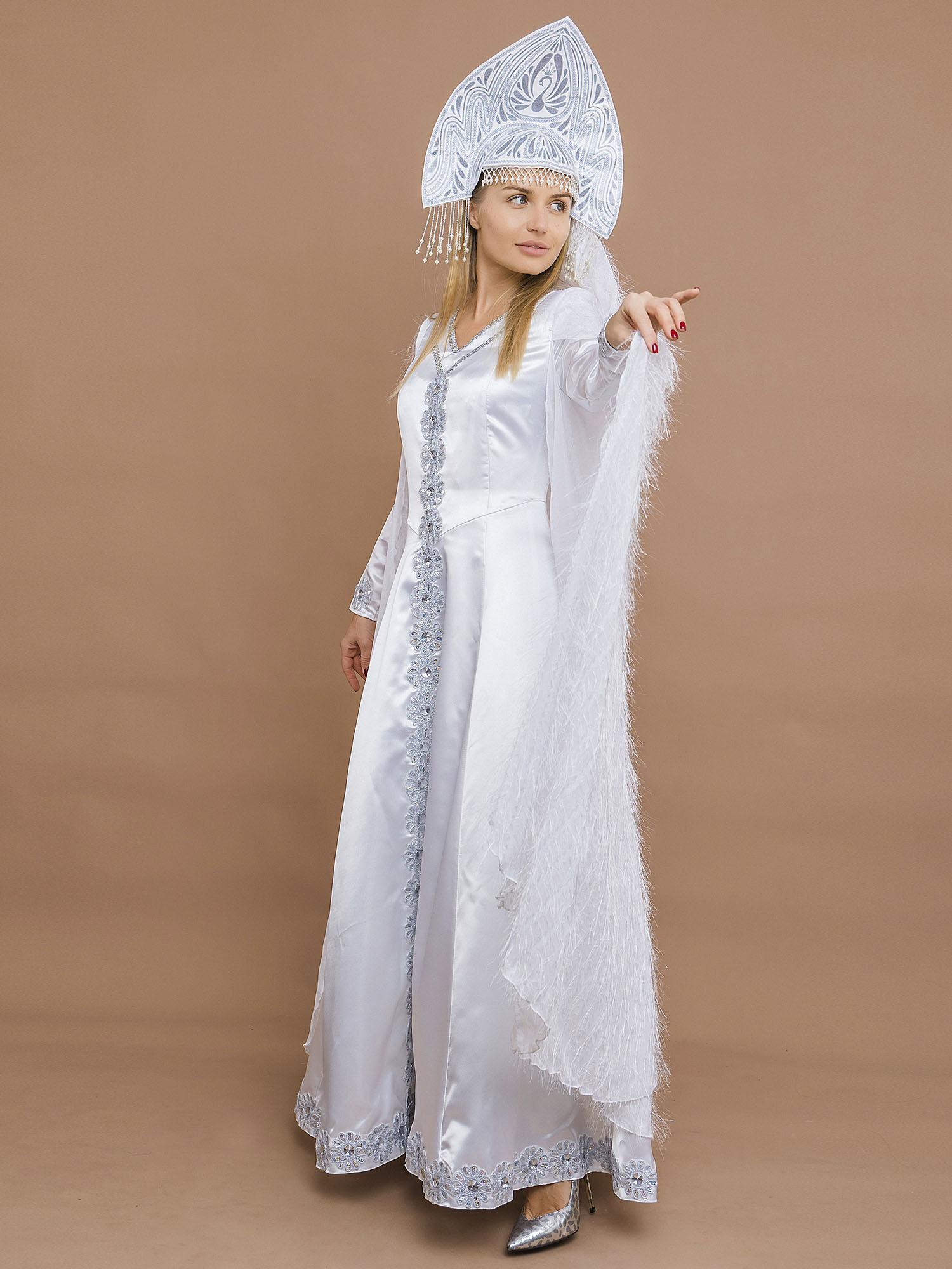 Карнавальный костюм Снегурочка Царевна-Лебедь — изящный образ для зимних праздников и новогодних выступлений. В комплект входит нарядное платье и кокошник с фатой, украшенный бахромой. Материалы: сатин и сетка, 100% полиэстер. Костюм выглядит празднично и нарядно, отлично подходит для создания сказочного образа Снегурочки.