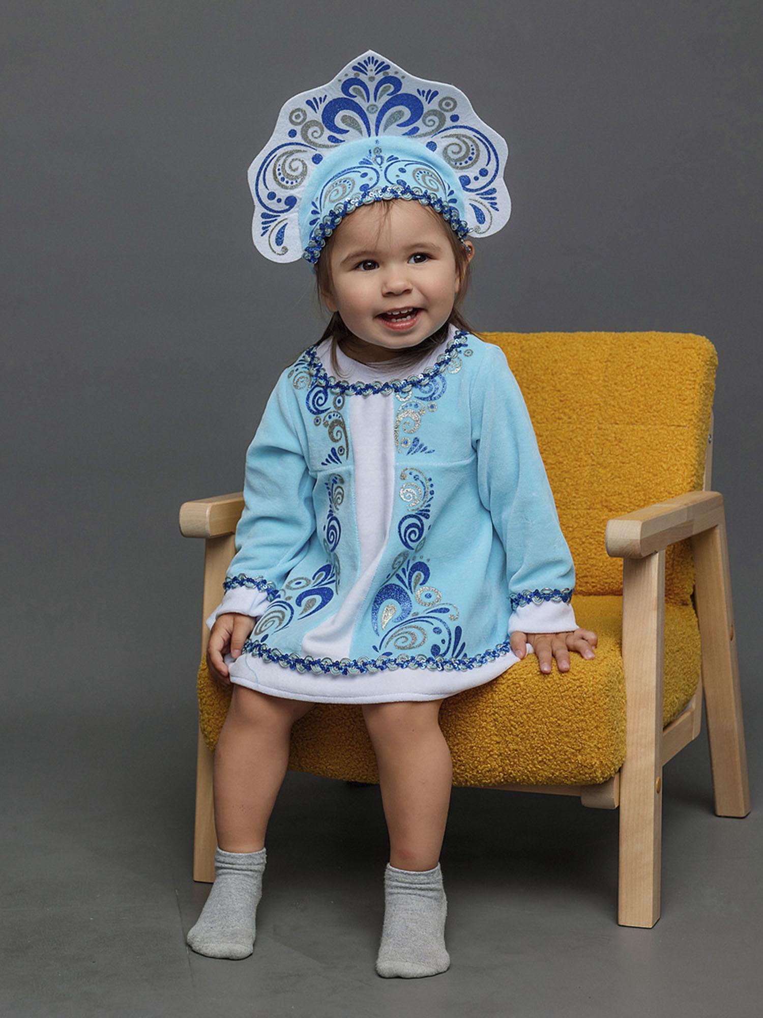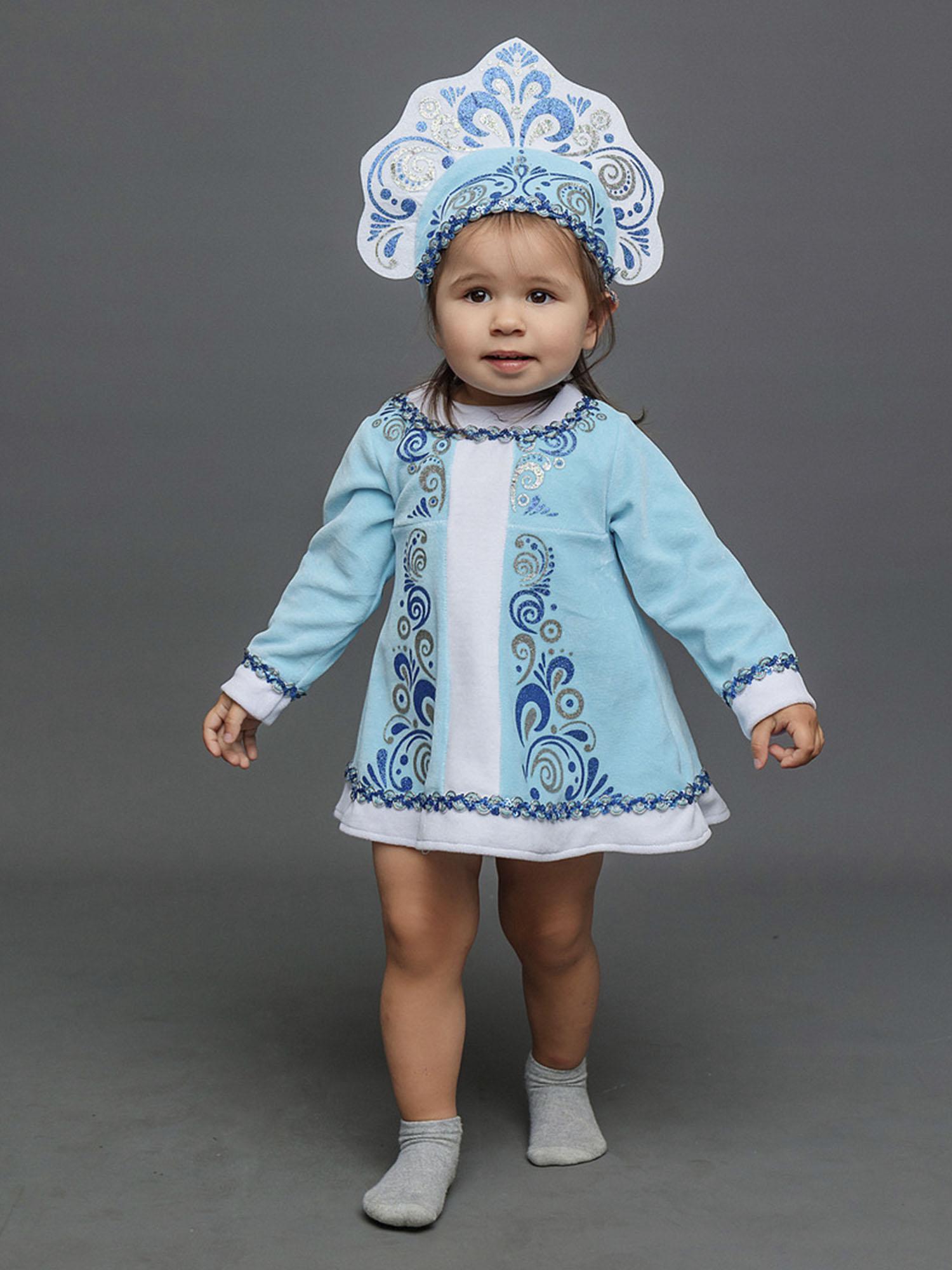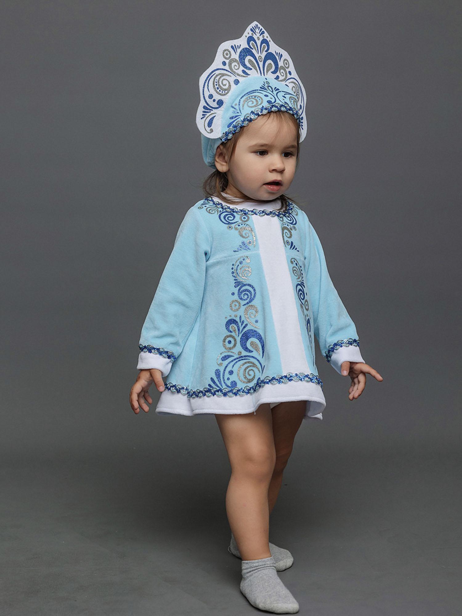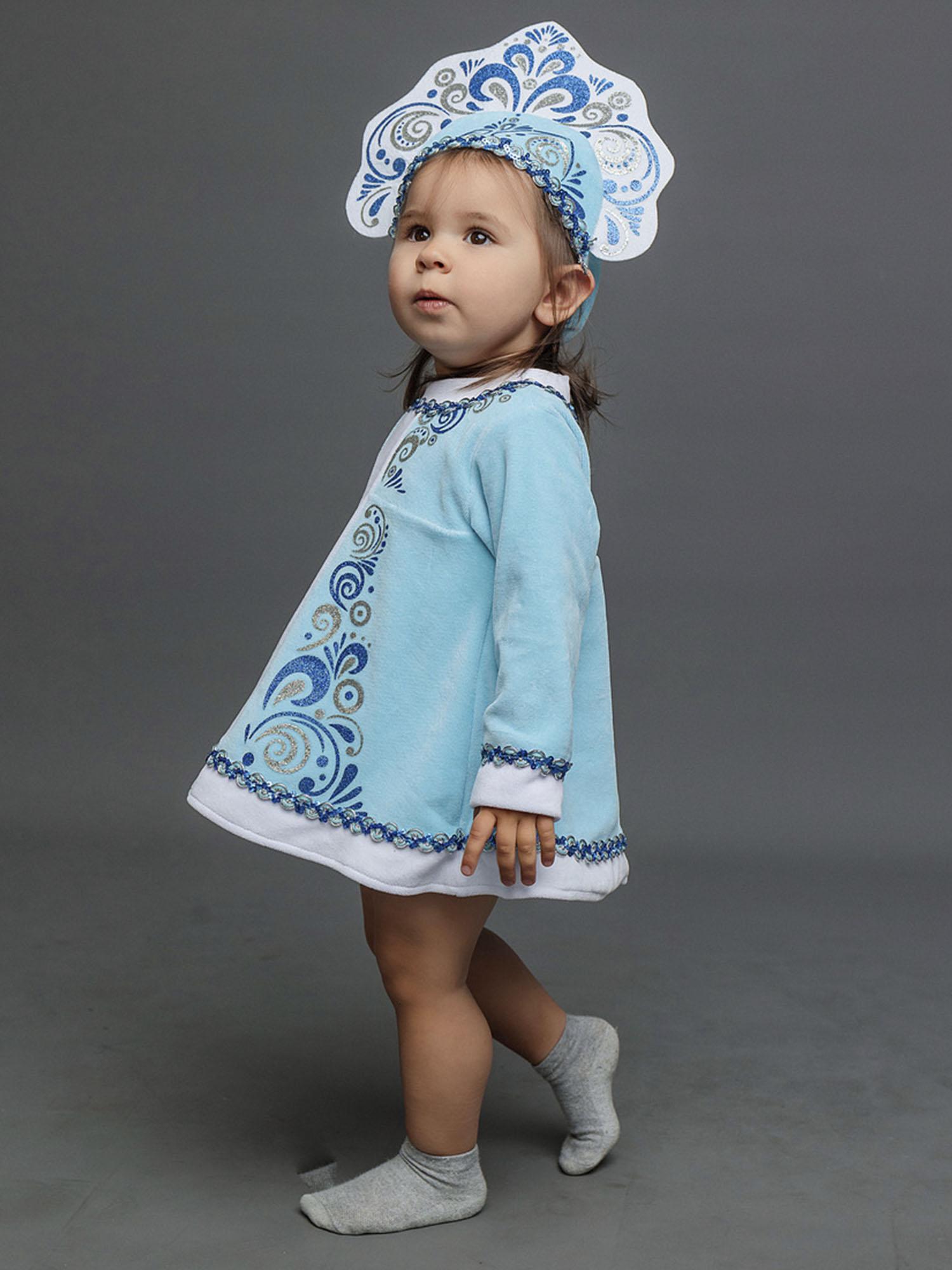 Детский новогодний костюм Снегурочки для девочек от 6 месяцев до 1,5 лет. Волшебный наряд в бело-голубом цвете представлен коротким платьем и кокошником.