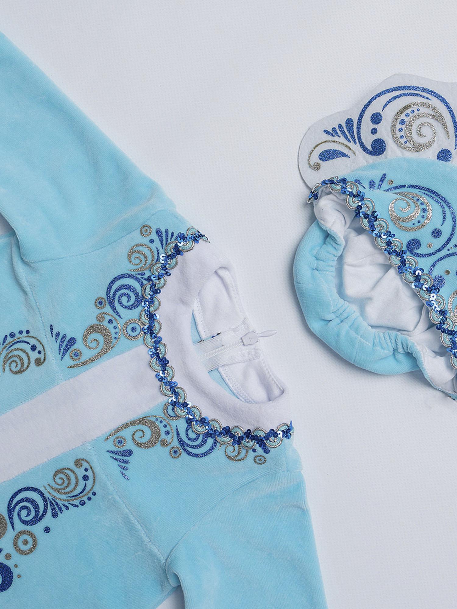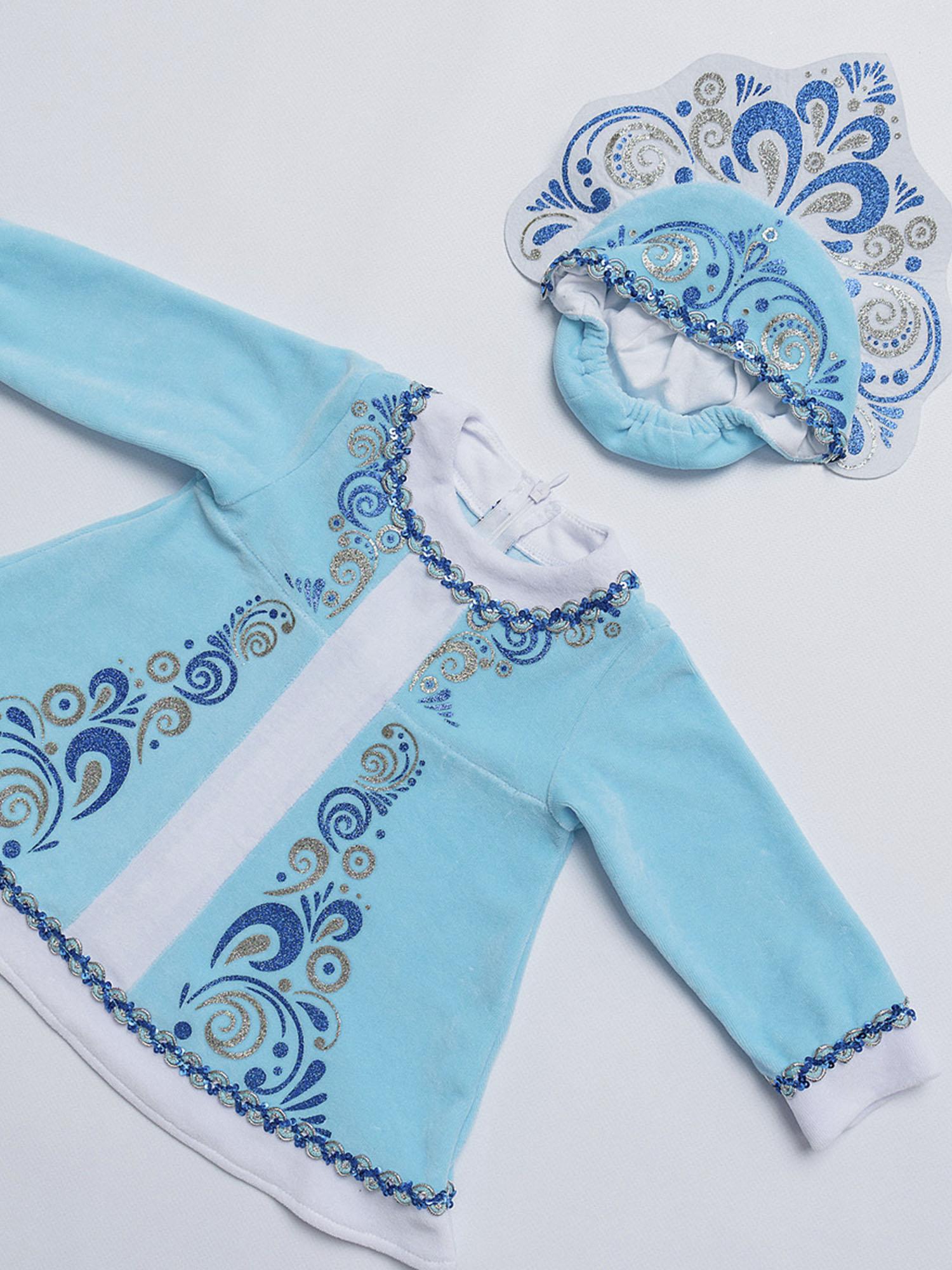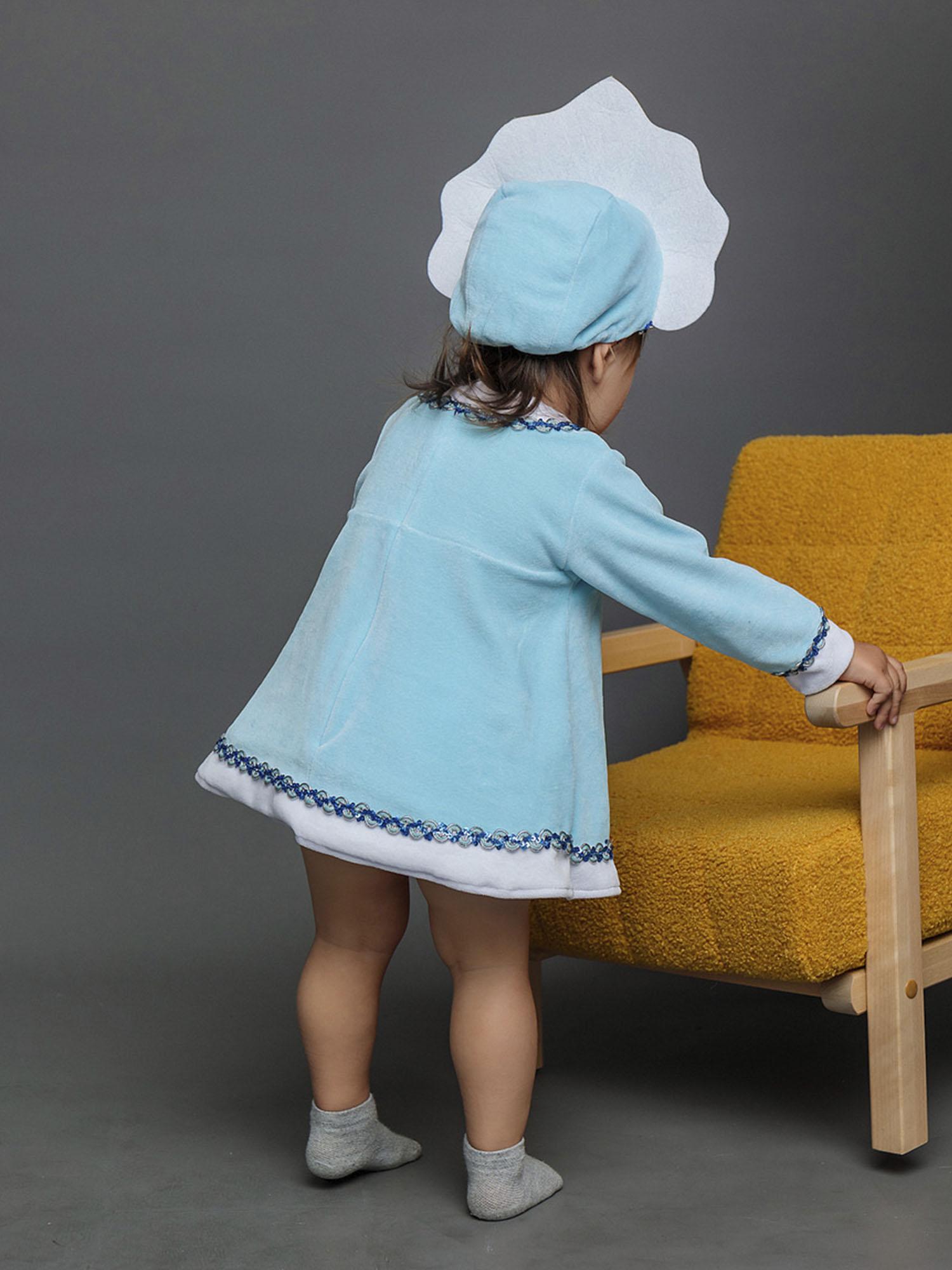 Детский новогодний костюм Снегурочки для девочек от 6 месяцев до 1,5 лет. Волшебный наряд в бело-голубом цвете представлен коротким платьем и кокошником.