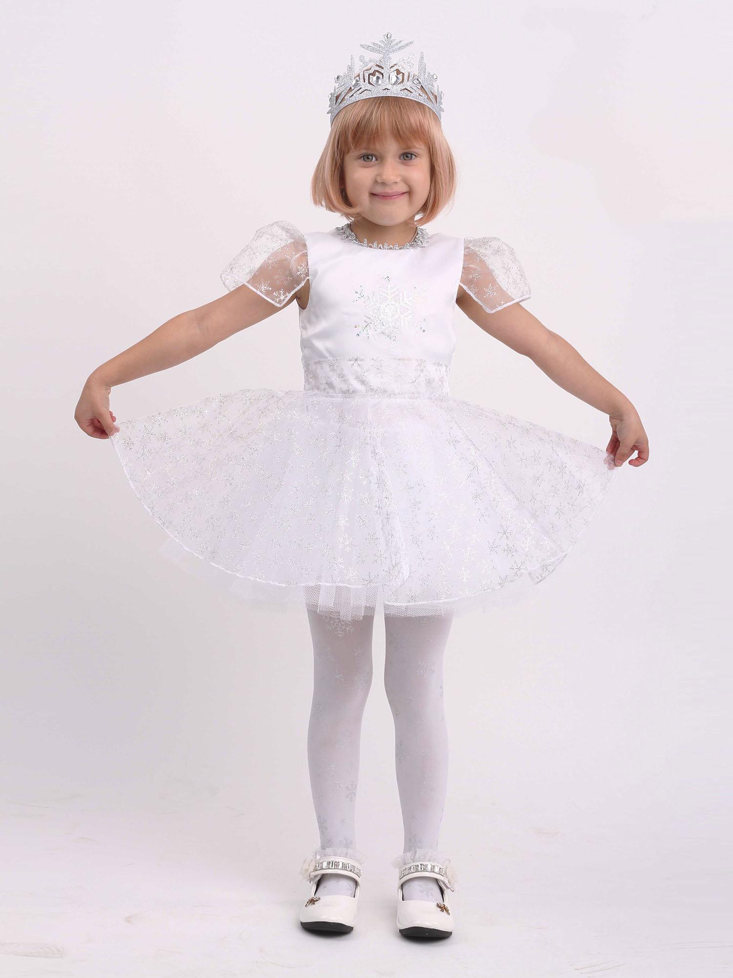 Костюм Снежинки детский для новогодних утренников и представлений станет прекрасным подарком девочке. Замечательный наряд белого цвета с блестящими узорами идеально подойдет для праздничных выступлений и танцев. Комплект костюма Снежинка Снежка состоит из короткого пышного платья и короны.