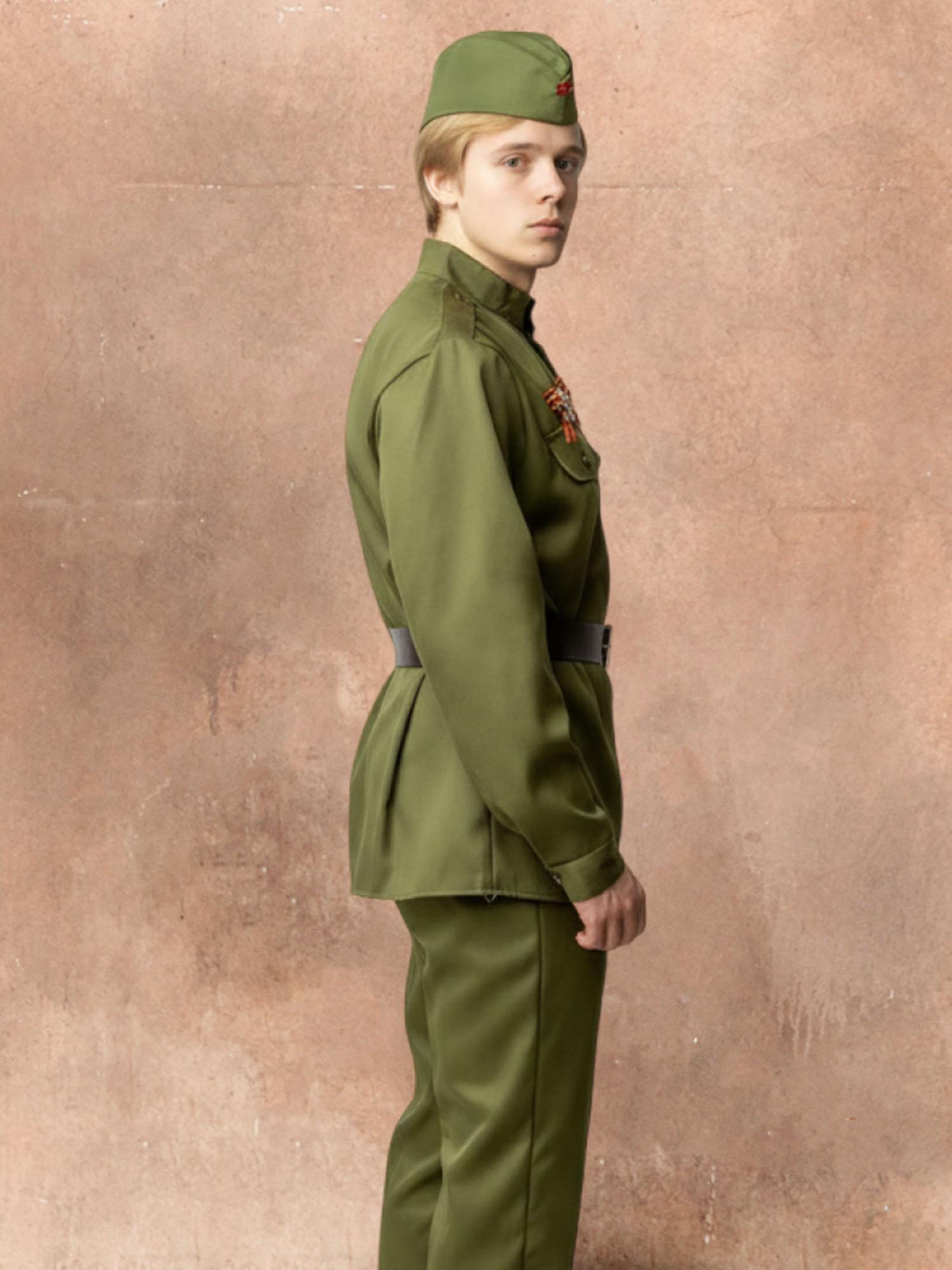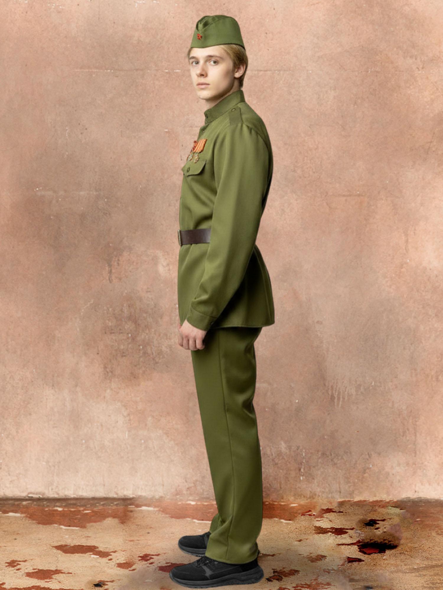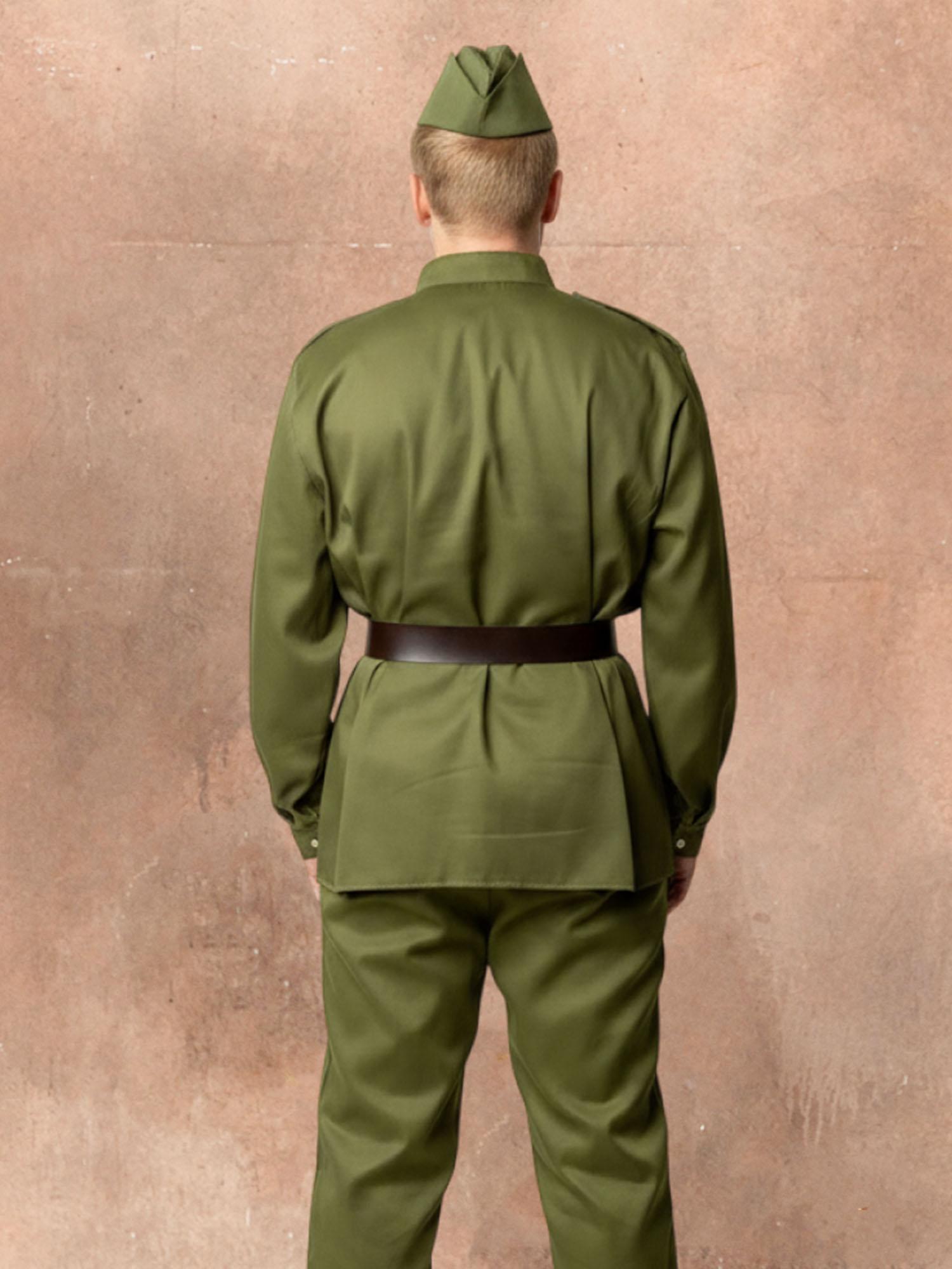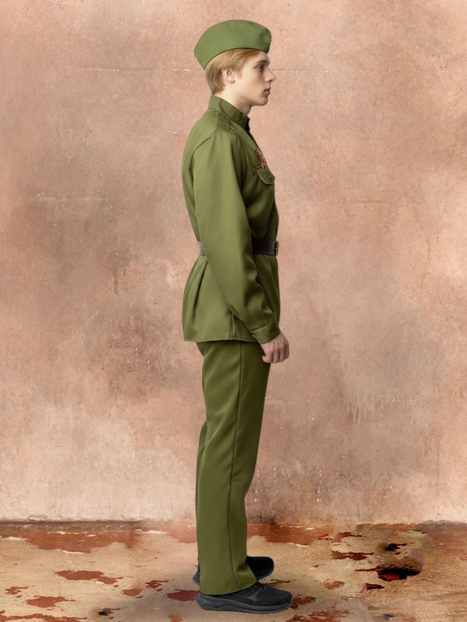 Костюм Солдата для взрослых на праздники 9 мая и 23 февраля – классический образ в советской стилистике. Красивая военная форма советского солдата подойдет для праздничных выступлений, шествия Бессмертного полка, а также поздравлений ветеранов. Комплект костюма Солдат состоит из гимнастерки, ремня, брюк и пилотки.