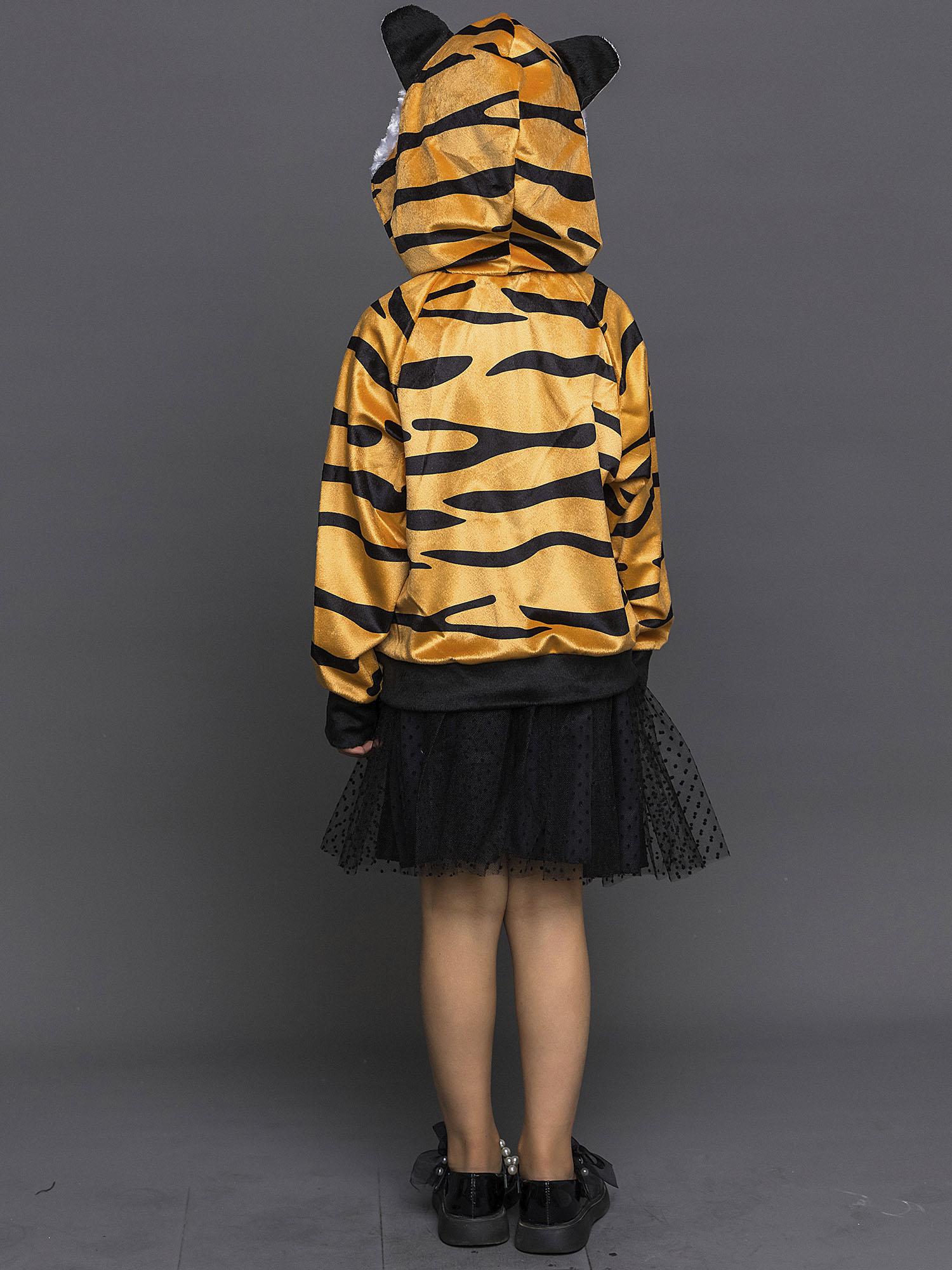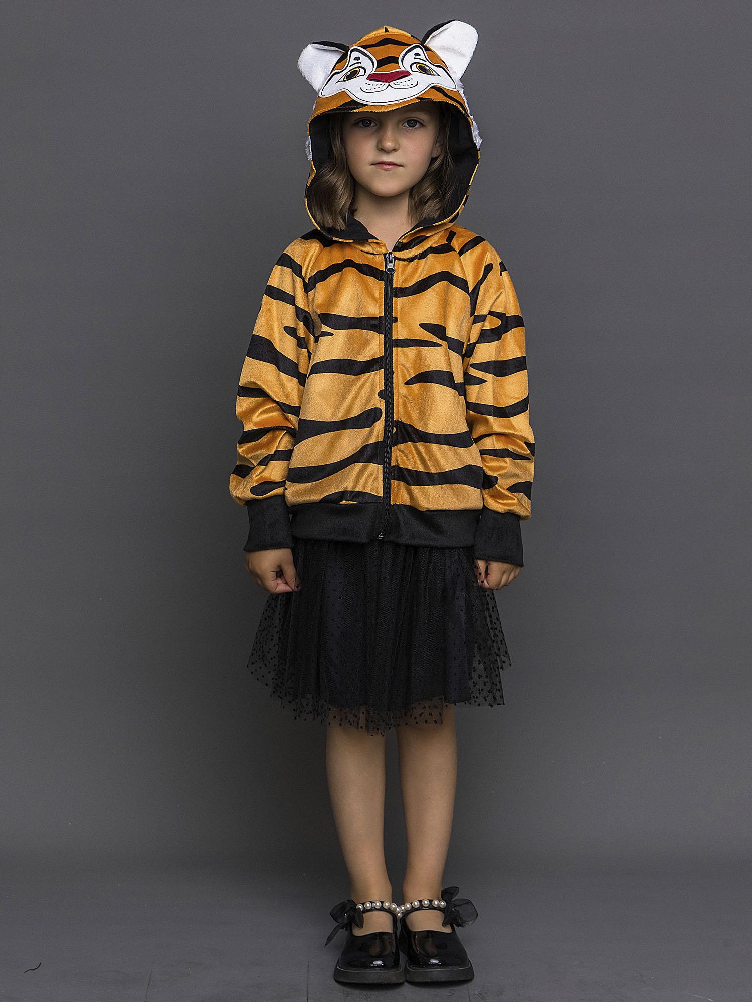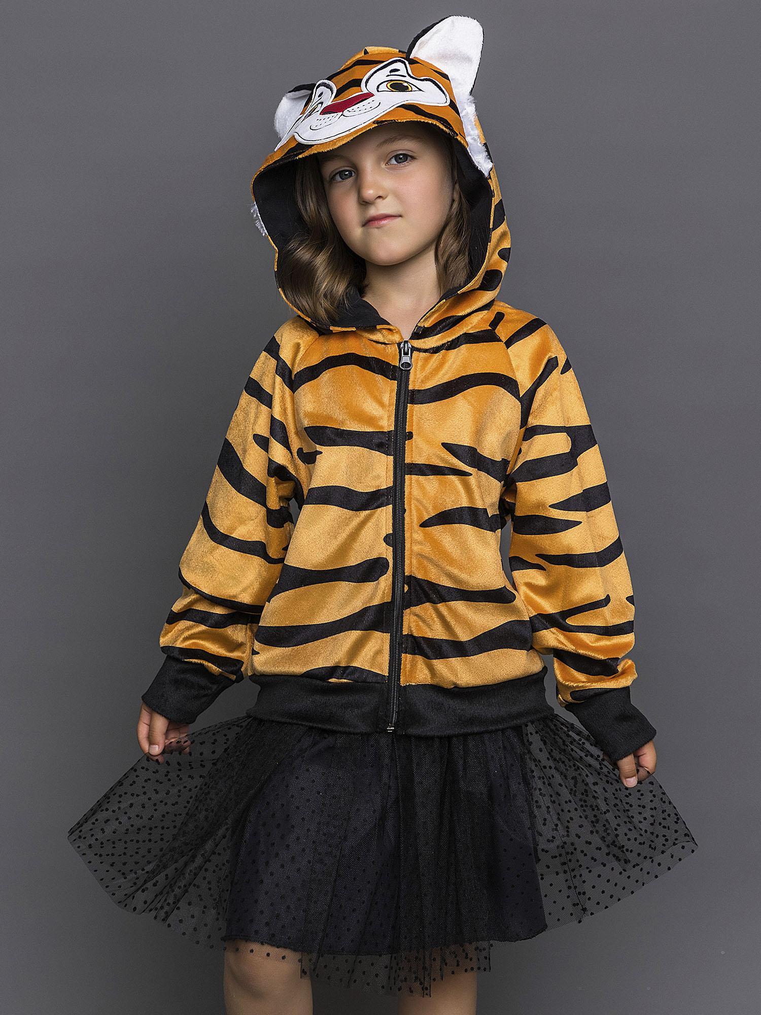 Костюм Тигренка для девочки 4-10 лет. Полосатая кофта с капюшоном и застежкой на молнию. Юбка черная пышная.