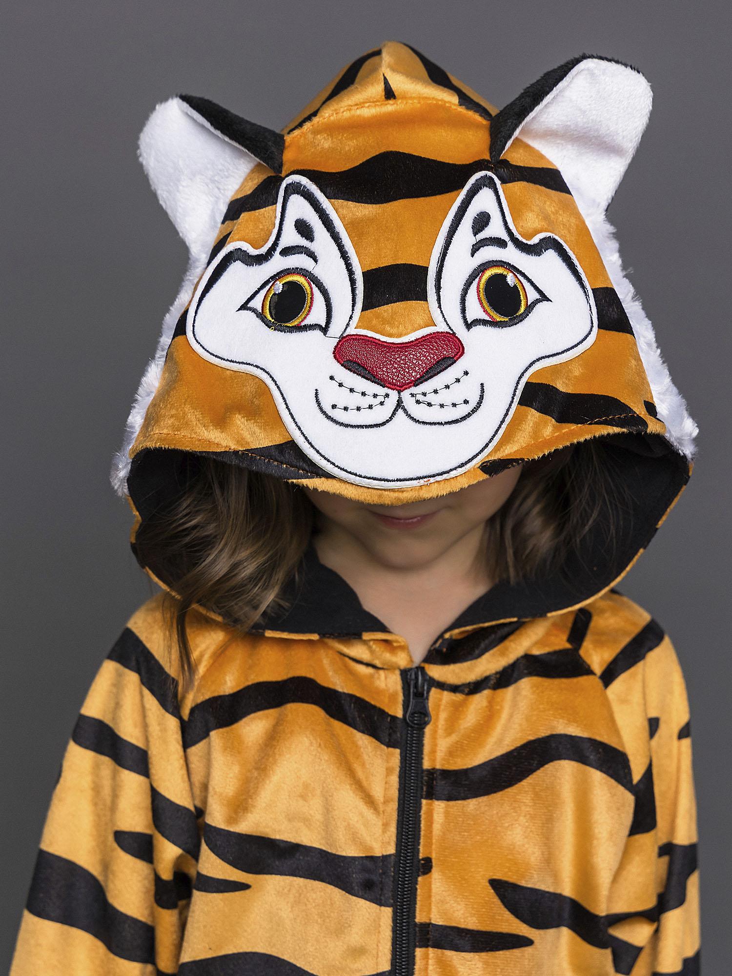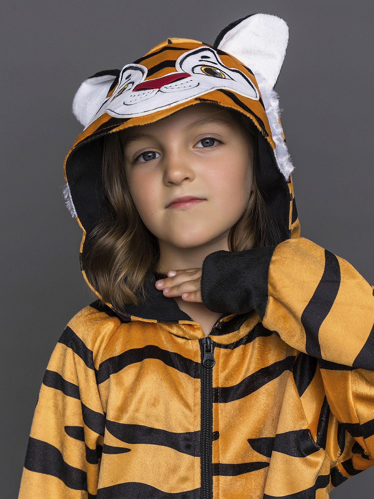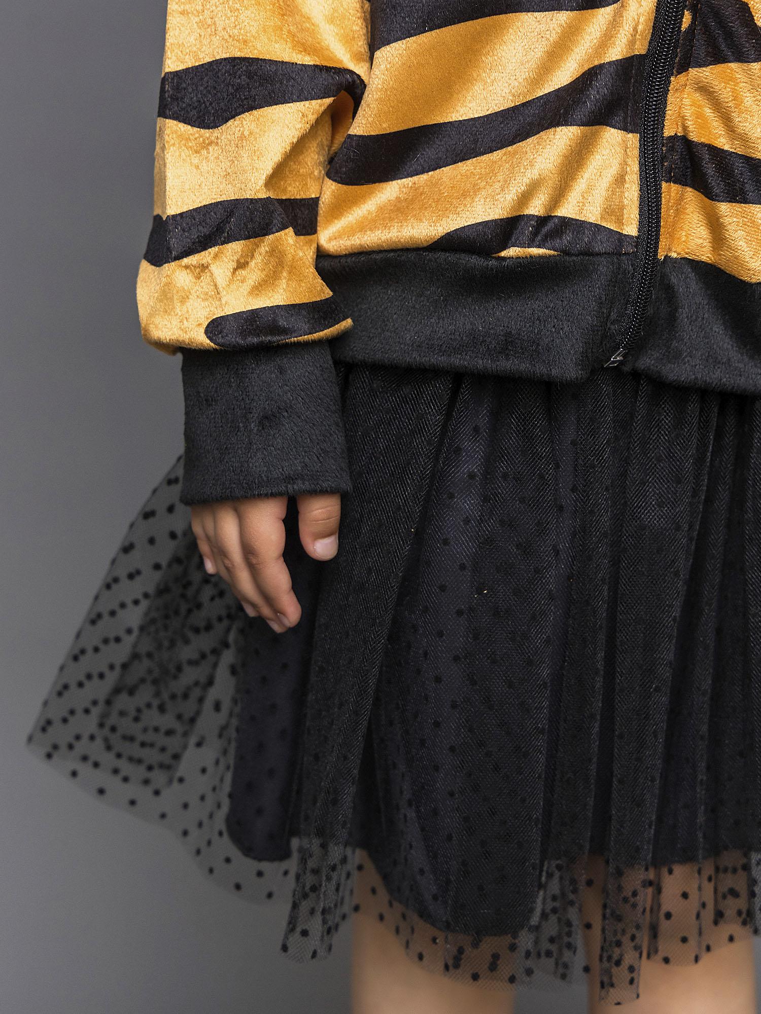Костюм Тигренка для девочки 4-10 лет. Полосатая кофта с капюшоном и застежкой на молнию. Юбка черная пышная.