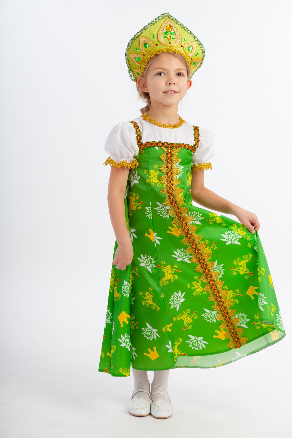 Карнавальный костюм для спектаклей и выступлений Царевна-Лягушка имеет множество отсылок к этой волшебной сказочной героине. Это и насыщенный зеленый цвет, и принт в виде лягушек на сарафане. Также образ отлично подойдет для бала-маскарада и новогодней елки. В комплекте наряда вы найдете платье и кокошник.