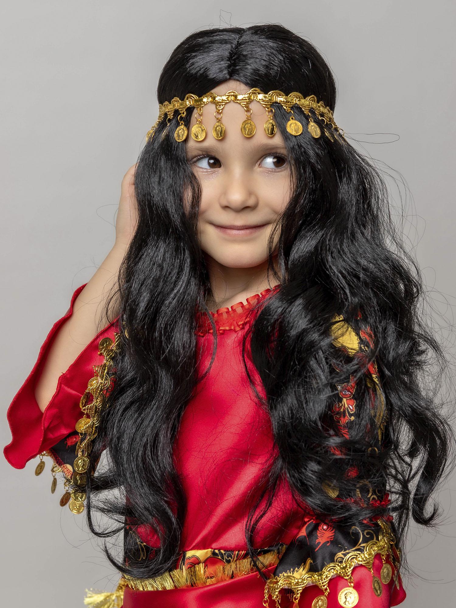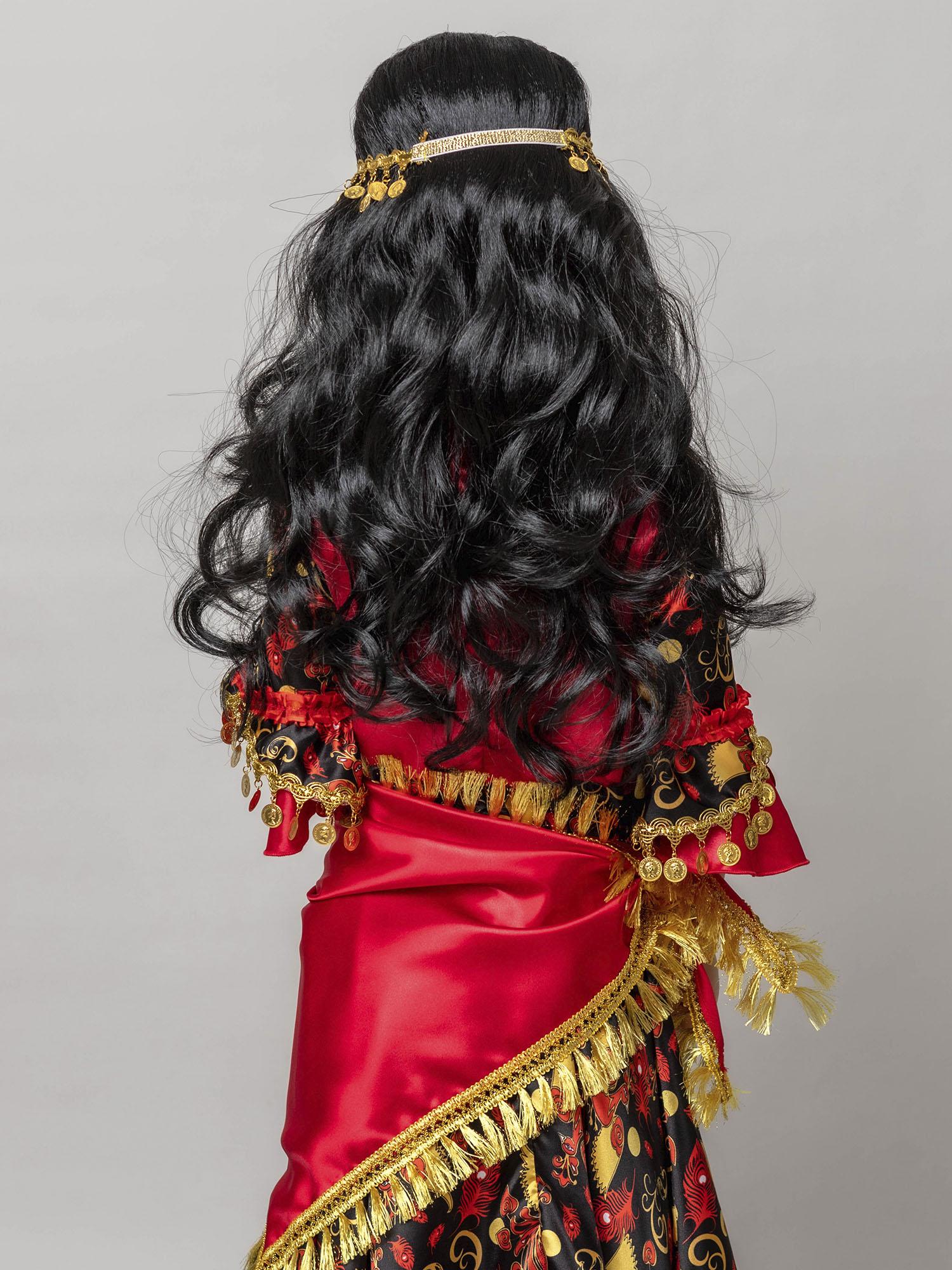 Карнавальный костюм Цыганка Рада - воплощение популярного образа цыганки. Эта героиня привносит нотку тайны и волшебства, где бы она не появилась. Красивая и хитрая Цыганка Рада порадует окружающих и выделит девочку среди подруг. Образ надолго останется в памяти, как один из самых ярких на празднике. Костюм состоит из длинного платья, косынки, парика и повязки. Платье имеет застежку-молнию на спине, остальные детали костюма эффектно дополняют карнавальный наряд. Особенности: - Широкий подол платья - Красный и зеленый цвет - Подол украшен изображениями красных цветов - Оборки на рукавах - С красным цветком на груди - Косынка красного цвета - Темный парик с длинными кудрявыми волосами - Золотые монисты на повязке завершают образ.