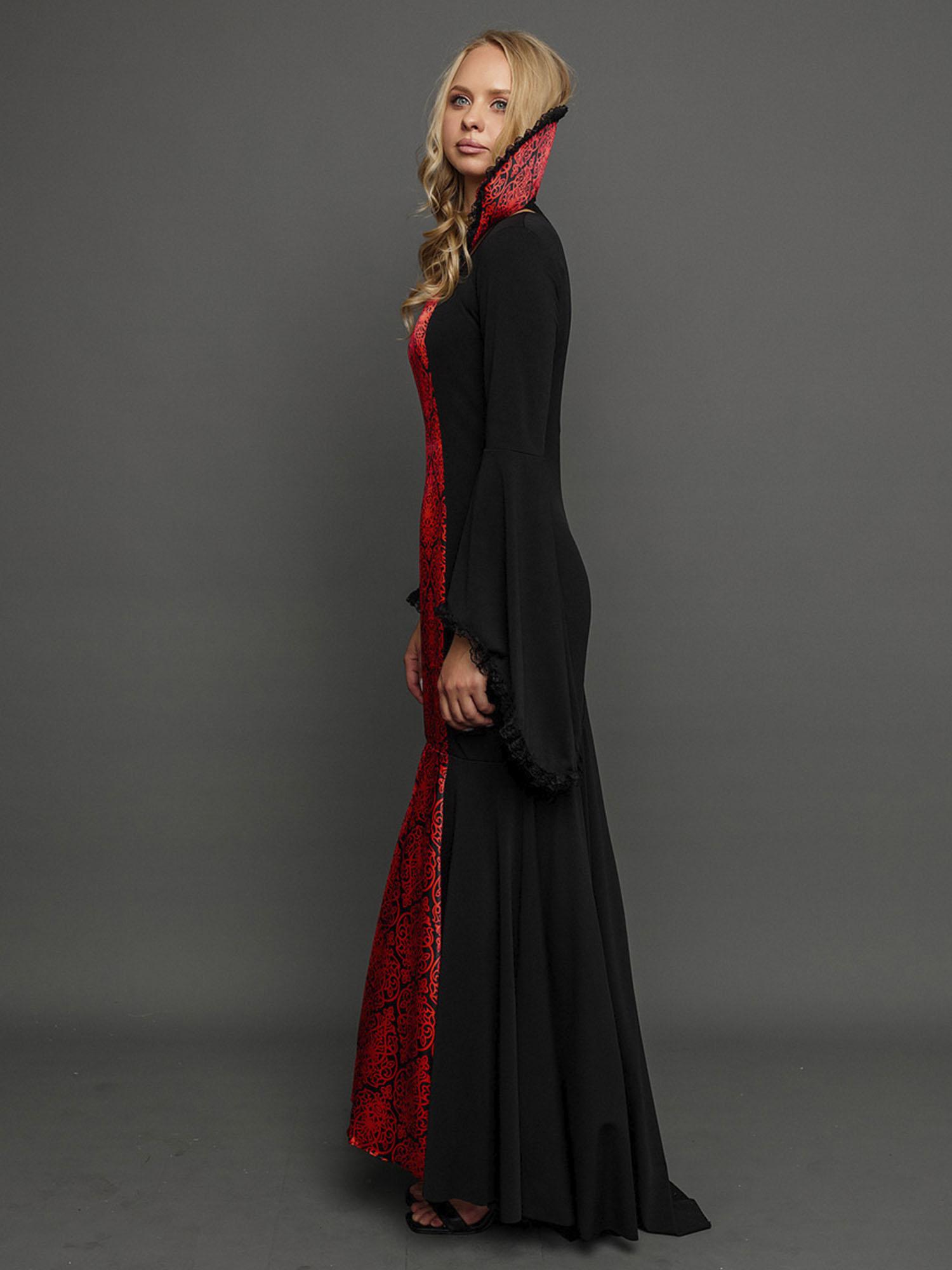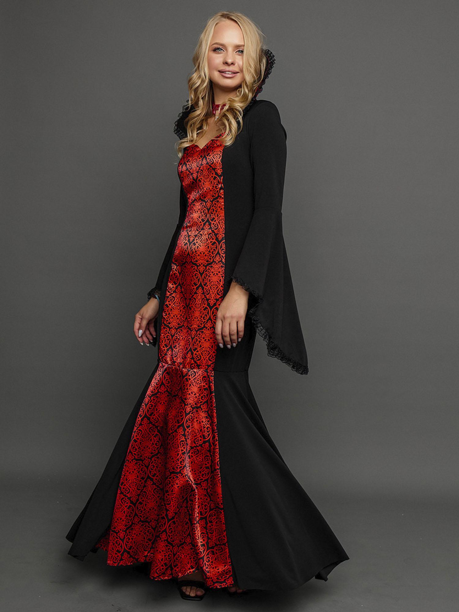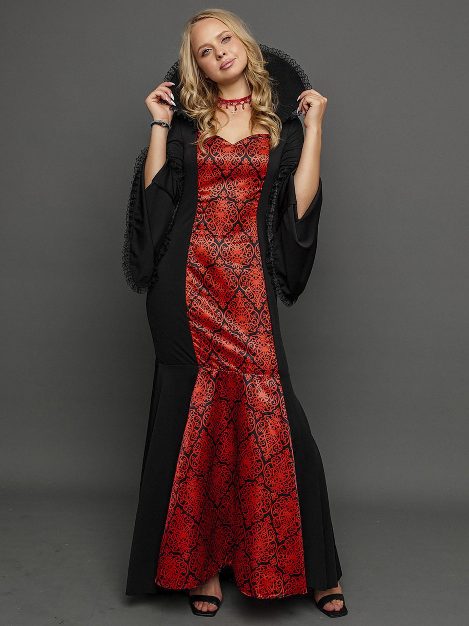 Карнавальный костюм Вампирша для взрослых представляет собой длинное черное платье с яркой вставкой по середине. Воротник-стойка и длинные рукава оторочены кружевом. Костюм Вампирши в готическом стиле взрослый женский подойдет на Хэллоуин, для вечеринки и спектакля.