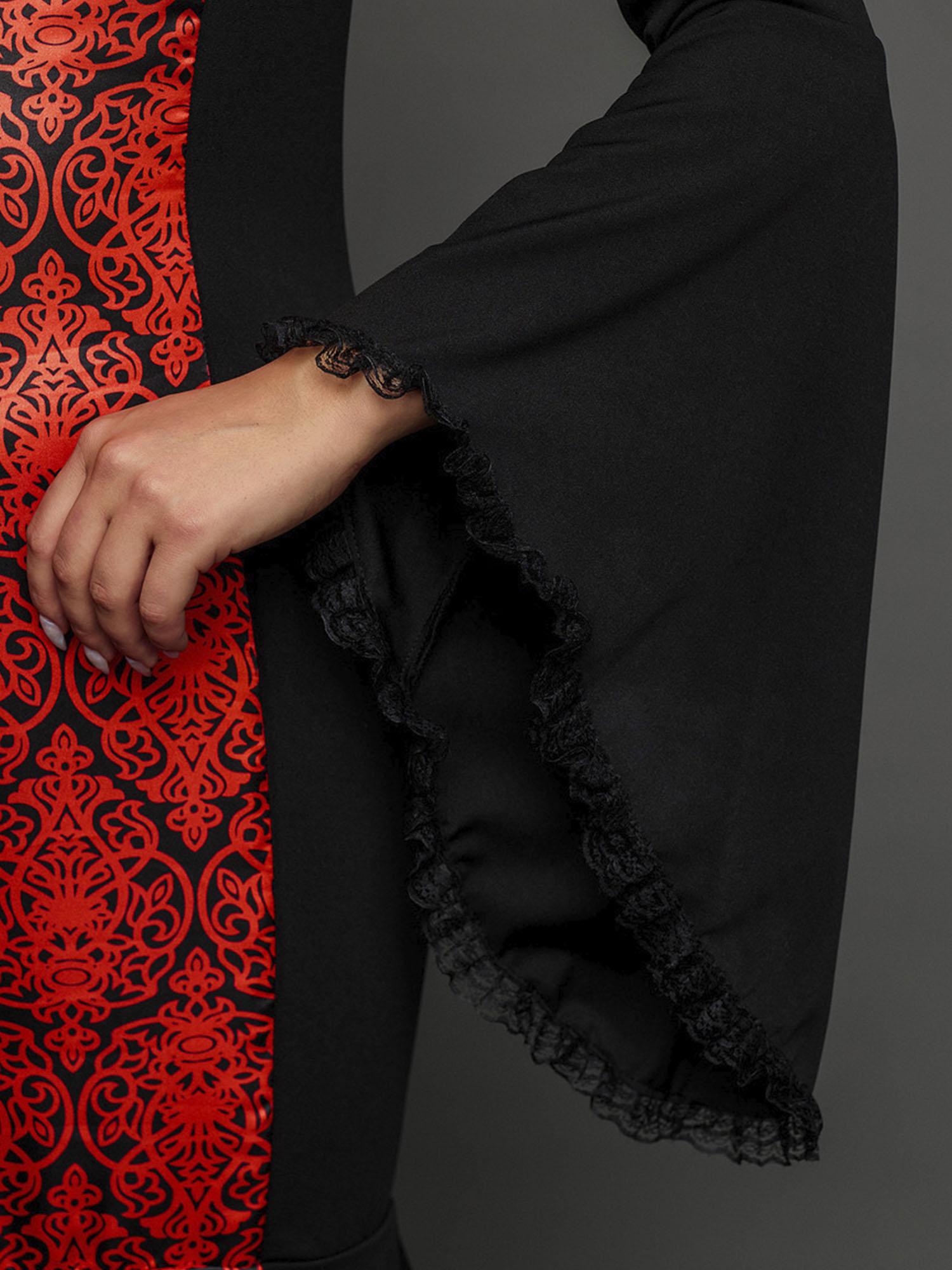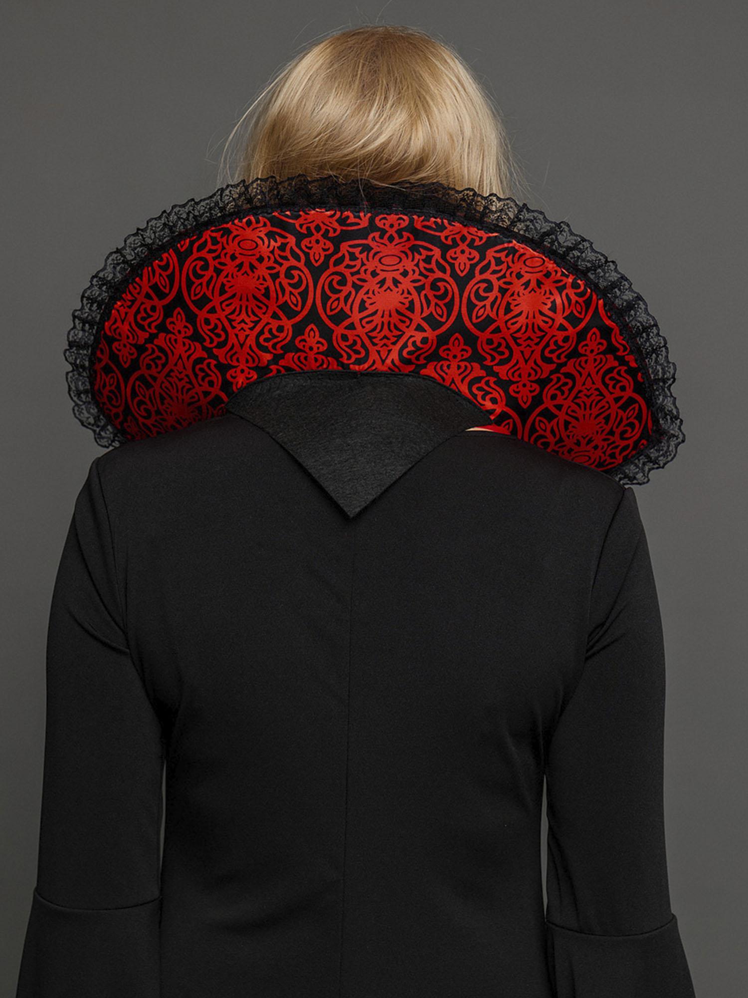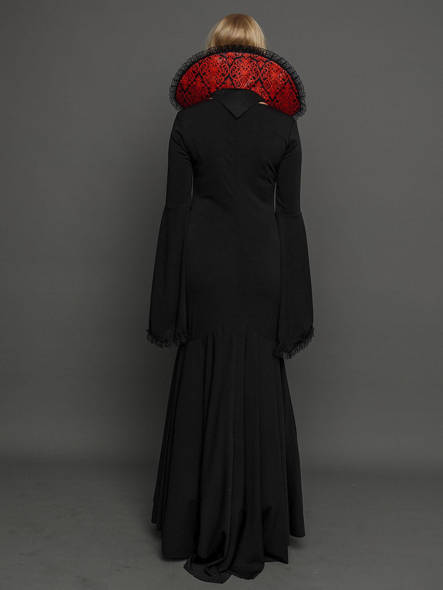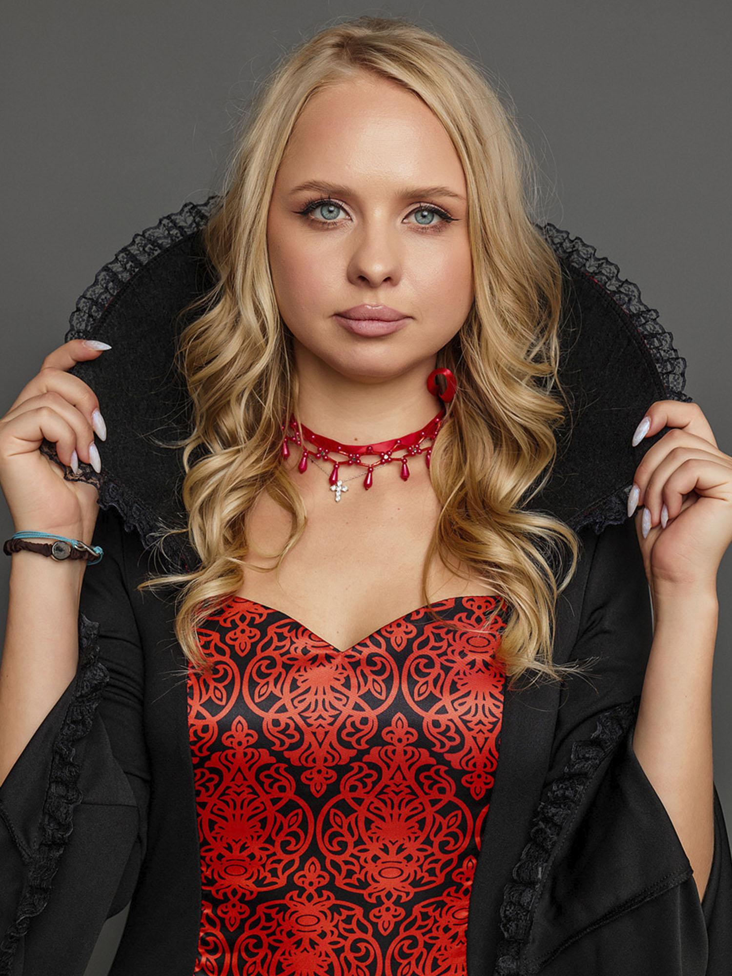 Карнавальный костюм Вампирша для взрослых представляет собой длинное черное платье с яркой вставкой по середине. Воротник-стойка и длинные рукава оторочены кружевом. Костюм Вампирши в готическом стиле взрослый женский подойдет на Хэллоуин, для вечеринки и спектакля.