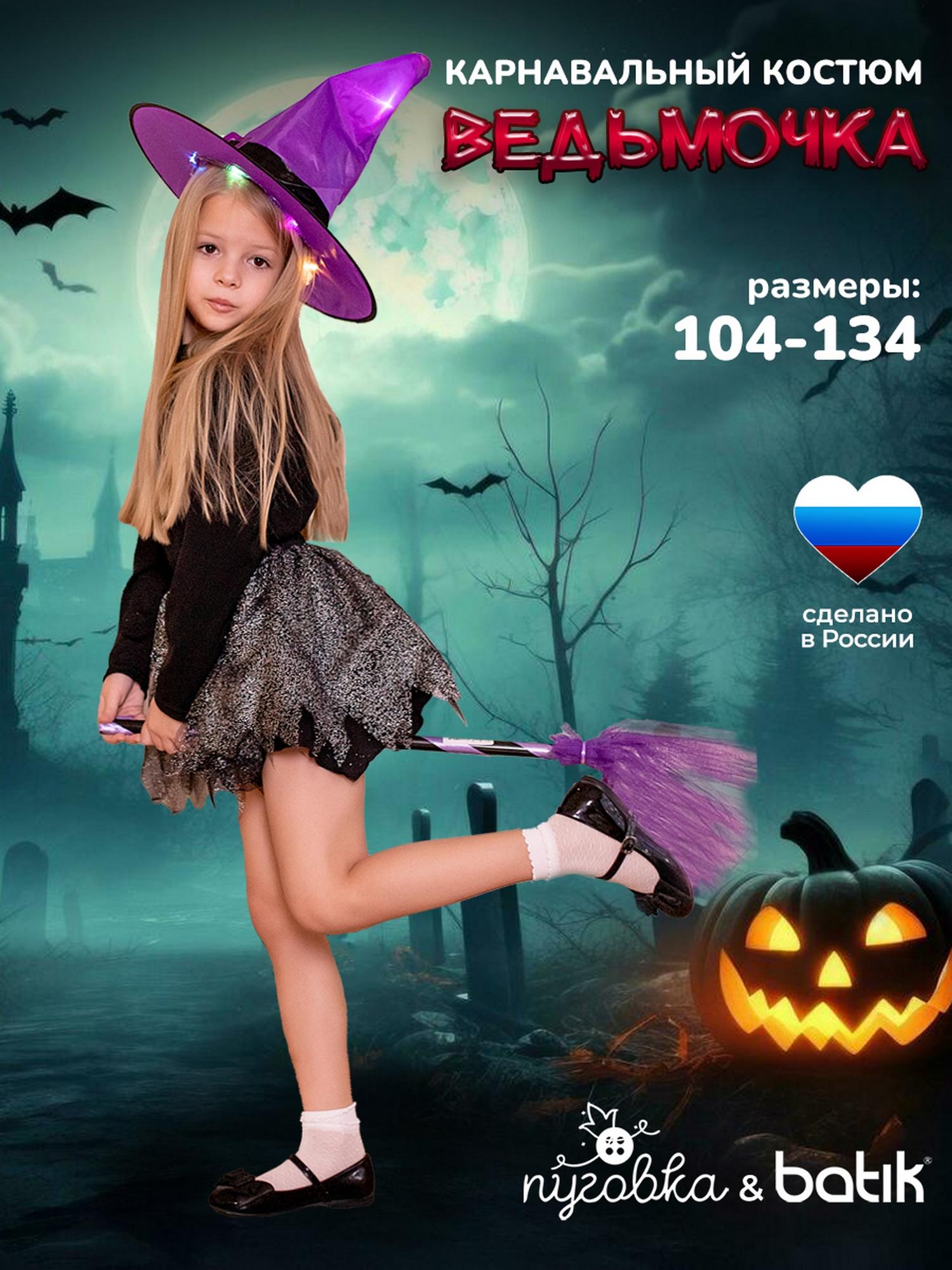 Костюм Ведьмы с метлой детский на Хэллоуин и тематические праздники. В комплекте юбка, шляпа со светодиодами, метла с сеткой. Юбка блестящая на резинке.