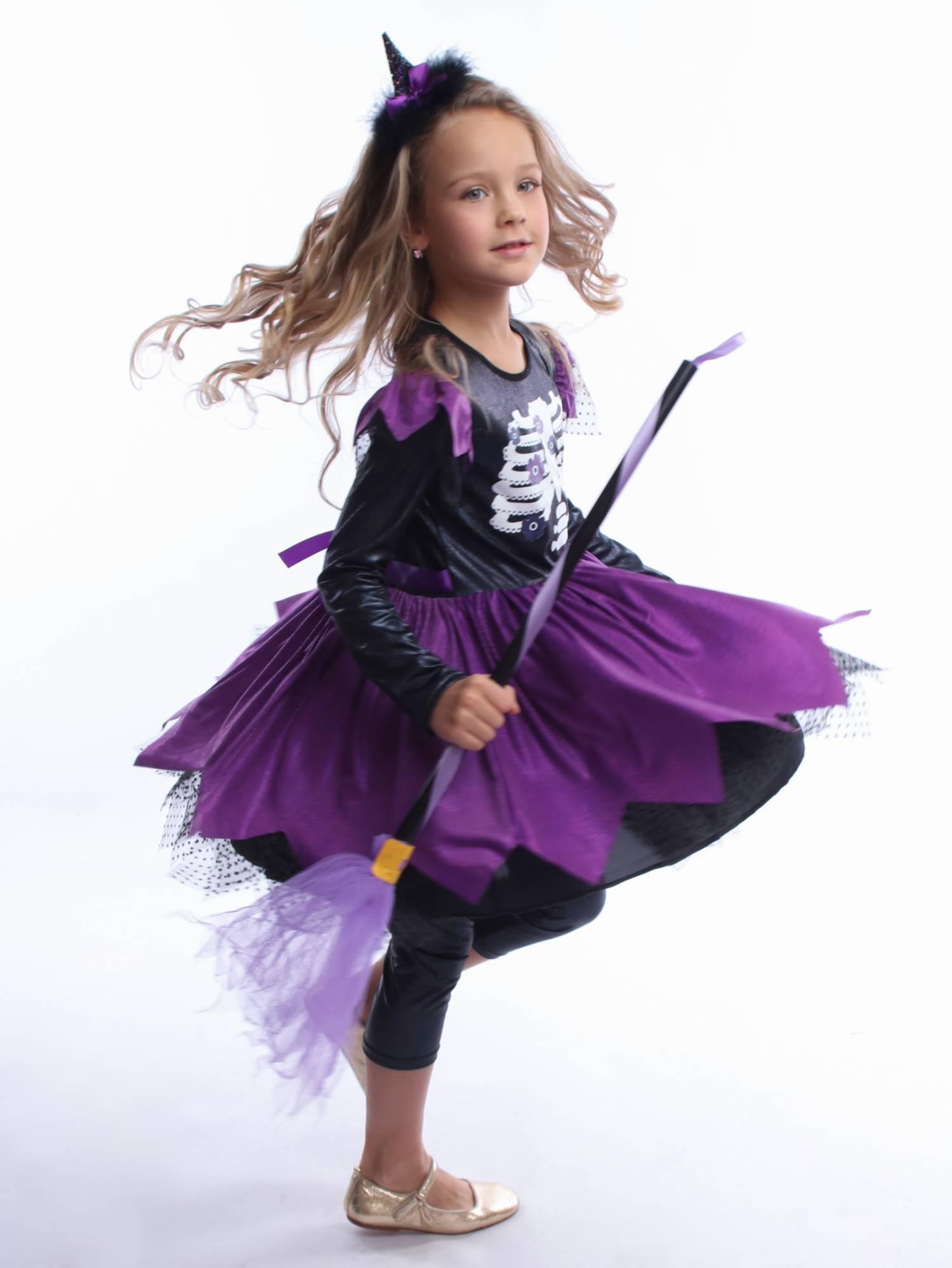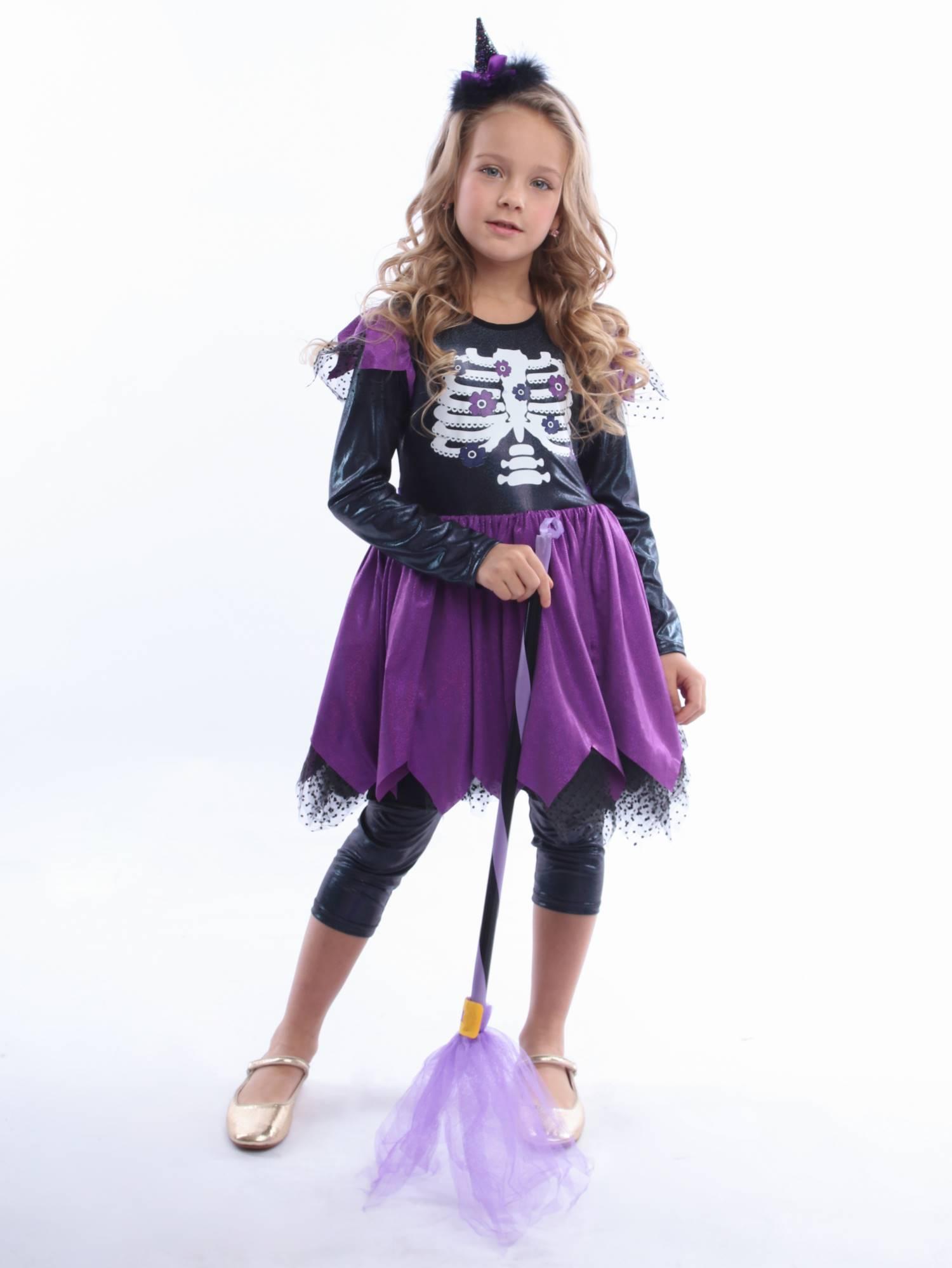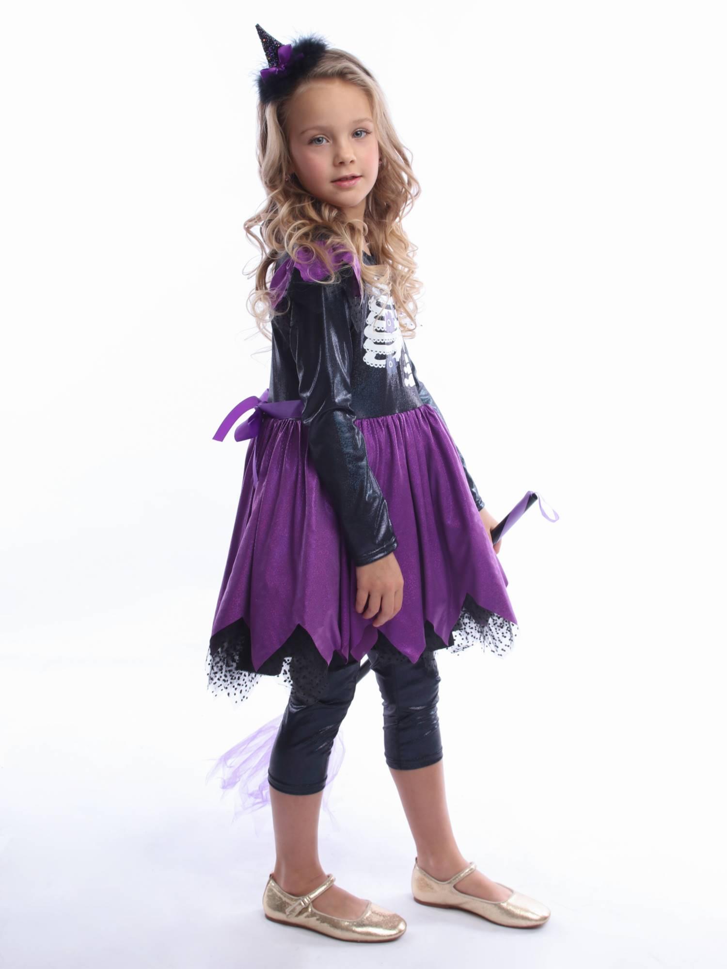 Костюм Ведьмы Виола с метлой детский на Хэллоуин и тематические праздники. В комплект входит платье, леггинсы, ободок и метла. Платье с длинным рукавом и рисунком в виде скелета. Ободок украшен небольшим колпачком. Леггинсы блестящие.