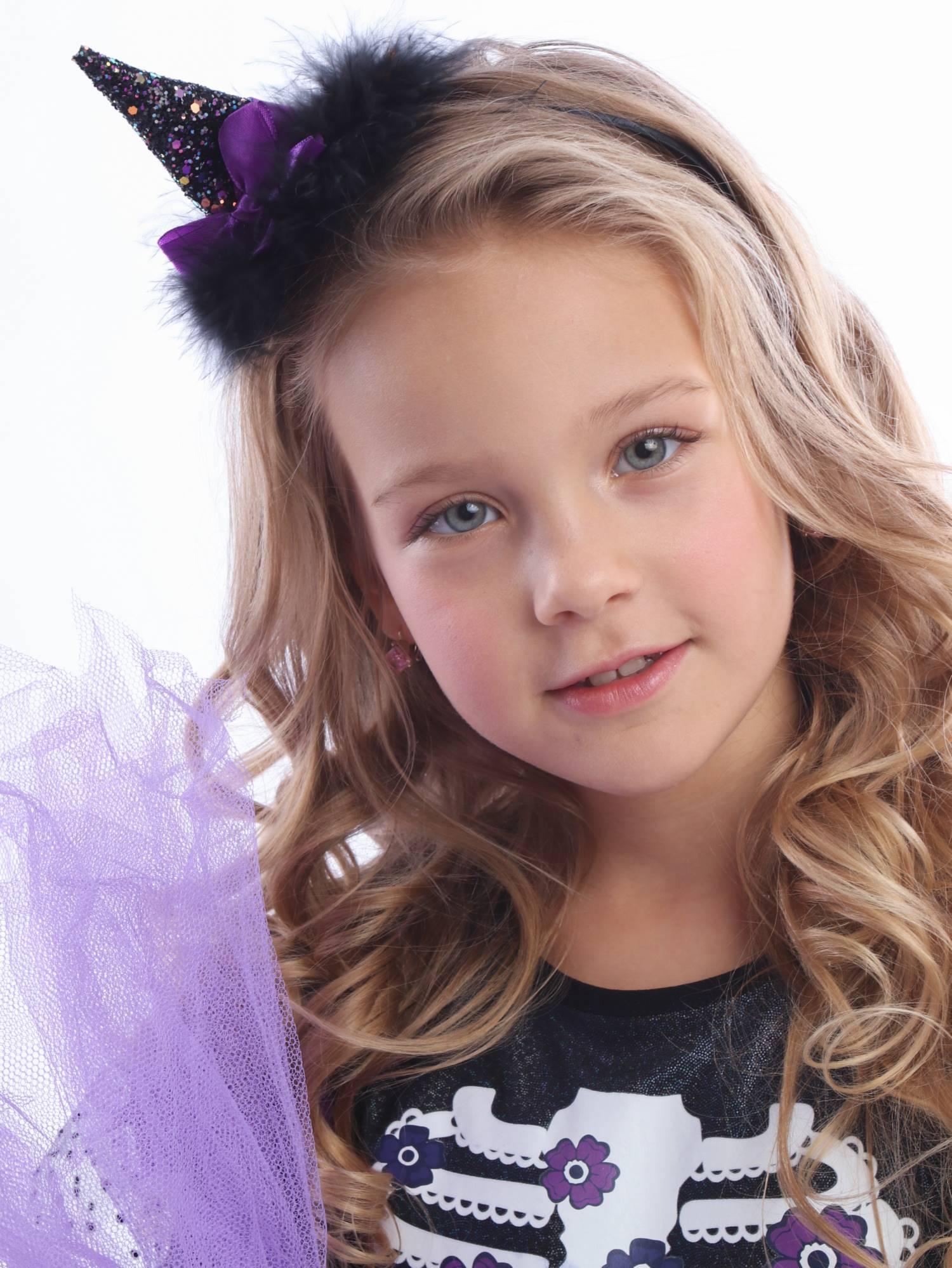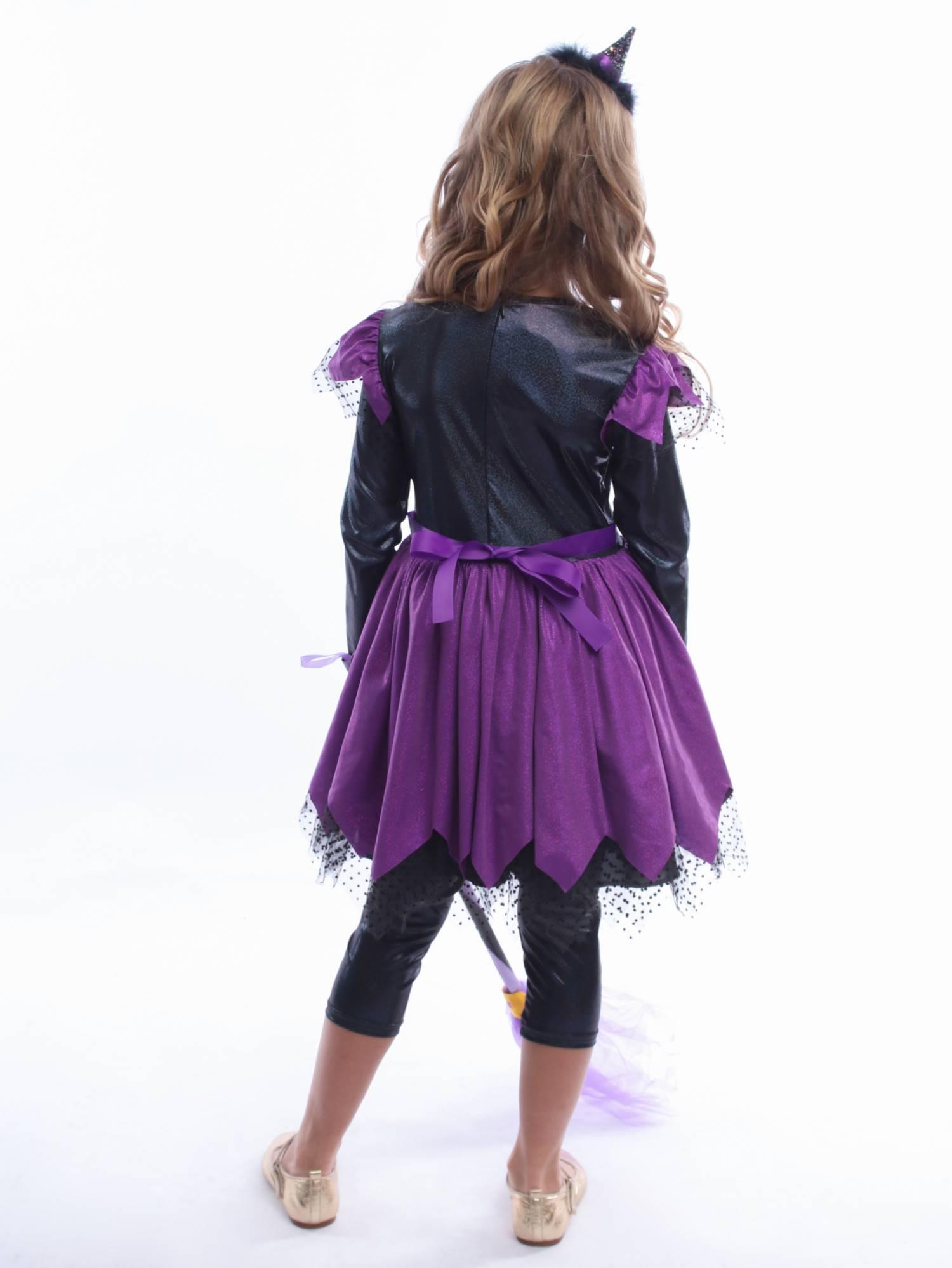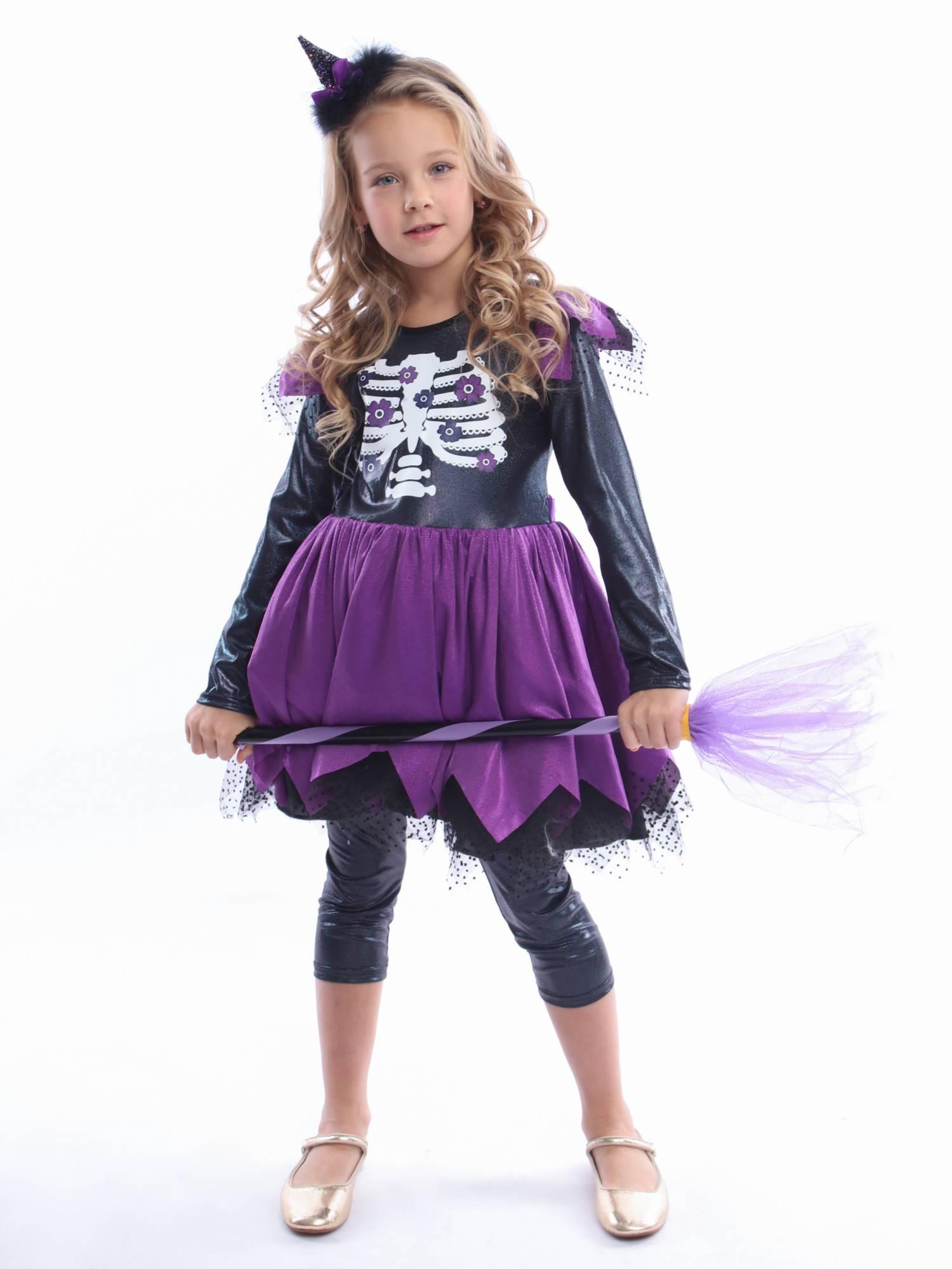Костюм Ведьмы Виола с метлой детский на Хэллоуин и тематические праздники. В комплект входит платье, леггинсы, ободок и метла. Платье с длинным рукавом и рисунком в виде скелета. Ободок украшен небольшим колпачком. Леггинсы блестящие.