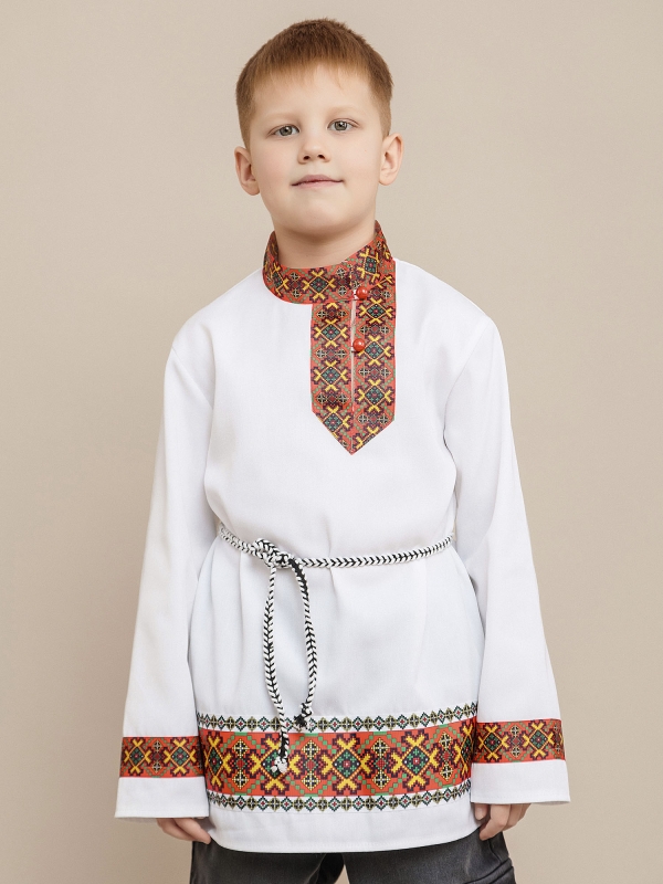 В комплекте белая рубаха с национальным орнаментом – свободный крой для комфорта, украшена красочной вышивкой в народном стиле. Пояс дополняет образ, подчеркивая традиционный колорит.