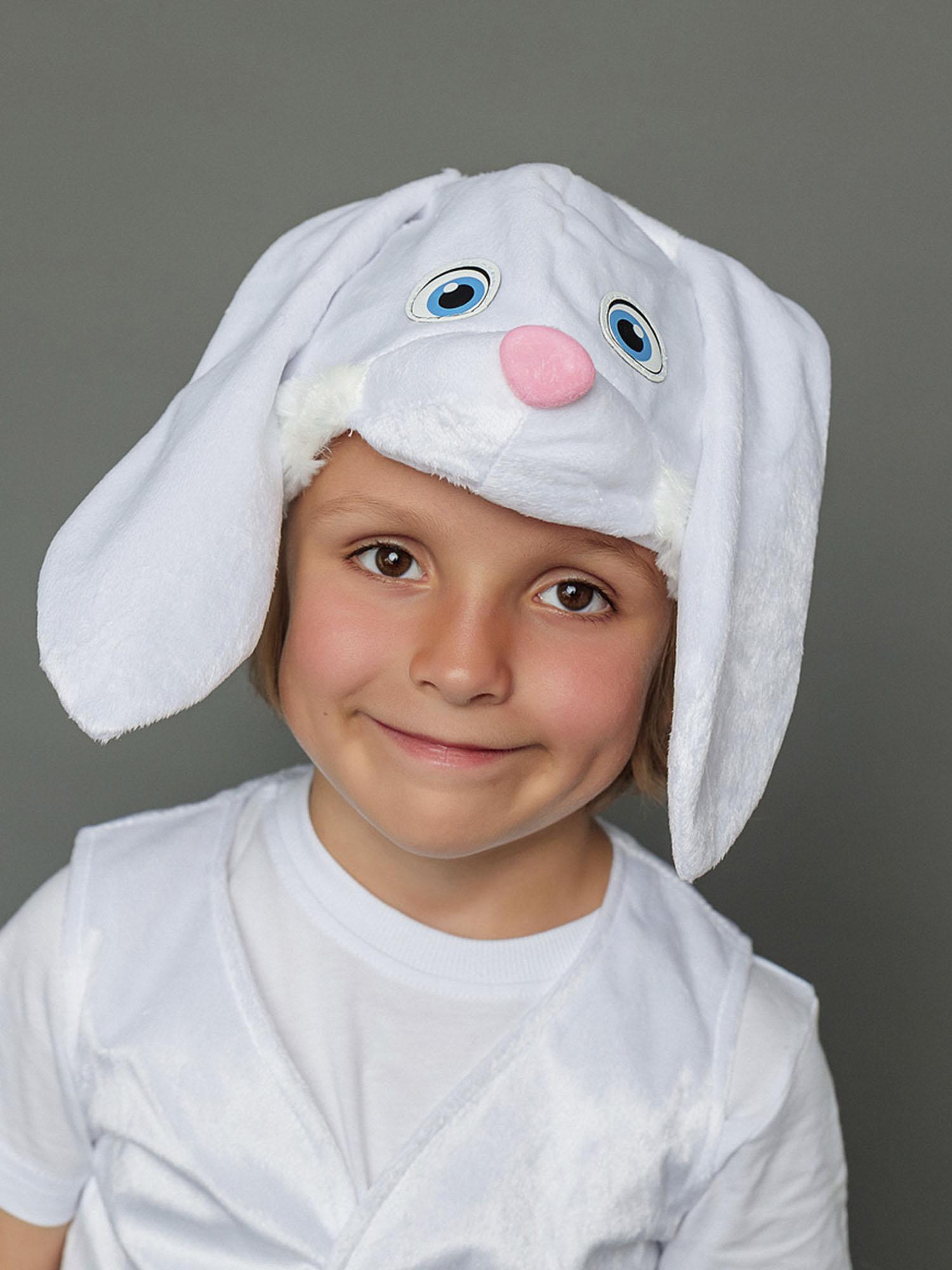 - Маска-шапка белого цвета с длинными ушками, глазками и носиком