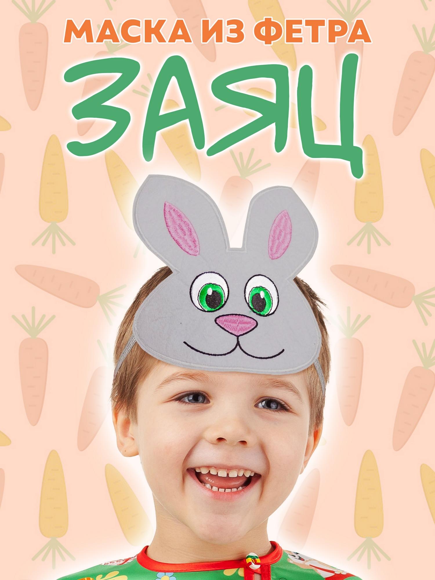 Маска карнавальная из фетра Заяц на резинке. Фетровая маска надевается на голову и имеет универсальный размер для девочек и мальчиков от 3 лет. Эластичная мягкая резинка крепко пришита с изнаночной стороны. Комфортно садится, не мешает и не тянет. Фетр - нетканый материал войлочного типа отлично держит форму и не мнется.