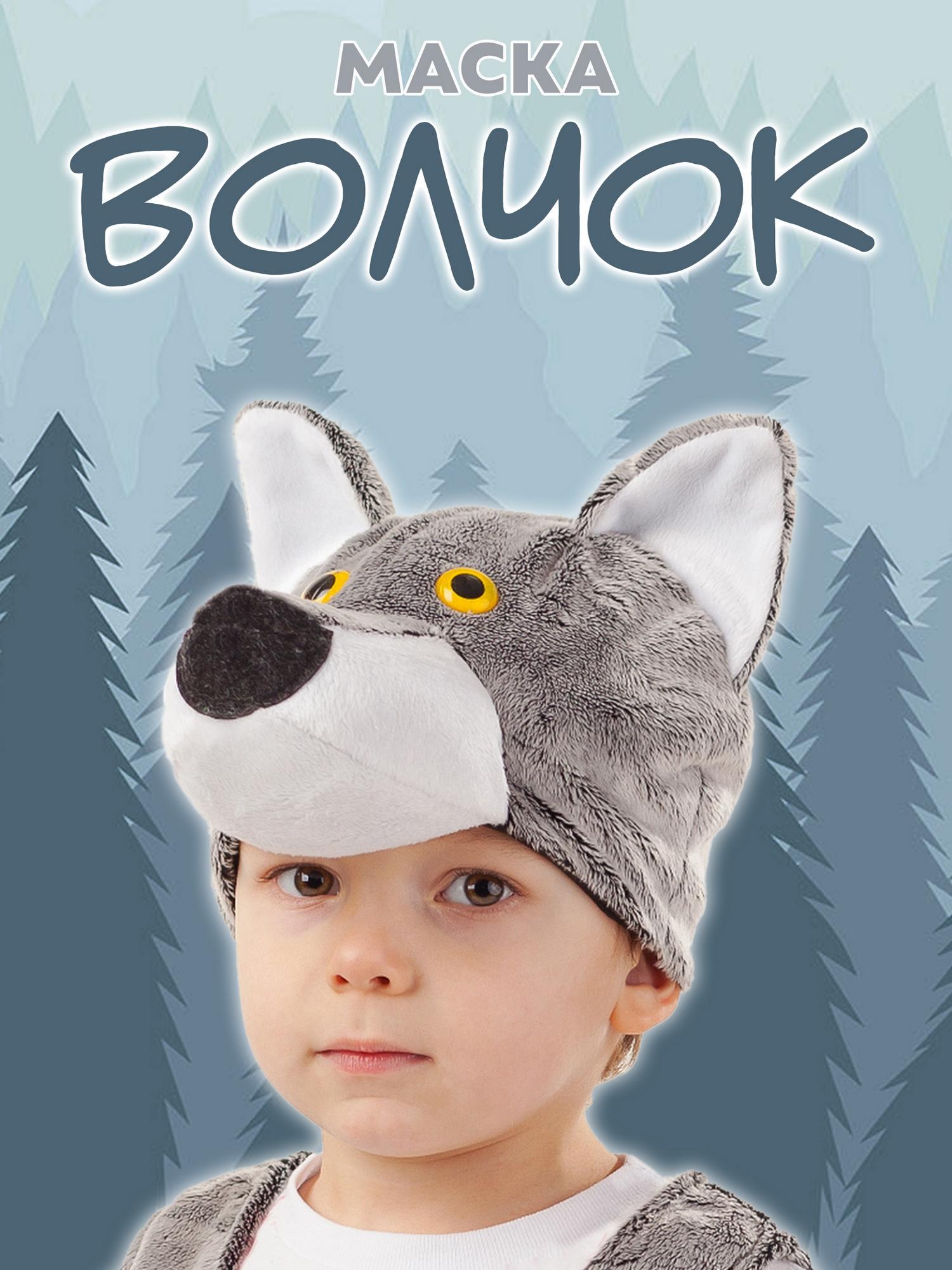 Маска Волка карнавальная в виде шапки. Удобно надевать и носить, шапка не сползает и хорошо держится на голове. Выполнена в сером цвете, украшена ушками, носиком и глазками волка.