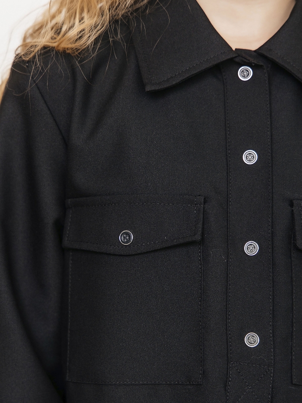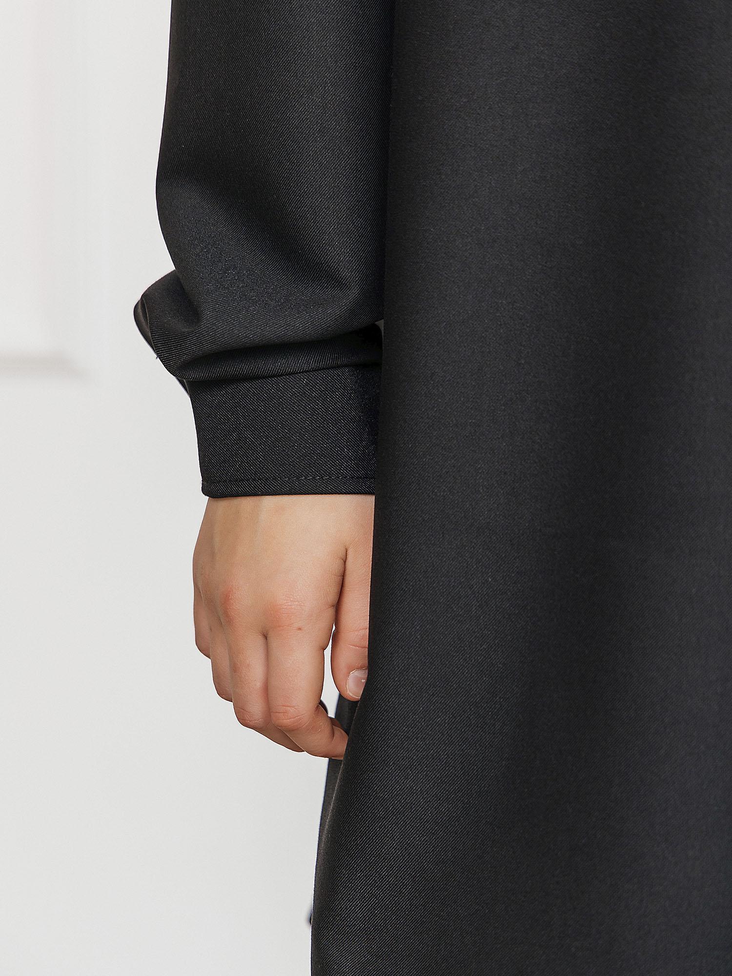 Стильное платье-рубашка в насыщенном черном цвете. Классический крой рубашки с длинными рукавами на манжетах. Удобная застёжка на кнопках — практичность в носке и лаконичный дизайн. Функциональные накладные карманы — можно удобно разместить мелочи. Декоративные элементы — кокетка сзади и встречная складка добавляют объём и динамику силуэту. Качественная костюмная ткань — хорошо держит форму, не мнётся, приятна к телу. Платье легко комбинируется с поясом для подчёркнутой талии или носится свободным силуэтом.