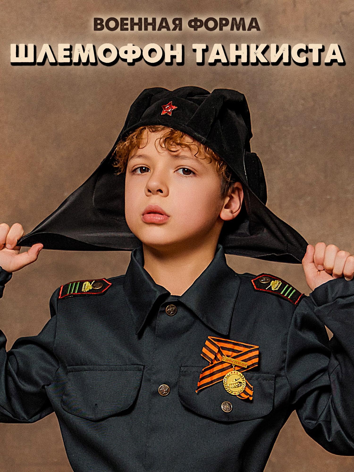 Шлемофон танкиста детский - головной убор танкистов, защищающий голову и уши от шума. Шлемофон советского танкиста будет пользоваться успехом к праздника 9 мая, 23 февраля и дню Танкиста. Расцветка черная, спереди красный значок с советской символикой. По бокам (в зоне ушей) два декоративных наушника, застегивается шлемофон под подбородком.