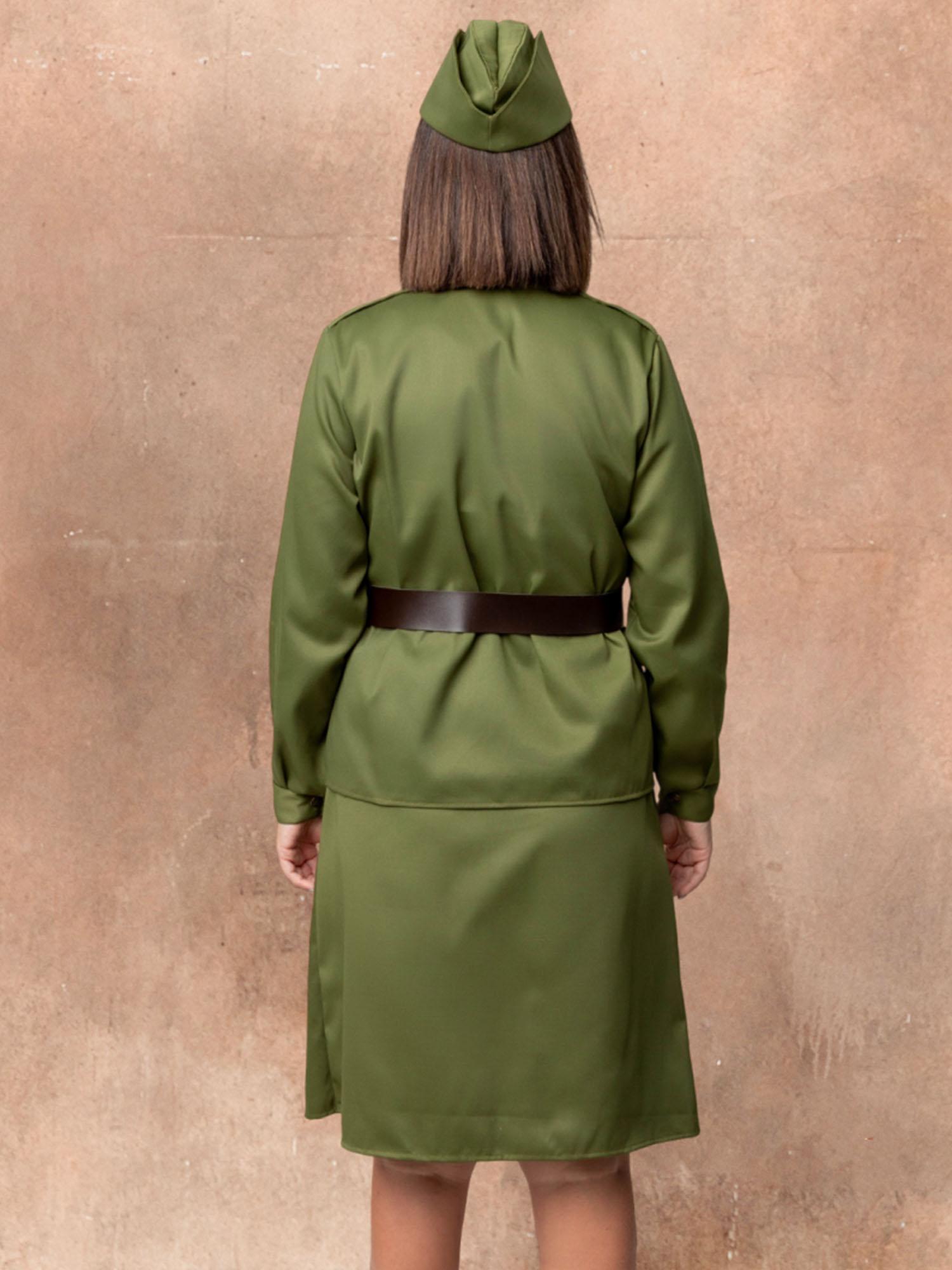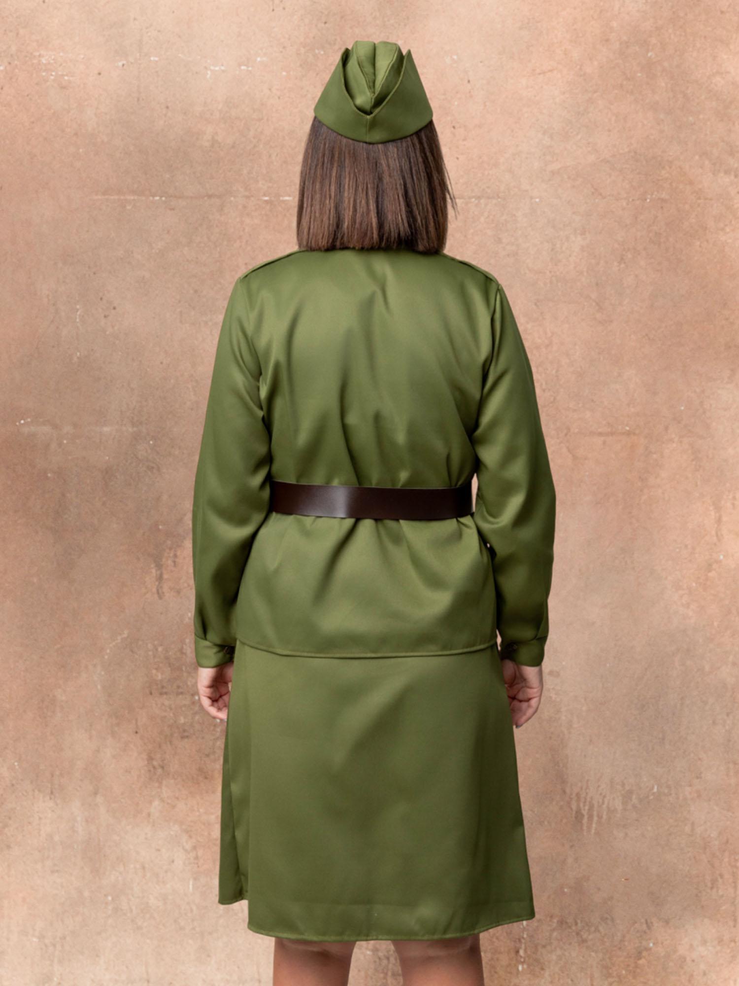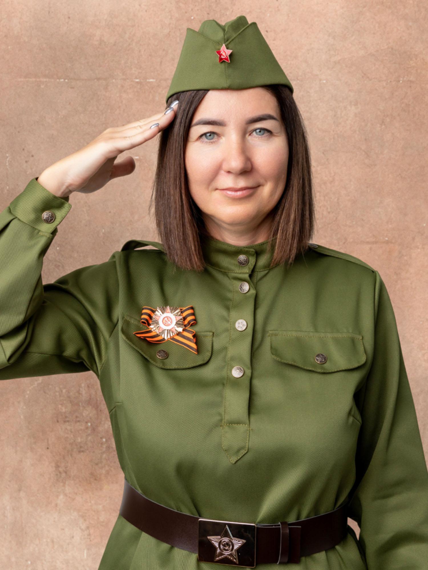 Костюм Солдатки женский – стилизованный под советскую военную форму образ на 9 мая. Костюм Солдатки взрослый подойдет для выступлений, шествий Бессмертного полка, спектаклей и других мероприятий. Комплект костюма состоит из гимнастерки, юбки, ремня, пилотки, значка и георгиевской ленточки.