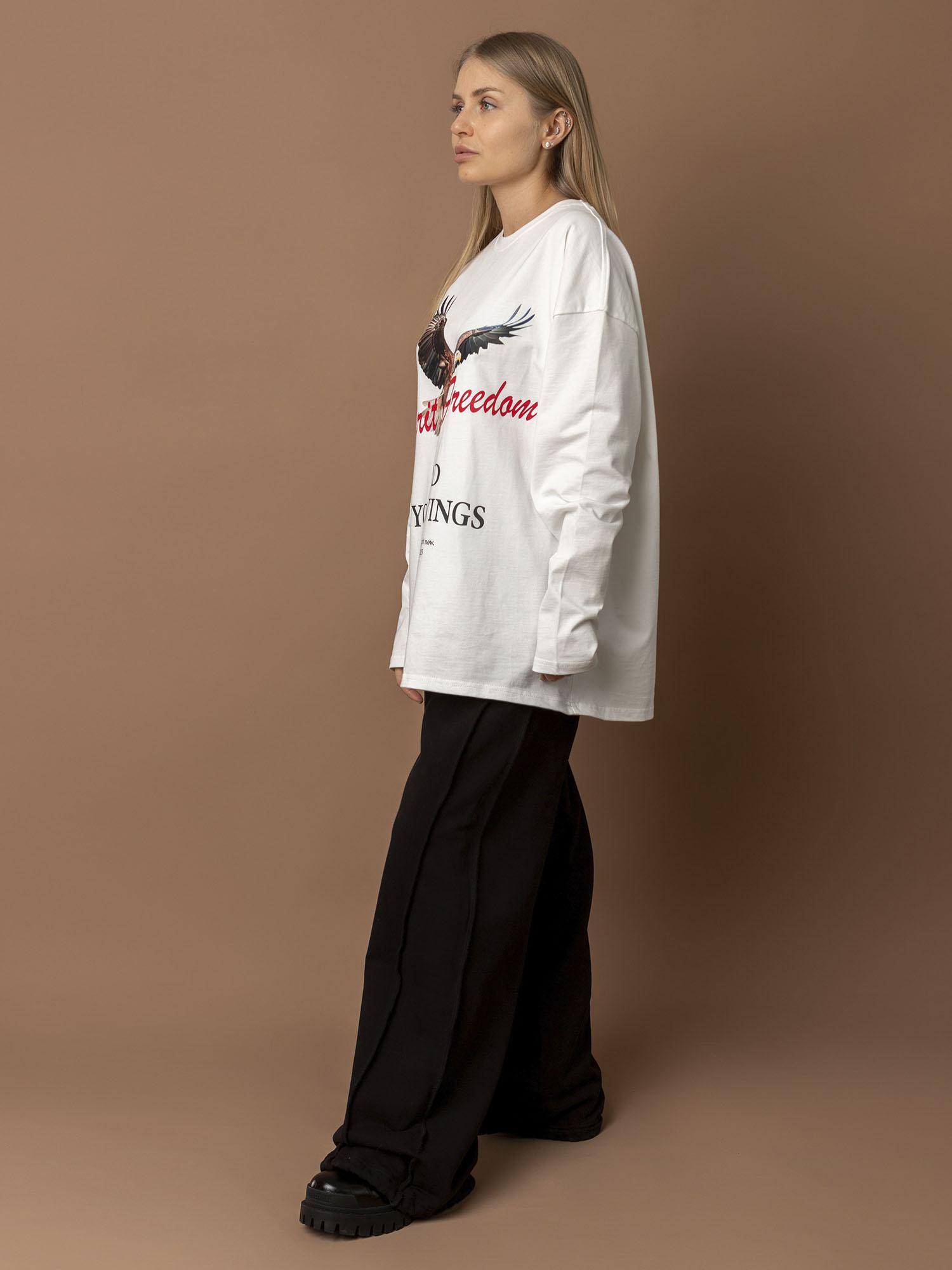 Свитшот (джемпер) из футера 2-х нитки (95% хлопок, 5% эластан). Мягкий и эластичный материал приятно прилегает к телу, хорошо держит форму и обеспечивает комфорт в течение всего дня. Универсальная модель для повседневной носки. Цвет — молочный.