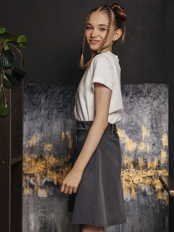 Школьная юбка-шорты серого цвета. Умная конструкция с регулируемыми хлястиками по бокам – можно точно подогнать по фигуре. Аккуратные складки спереди создают элегантный объем и свободу движений. Практичные боковые карманы – удобно хранить необходимые мелочи. Скрытая застежка-гульфик обеспечивает аккуратный внешний вид. Необработанный нижний срез придает изделию стиля и оригинальности. Качественная костюмная ткань – держит форму, не мнется, выглядит опрятно. Универсальный серый цвет – сочетается с любыми блузами и водолазками.